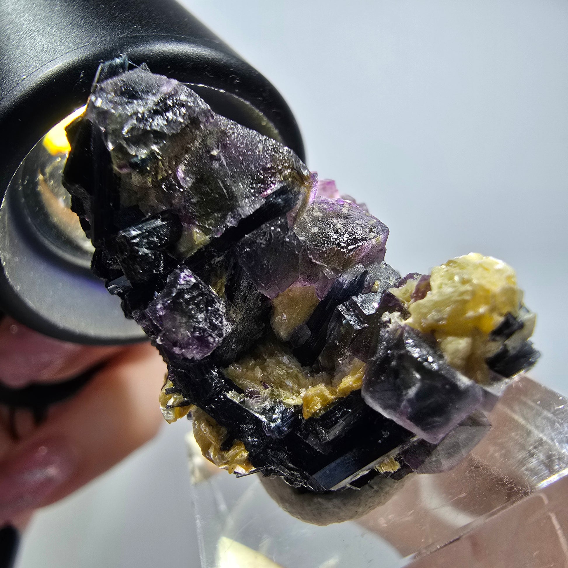 Schöne Mineralienstufe mit bunten **Phantom Fluorit** Würfeln in Grün, Lila, Braun, Gelb und Transparent, kombiniert mit **Schörl Turmalin**, **Muskovit** und **Hyalit** aus dem Erongo, Namibia.