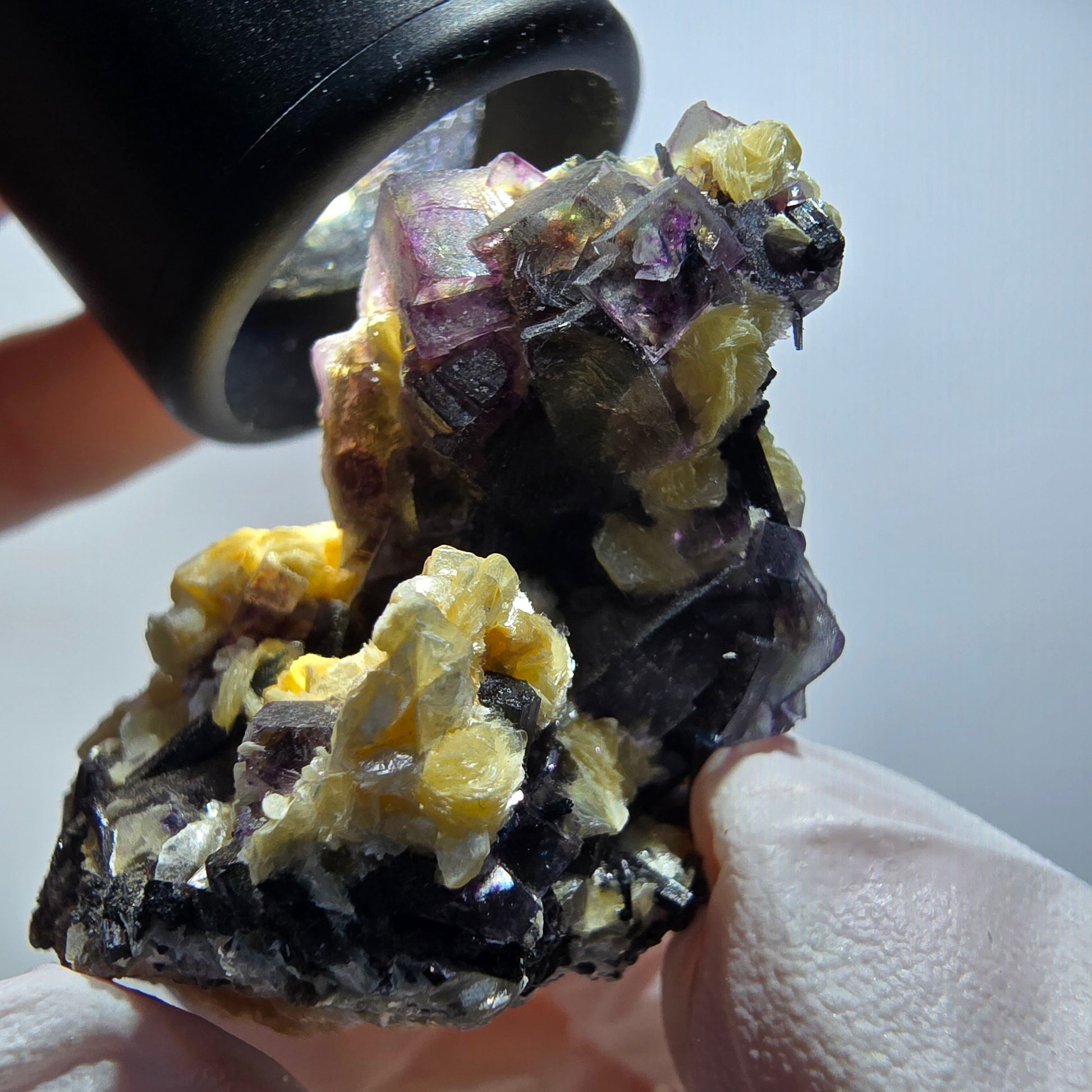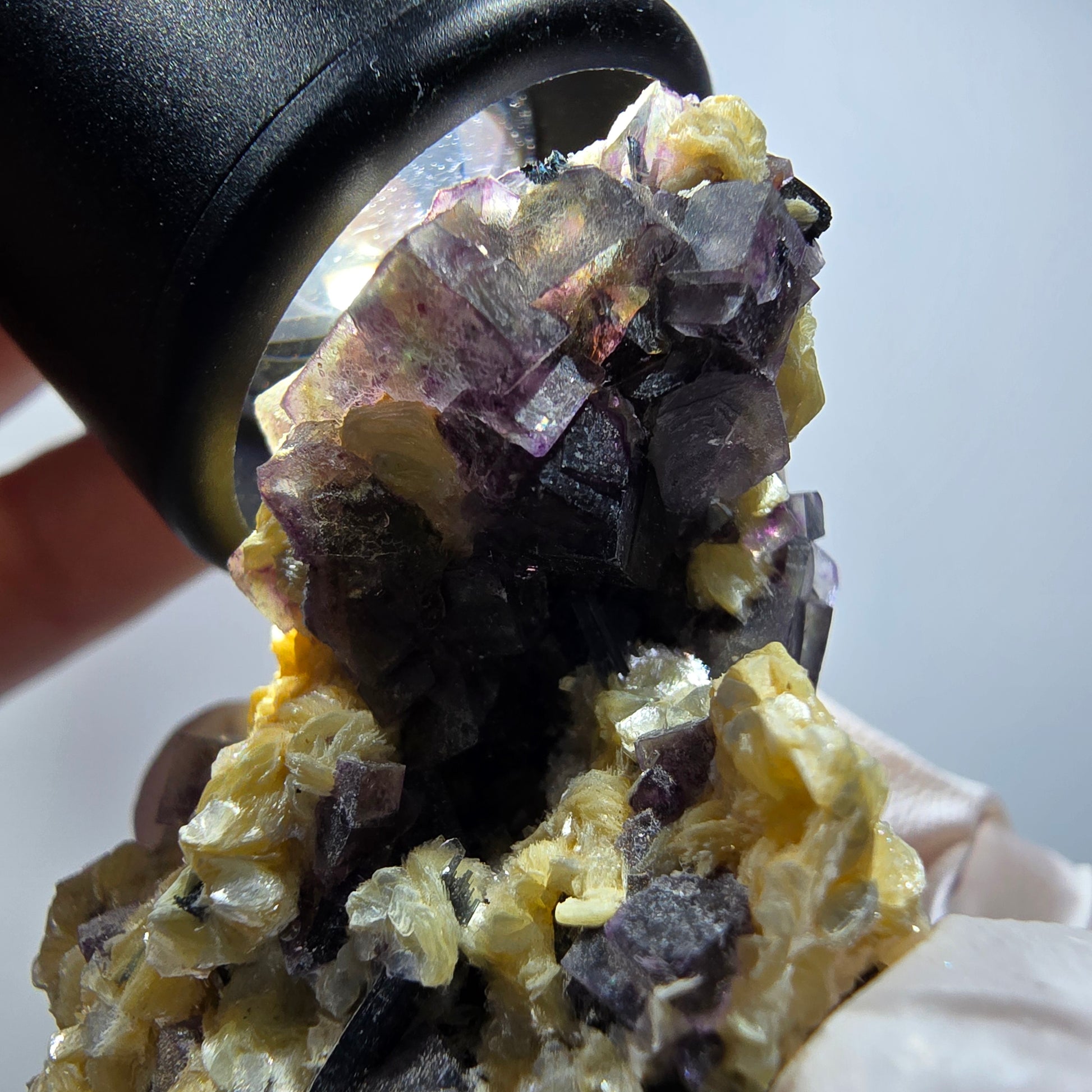 Entdecken Sie diese schöne Mineralienstufe mit bunten **Phantom Fluorit** Würfeln in Grün, Lila, Braun, Gelb und Transparent, **Schörl Turmalin** und **Muskovit** aus dem Erongo, Namibia.