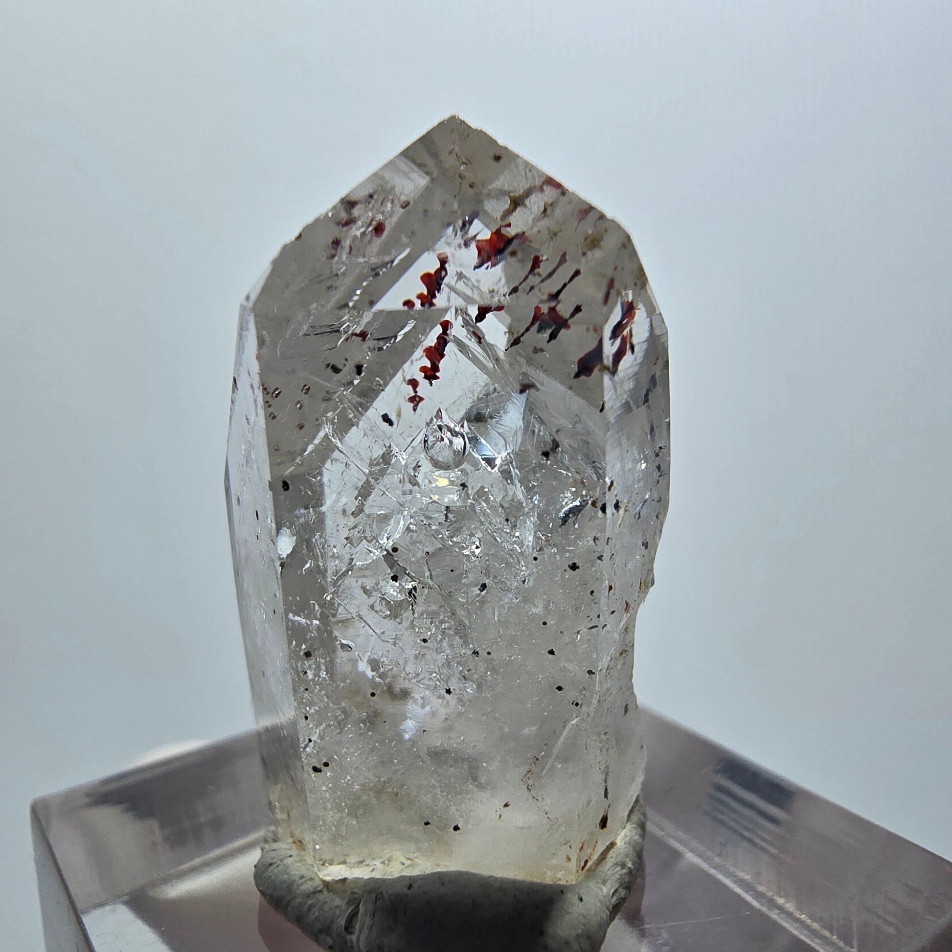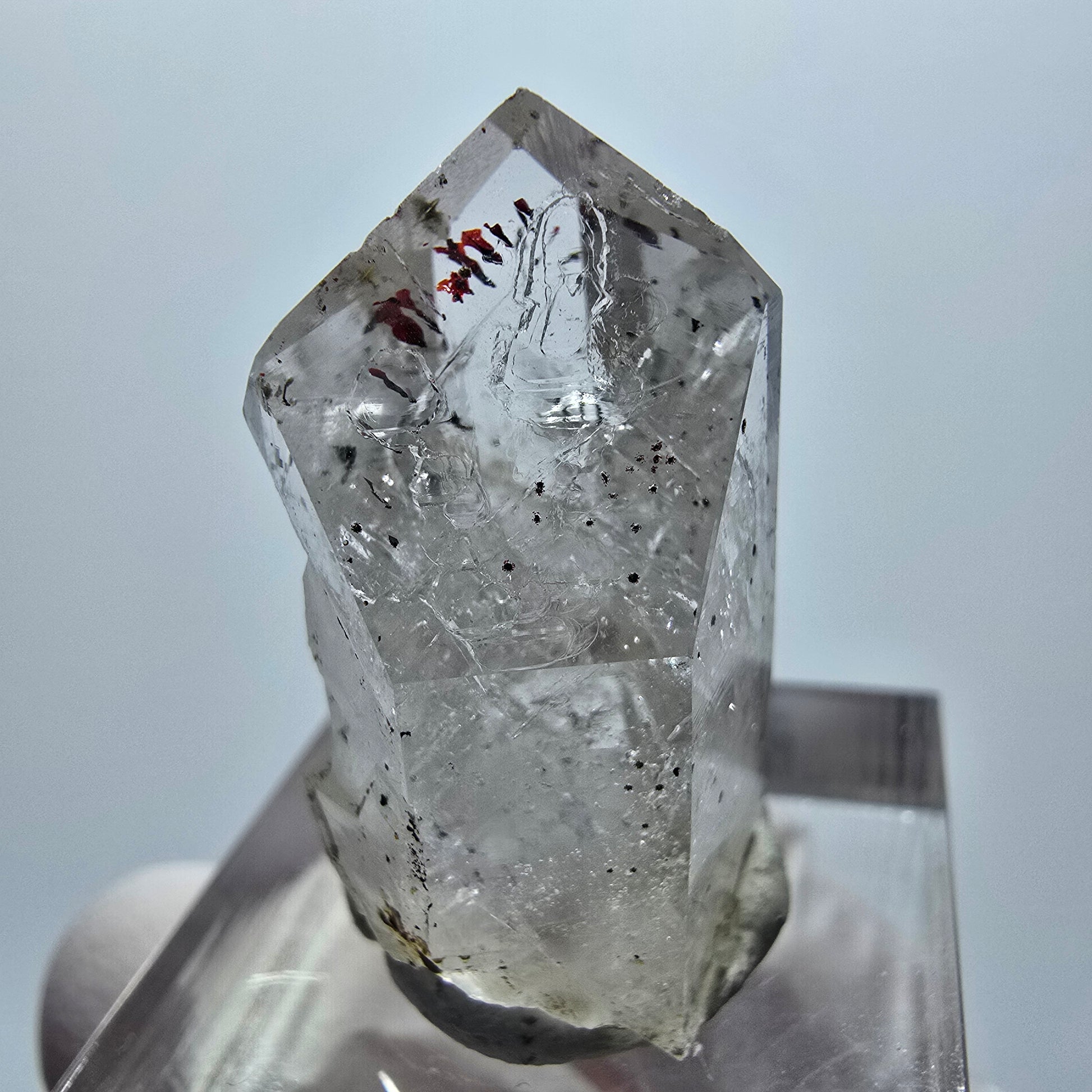 - Besonderheiten: Bewegliche Luftblase, rote Hämatit-Einschlüsse, Lemurian Quarz Querrillen