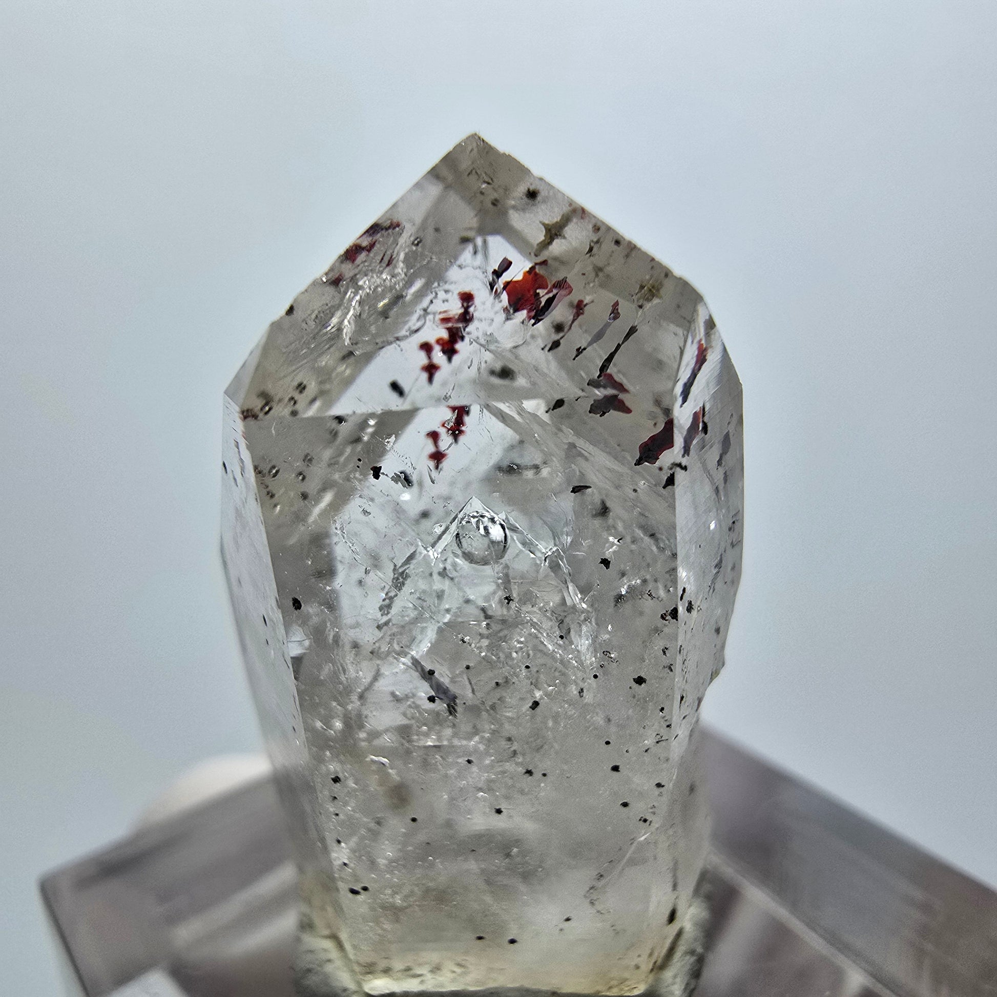 Dieser seltene klare, weiß-transparente Phantom Amethyst zeigt wunderschöne Phantome und rote Hämatit-Einschlüsse. Besonders faszinierend ist die bewegliche Luftblase als Enhydro-Einschluss, eingebettet in eine Kristallspitze mit Lemurian-typischen horizontalen Querrillen.