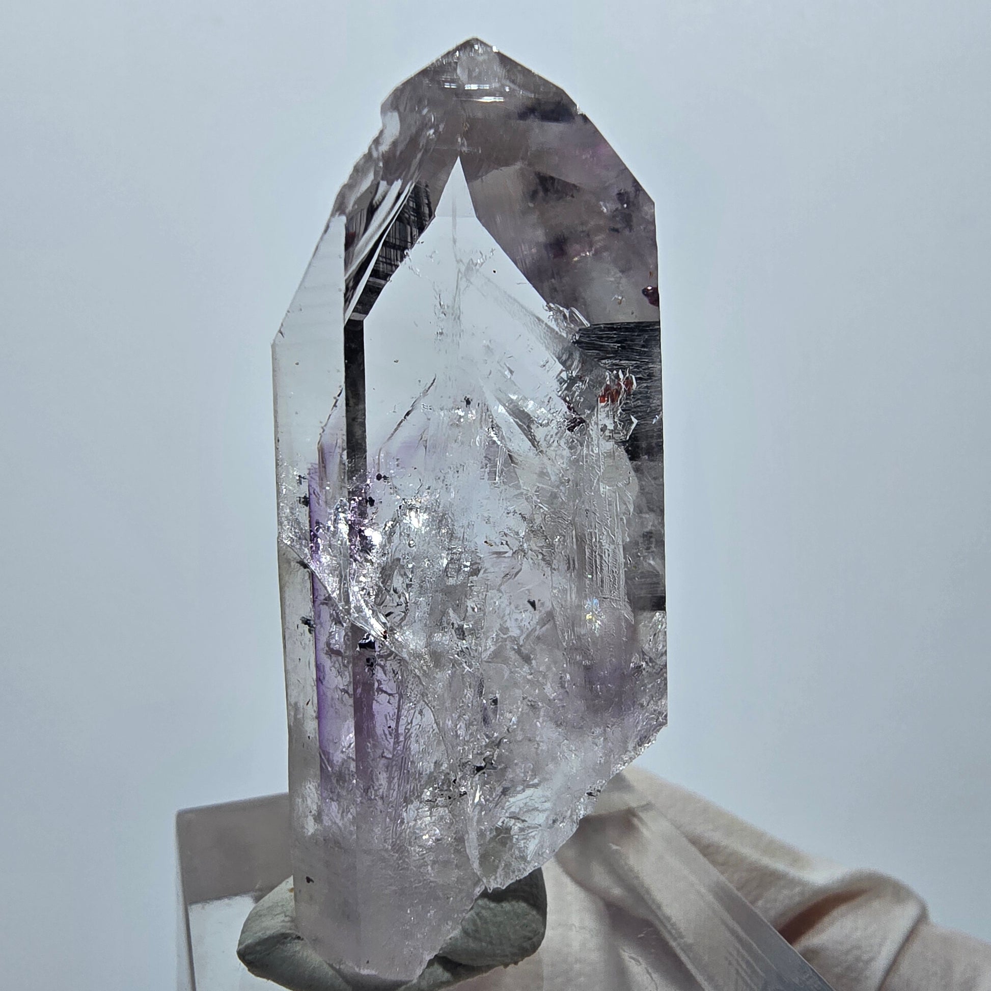 Dieser außergewöhnliche Phantom Amethyst stammt aus der berühmten Streep Mine in Goboboseb, Namibia und besticht durch seine seltene Kombination von klarer, lila-weiß transparenter Kristallstruktur mit wunderschönen inneren Phantomen. Das Besondere: Der Kristall beherbergt rote Hämatit-Einschlüsse und einen faszinierenden Enhydro-Einschluss mit einer beweglichen Luftblase – ein echtes Sammlerstück für Mineralienliebhaber.