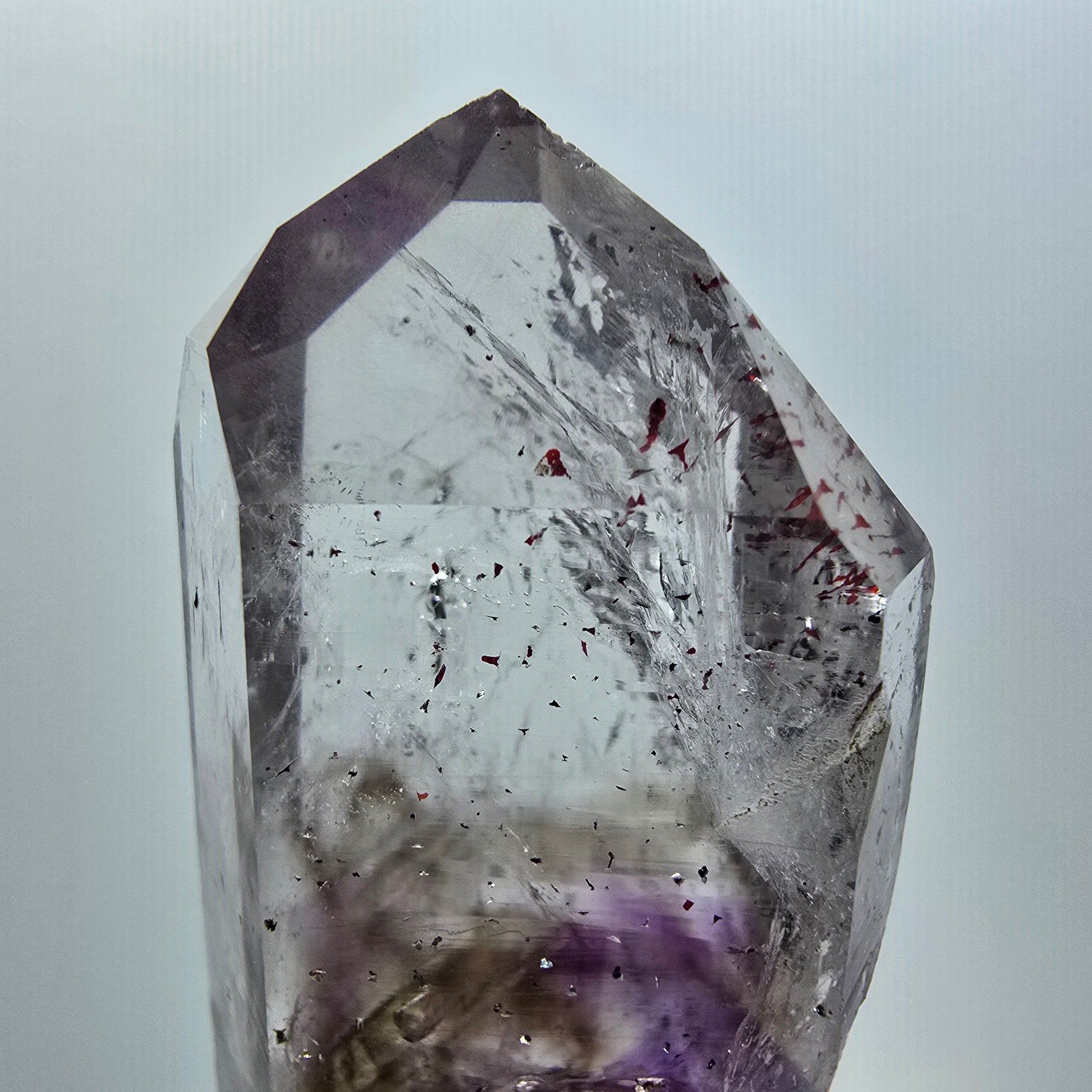 Er strahlt durch klare lila-weiße Transparenz mit inneren lila Phantomen, zepterförmiger Form, roten nadelförmigen Hämatit-Einschlüssen und einem faszinierenden **Enhydro-Einschluss** mit beweglicher Luftblase.