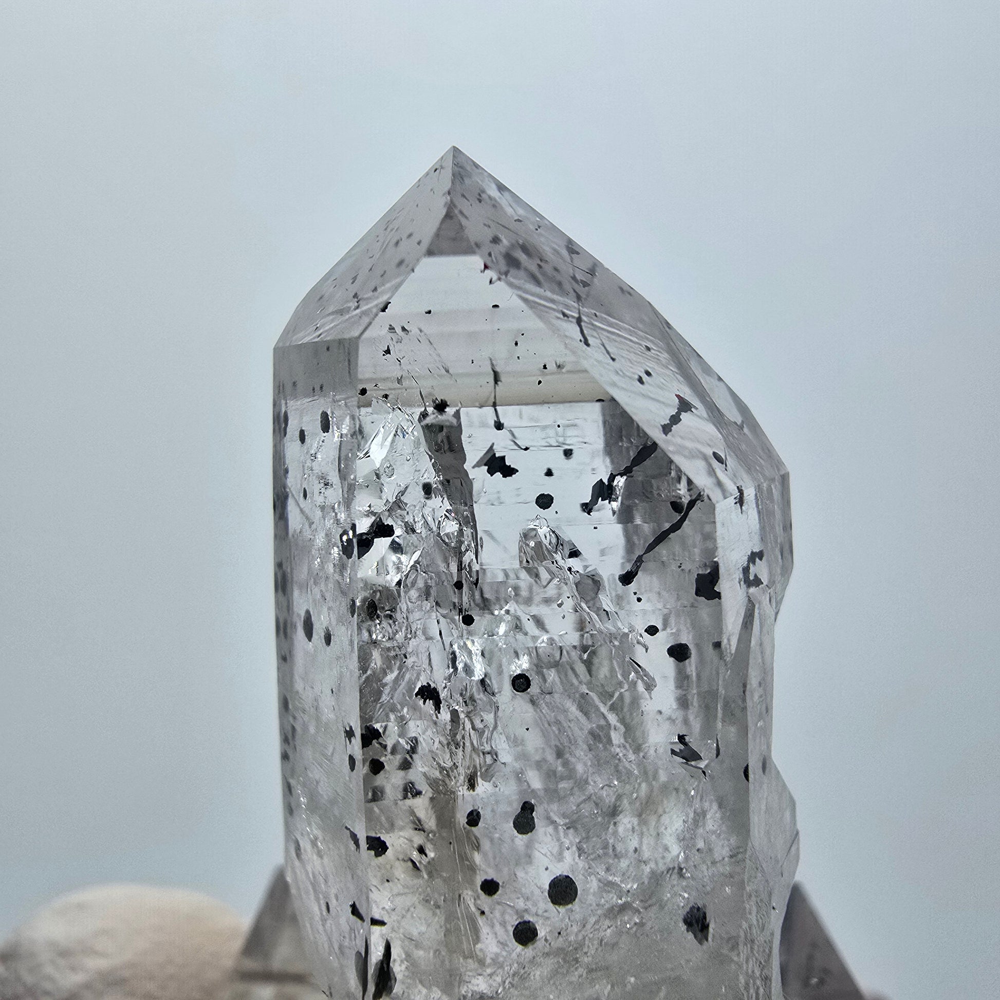 Enhydro Harlekin Phantom Quarz – eine seltene Phantom-Quarz Kristallspitze mit vier beweglichen Luftblasen und faszinierenden roten sowie schwarzen nadelförmigen Hämatit Einschlüssen. Dieser außergewöhnliche Fund aus der Streep Mine in Goboboseb, Namibia, besticht durch seine klare, weiß-transparente Beschaffenheit und die mystischen Phantome im Kristallinneren. Die vier Enhydro-Einschlüsse mit jeweils einer beweglichen Blase machen dieses Stück zu einem echten Sammlerobjekt. Ein faszinierendes Naturwunder für Mineralienliebhaber und Sammler.