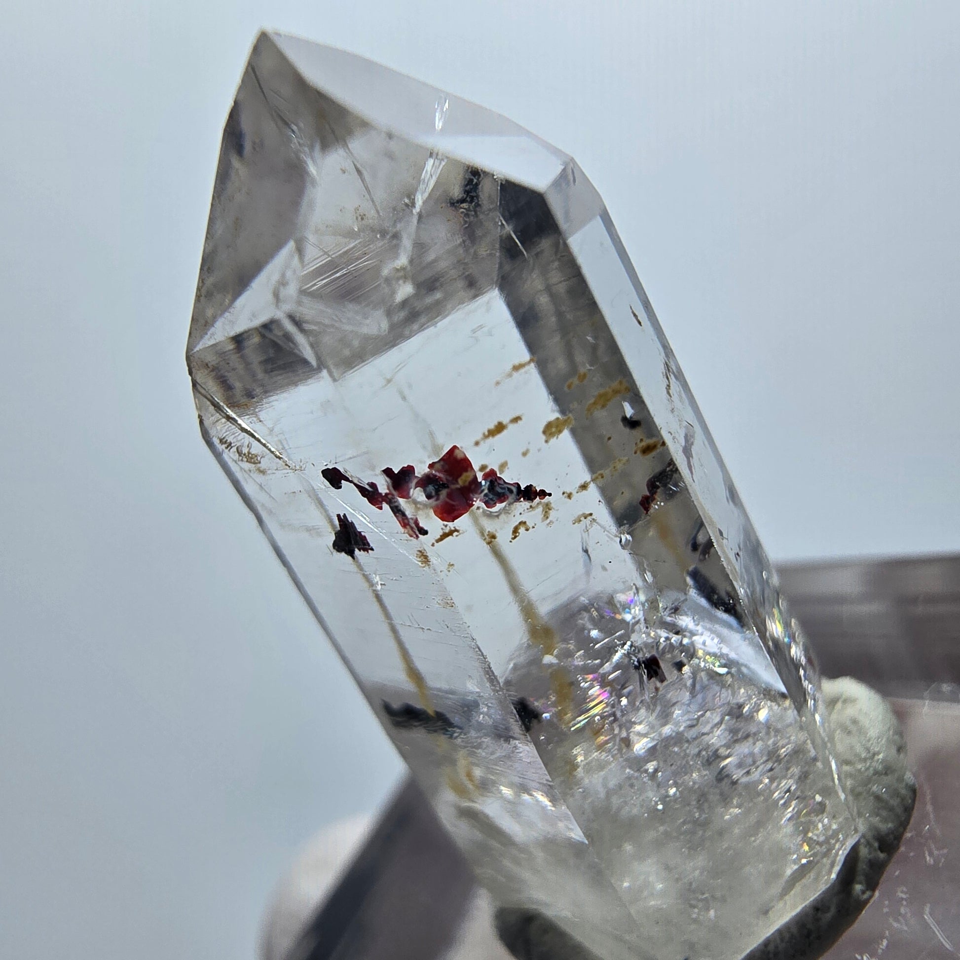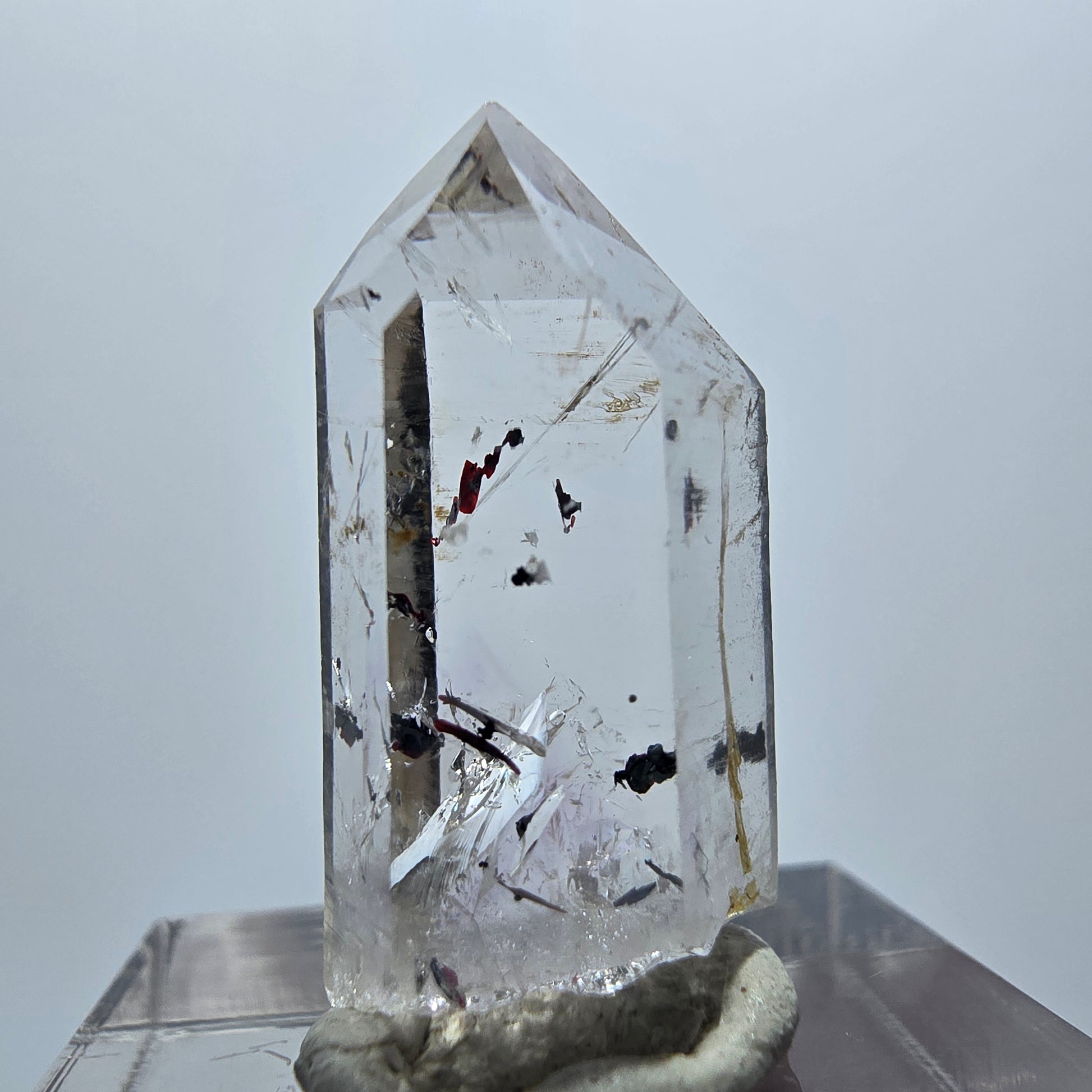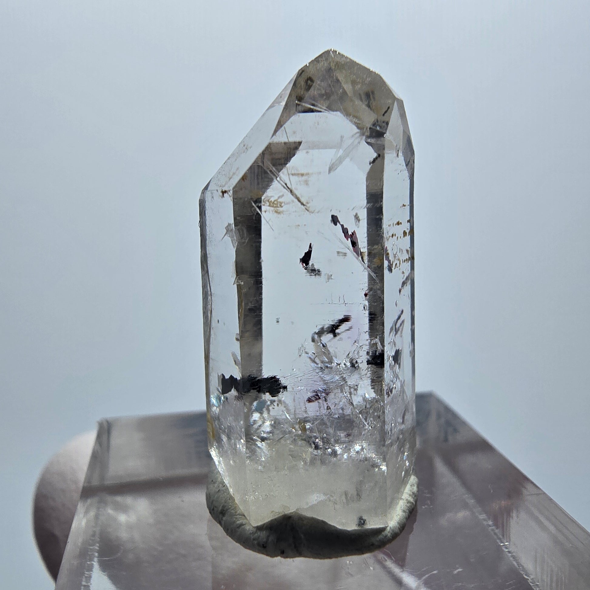 Der Kristall misst 26 x 13 x 10 mm, wiegt 5,4 g und ist ein außergewöhnliches Sammlerstück aufgrund seiner klaren Struktur und der vielfältigen mineralischen Einschlüsse.