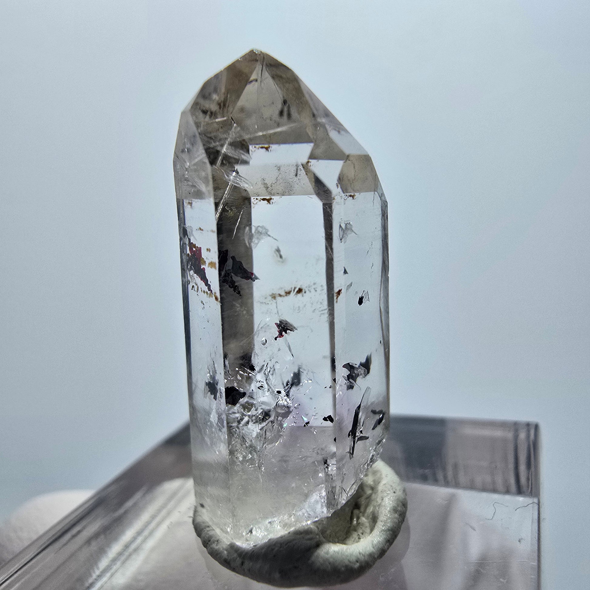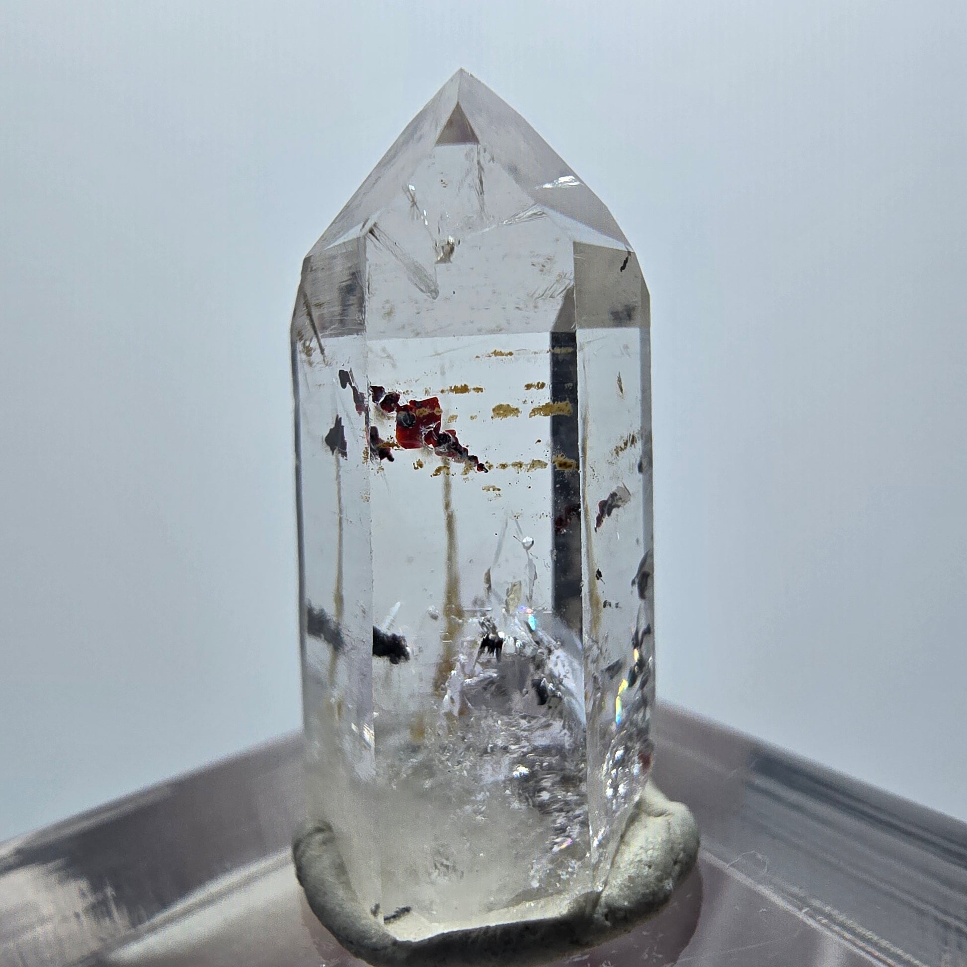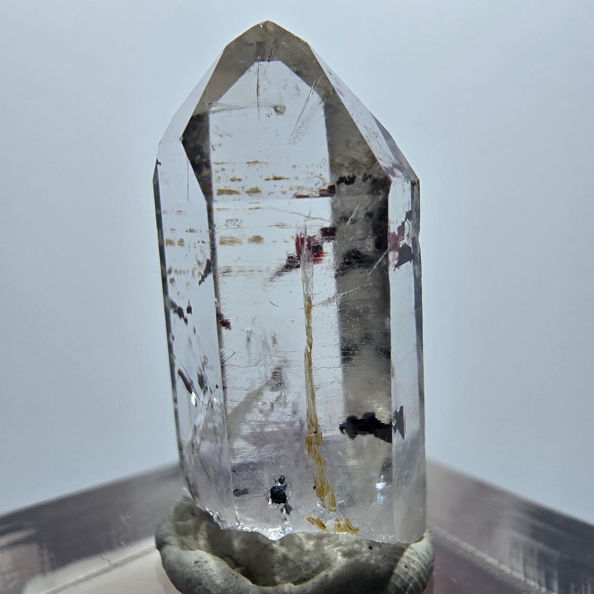 Der Kristall misst 26 x 13 x 10 mm, wiegt 5,4 g und ist ein außergewöhnliches Sammlerstück aufgrund seiner klaren Struktur und der vielfältigen mineralischen Einschlüsse.