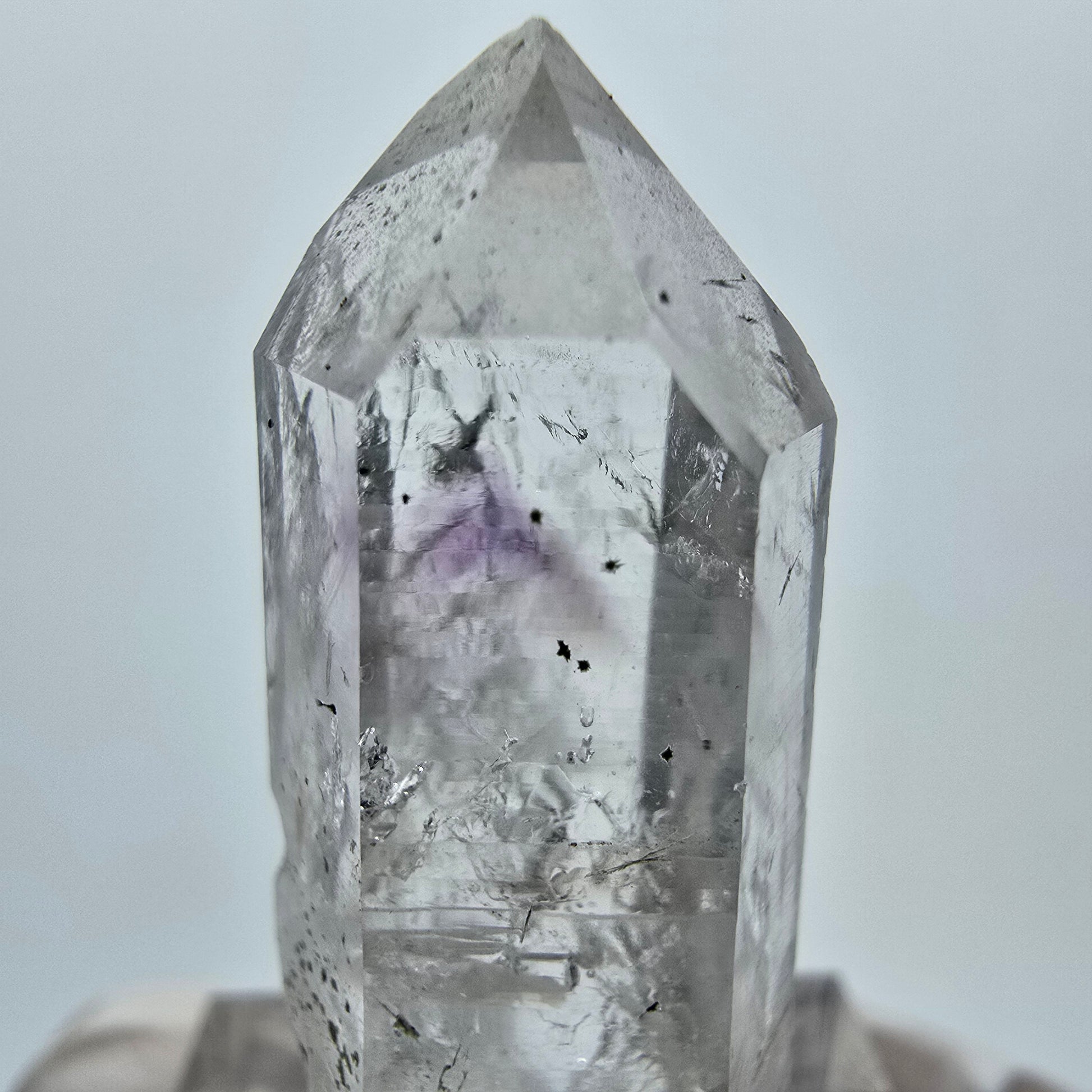- Besonderheiten: Klare, lila-weiß-transparente Kristallspitze, Phantome, Enhydro mit beweglicher Luftblase, grüne Epidot-Einschlüsse, horizontale Querrillen