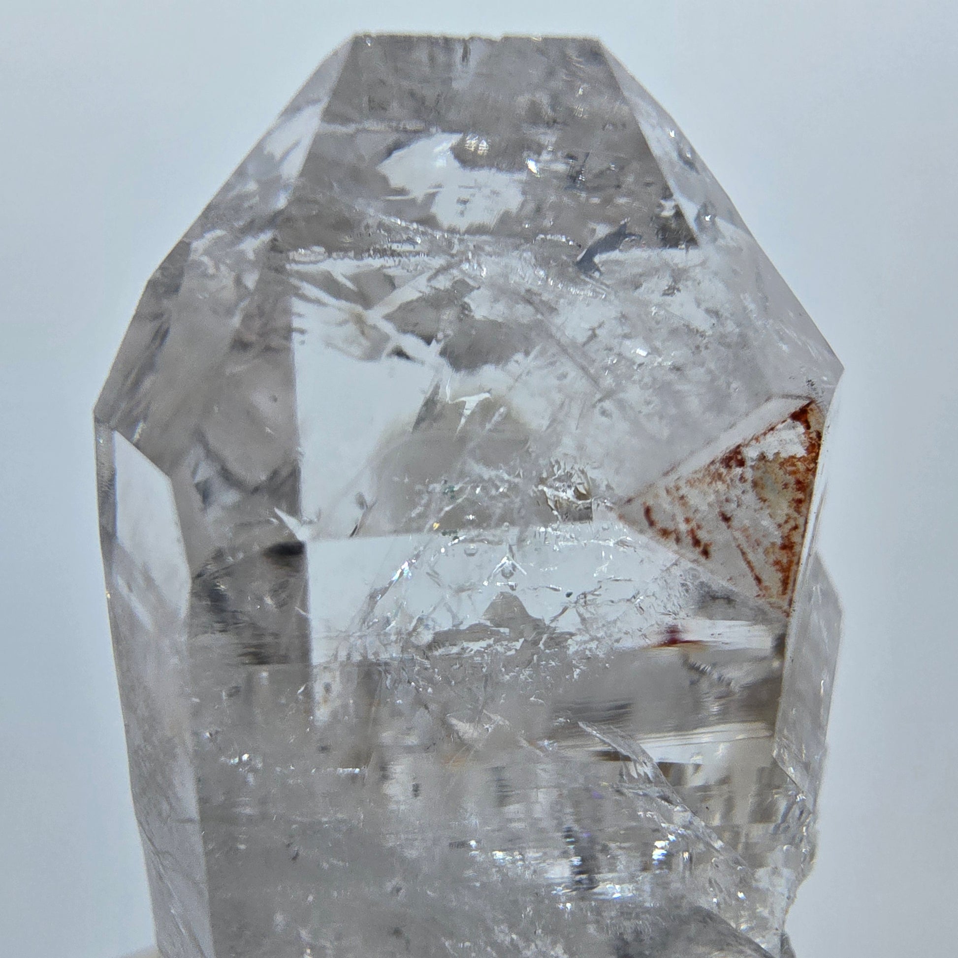Der Enhydro Lemurian Phantom Quarz ist eine selten klare, weiß-transparente Kristallspitze mit inneren Phantomen und einer beweglichen Enhydro-Luftblase. Die Lemurian-typischen, horizontal gewachsenen Querrillen an der Oberfläche machen dieses Stück aus der Streep Mine in Goboboseb, Namibia besonders attraktiv.