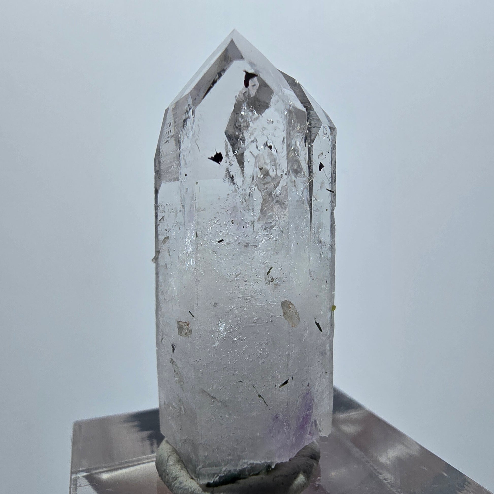 Die Spitze zeigt typische horizontale Querrillen an einigen Seiten – ein Merkmal von Lemurian Quarz – und besticht durch ihre Transparenz und die sichtbaren Wachstumszonen. Die Kombination aus Amethyst, Hämatit, Epidot und Enhydro ist äußerst selten und macht diesen Kristall zu einem besonderen Sammlerstück.