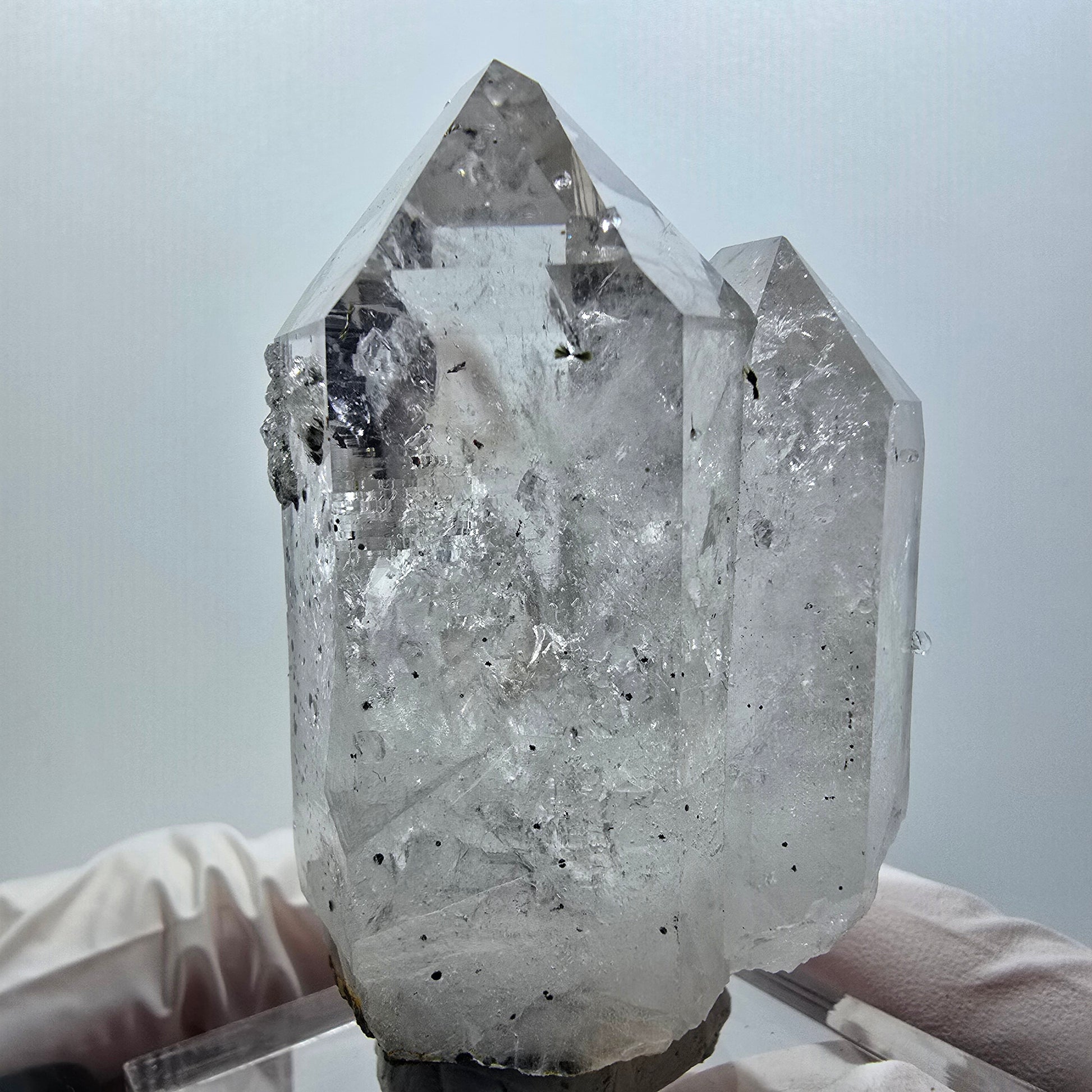 Entdecken Sie diesen seltenen Enhydro Phantom Rauchquarz mit Analcim aus der Streep Mine Gobo, Namibia. Seltene zusammengewachsene Phantom Rauchquarz-Kristallspitzen mit klarer weiß-transparente Kristallbildung, braunen Phantomen, sternförmigen Epidot- und schwarzen Hämatit-Einschlüssen sowie einem besonders großen Enhydro-Einschluss mit beweglicher Blase. An der Oberfläche wachsen weiß-transparente, noppenförmige Analcim-Kristalle. Maße: 70x41x30 mm, Gewicht: 118 g, Angebots-Nr. 11635.