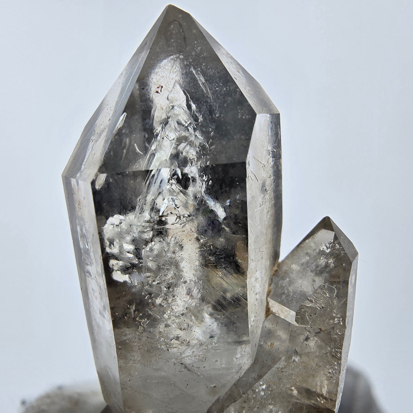 Entdecken Sie die faszinierenden Eigenschaften des Enhydro Phantom Rauchquarz Doppelenders! Dieser wunderschöne Kristall vereint die Klarheit und Eleganz von zepterförmigen Rauchquarz Kristallspitzen mit einer einzigartigen, braun-weiß-transparenten Phantombildung, die ihm eine mystische Ausstrahlung verleiht. Die zepterförmige Doppelender Kristallform (Zepterquarz und Doppelender Quarz) macht diesen Kristall zu einem besonderen Sammlerstück.