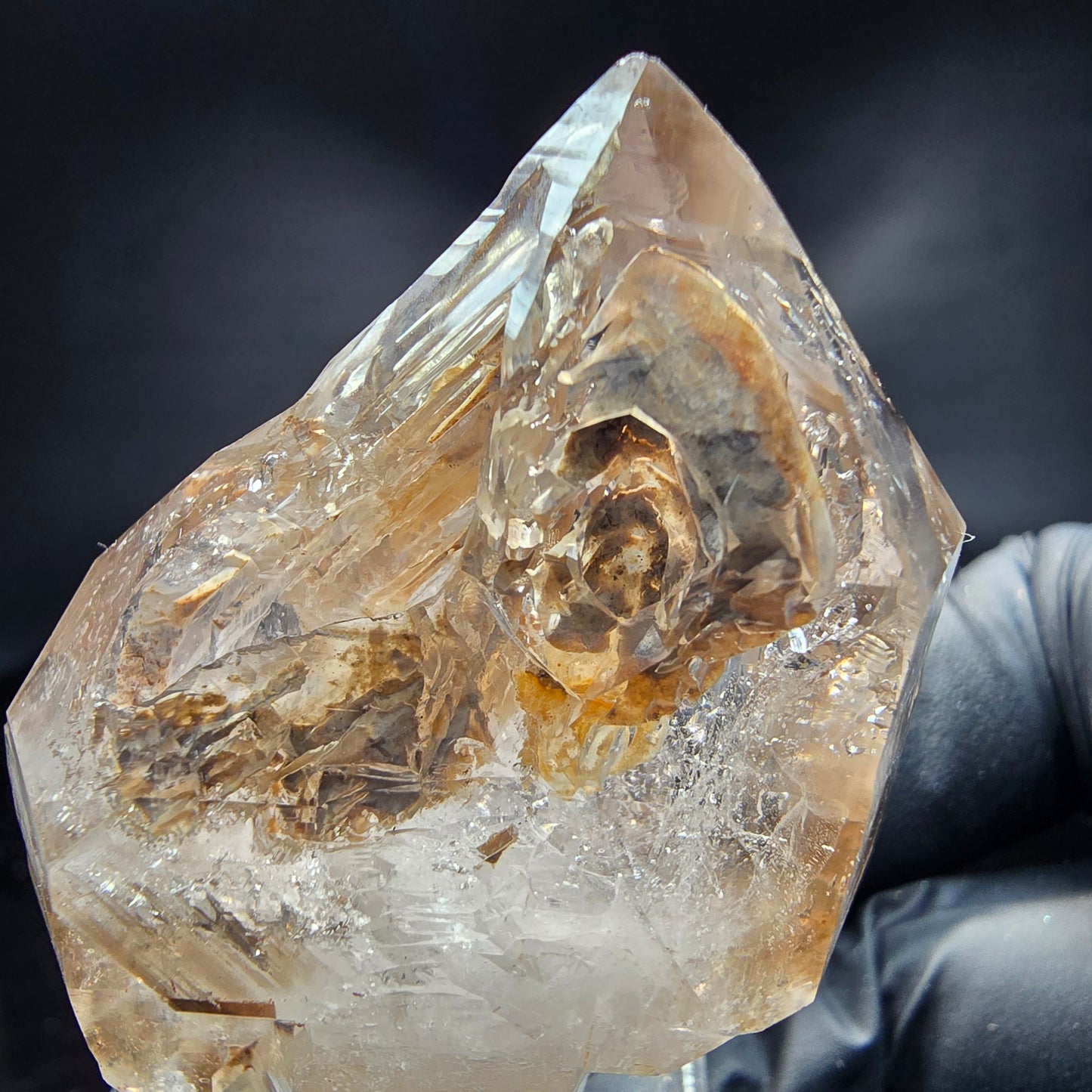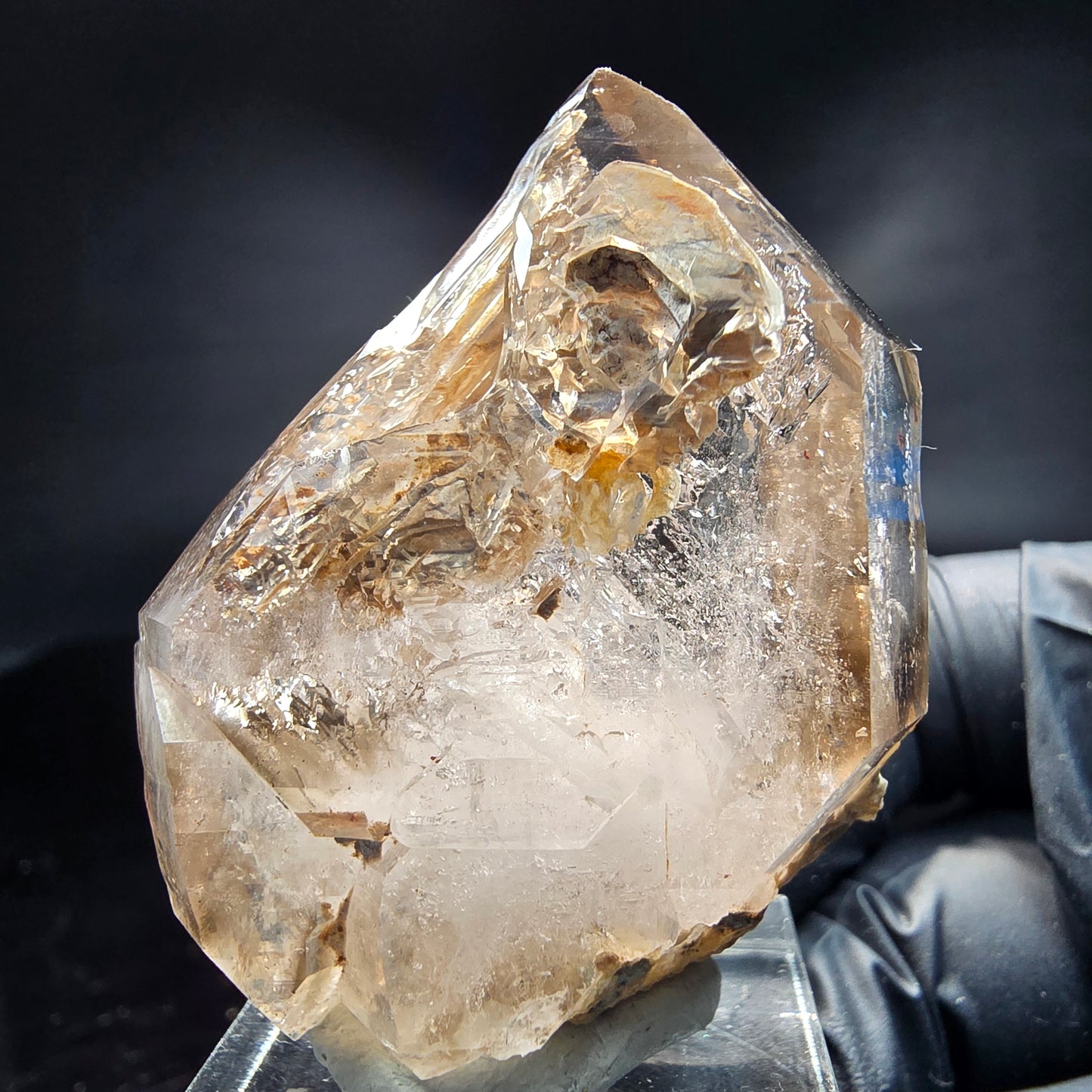 Ein bemerkenswertes Merkmal dieses Kristalls ist der Enhydro Einschluss, der eine bewegliche Luftblase enthält. Dies macht ihn zu einem faszinierenden Sammlerstück. Zudem sind einige fensterförmige Einschlüsse (Fensterquarz) sichtbar, die dem Kristall zusätzlichen Charme verleihen.