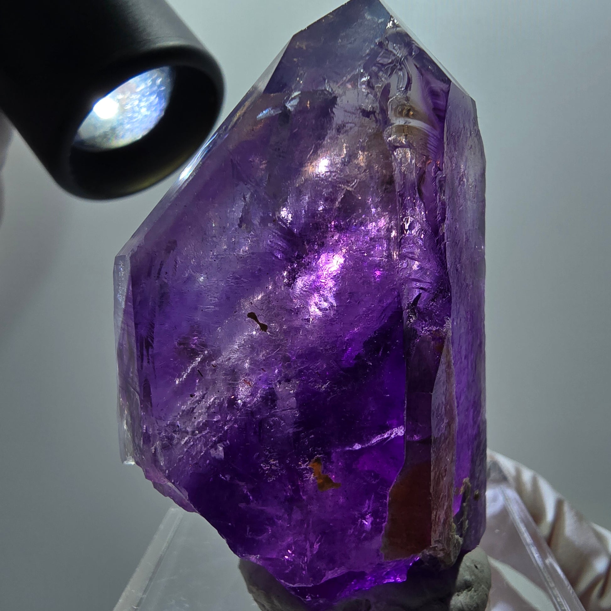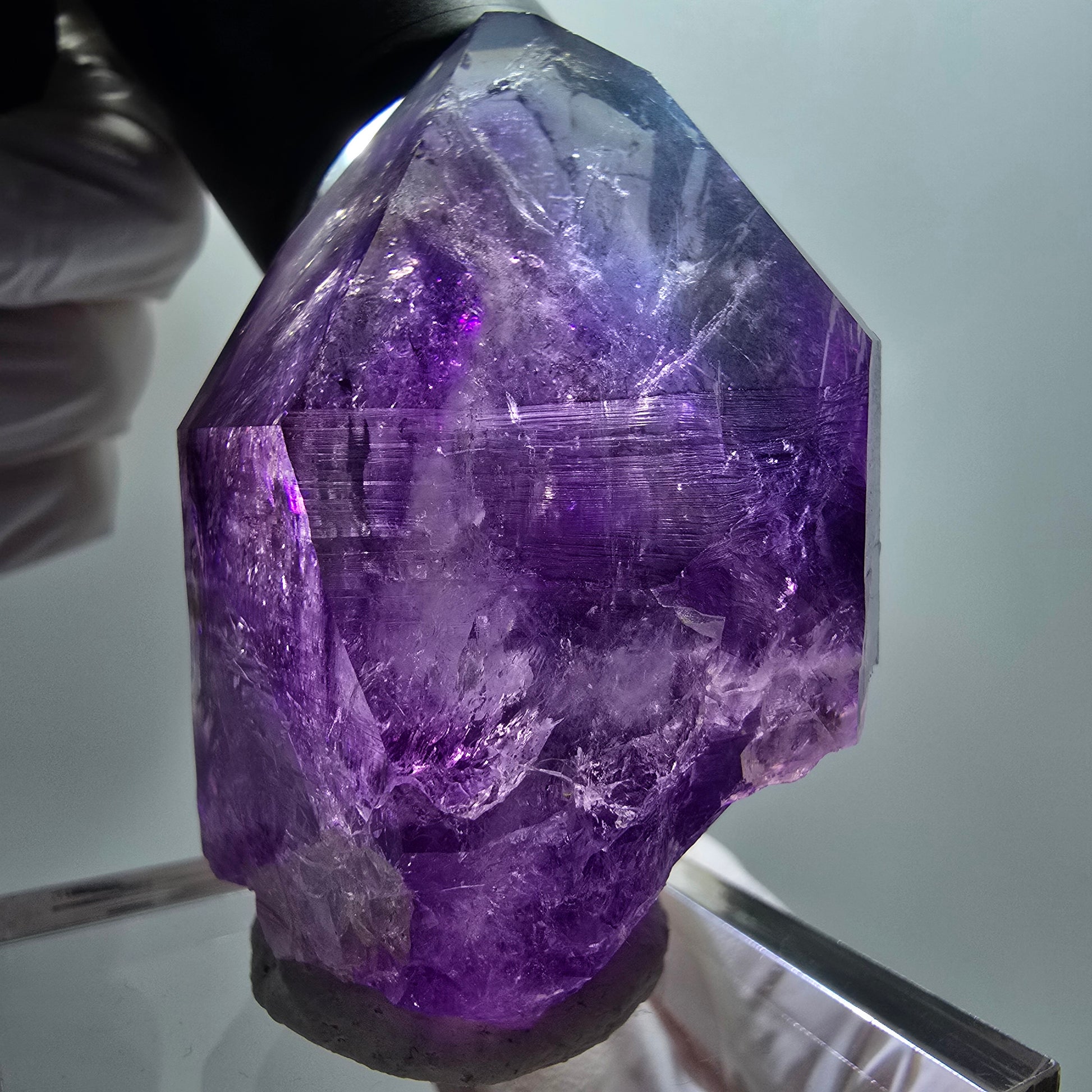 Das Besondere an diesem Stück sind die vier Enhydro-Einschlüsse mit jeweils einer beweglichen Luftblase, wobei einer besonders groß und beeindruckend ist. Im Inneren des Kristalls sind zudem mehrere lila und braune Phantome sichtbar, die die natürliche Wachstumsgeschichte des Minerals erzählen.