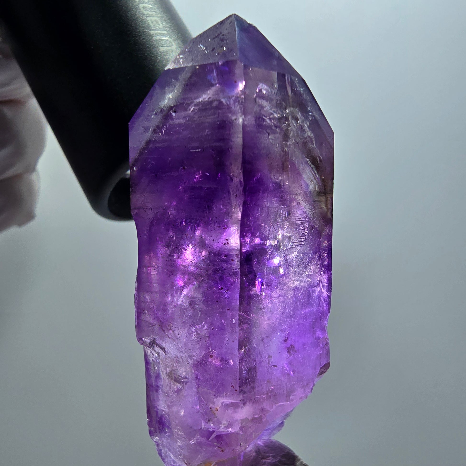 - Besonderheiten: 1x Blase, zepterförmige Kristallbildung, skelettartige Oberfläche, lila/braune Phantome, zwei Enhydro-Einschlüsse mit beweglichen Blasen