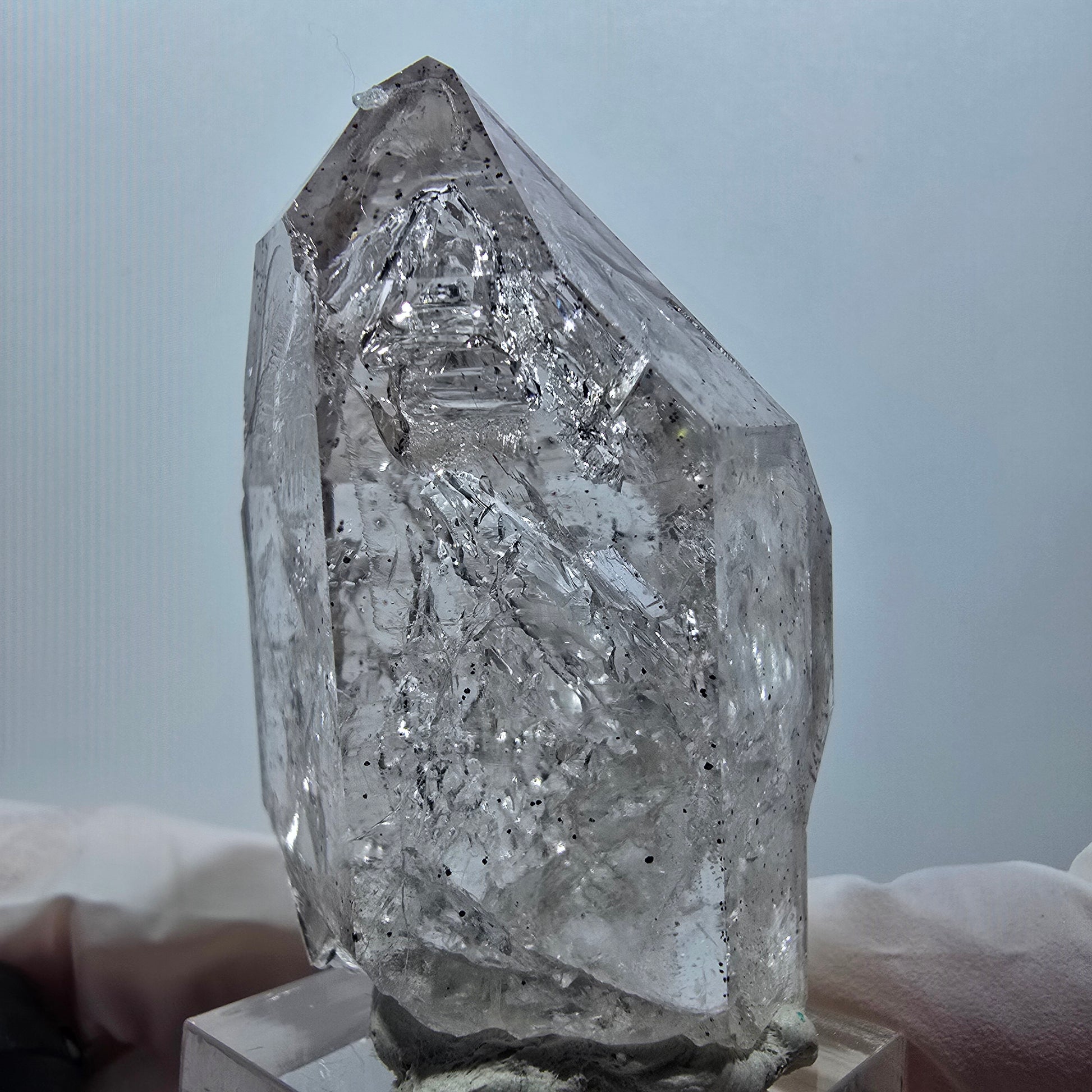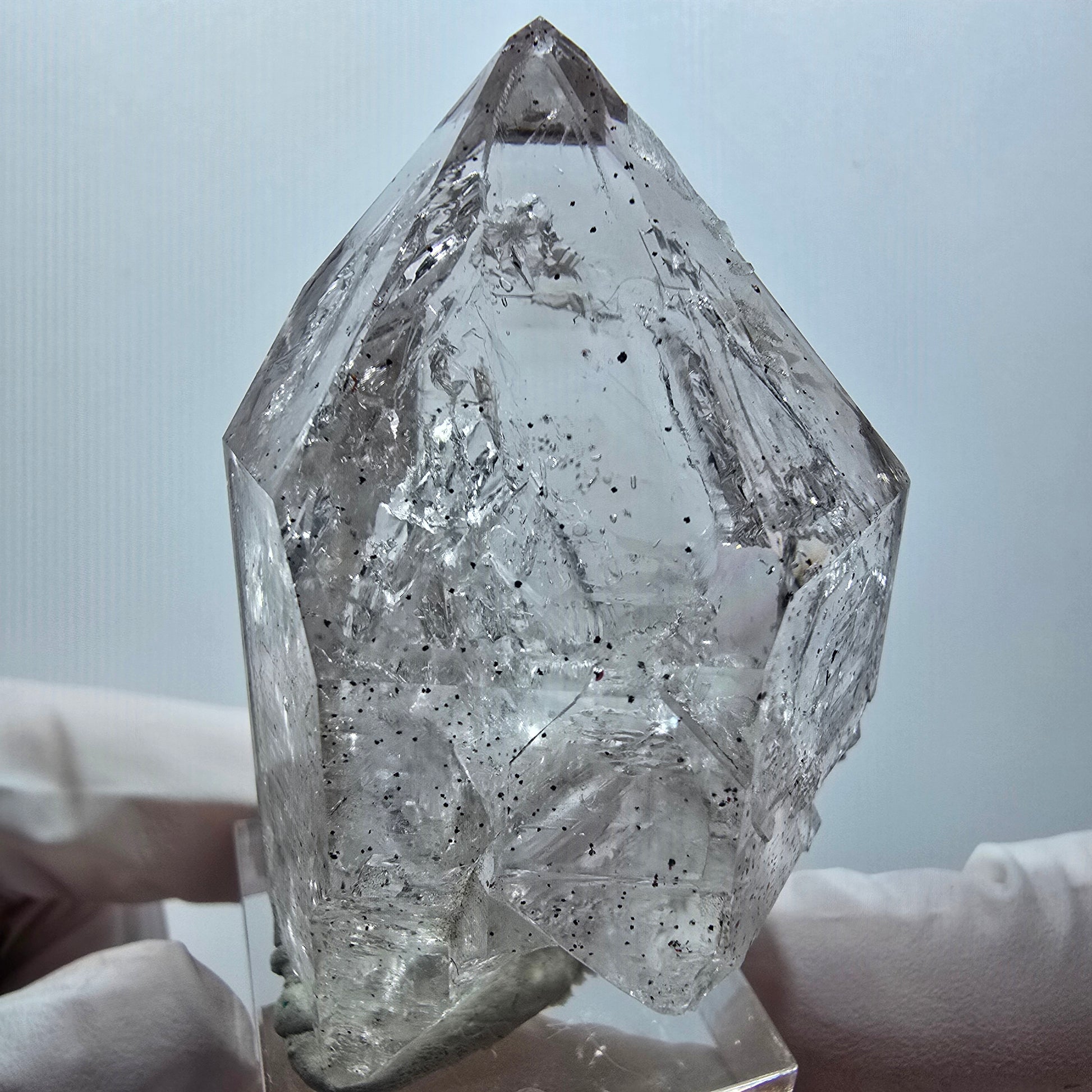 - Besonderheiten: Seltene klare Phantomspitze, zepterförmige DT-Form, Skelett-Oberfläche, braune Phantome, Enhydro mit Blase