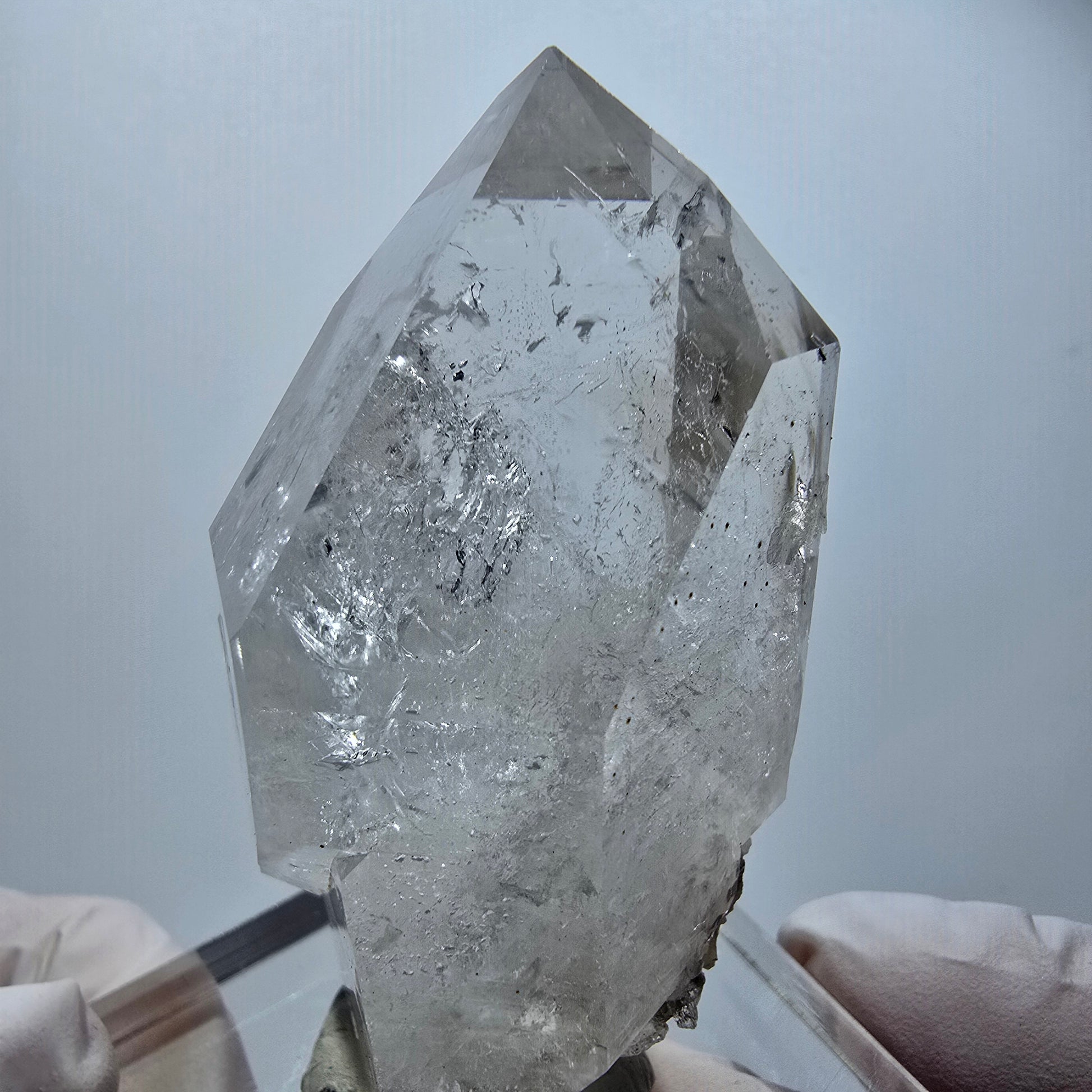 Entdecken Sie diesen seltenen **Enhydro Skelett Phantom Rauchquarz DT Zepter** aus Goboboseb, Namibia – eine klare Phantom-Kristallspitze mit zepterförmiger Doppelender-Bildung und skelettartiger Oberfläche. Im Inneren sichtbar: braune Phantome und ein faszinierender **Enhydro-Einschluss mit beweglicher Luftblase**. Mit Maßen von 65x37x35 mm und einem Gewicht von 86 g ist dieses Exemplar ein Highlight für Sammler.