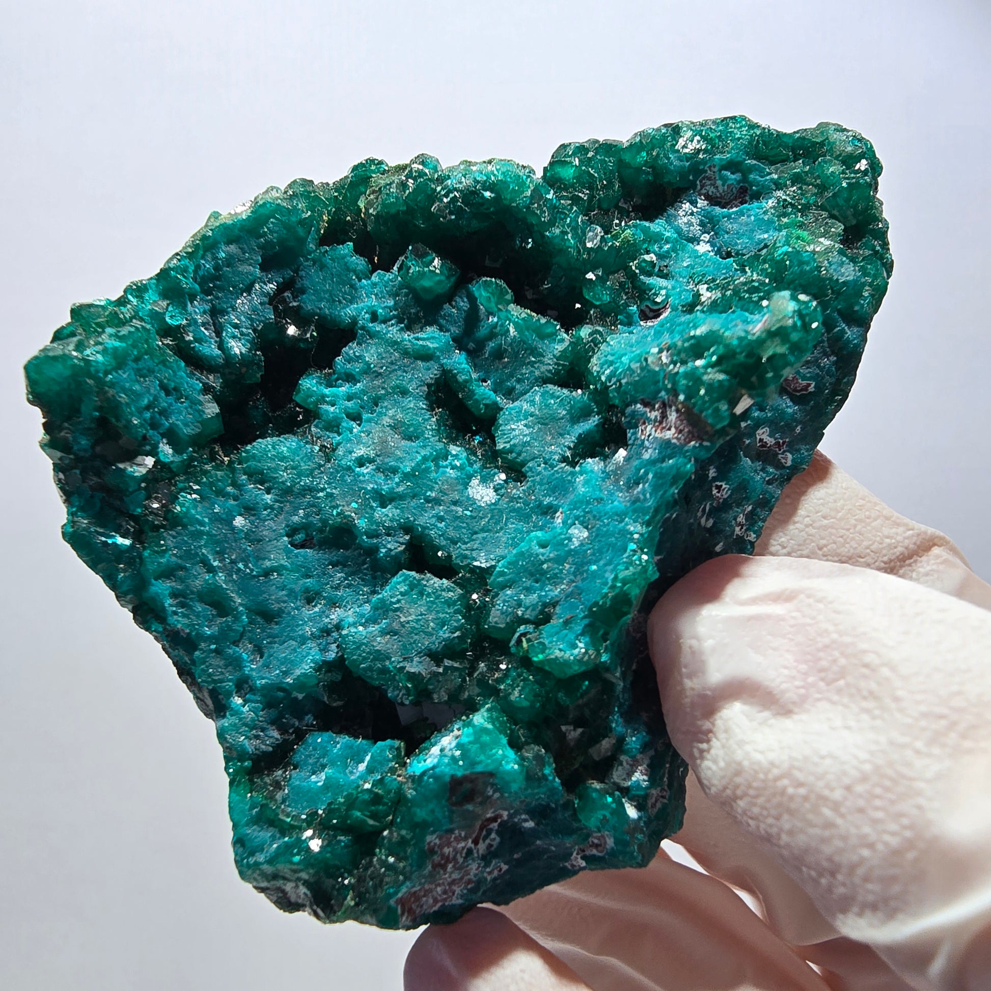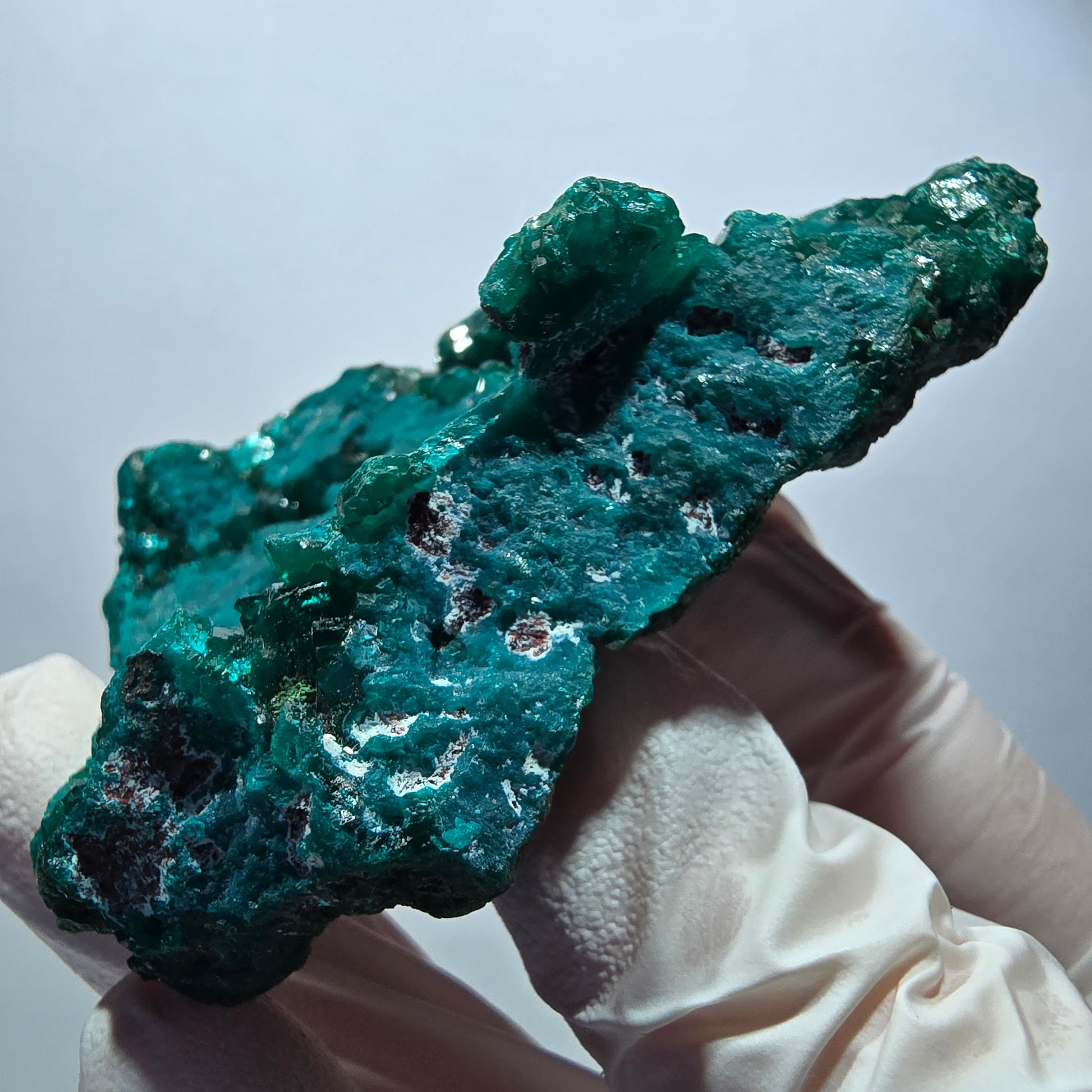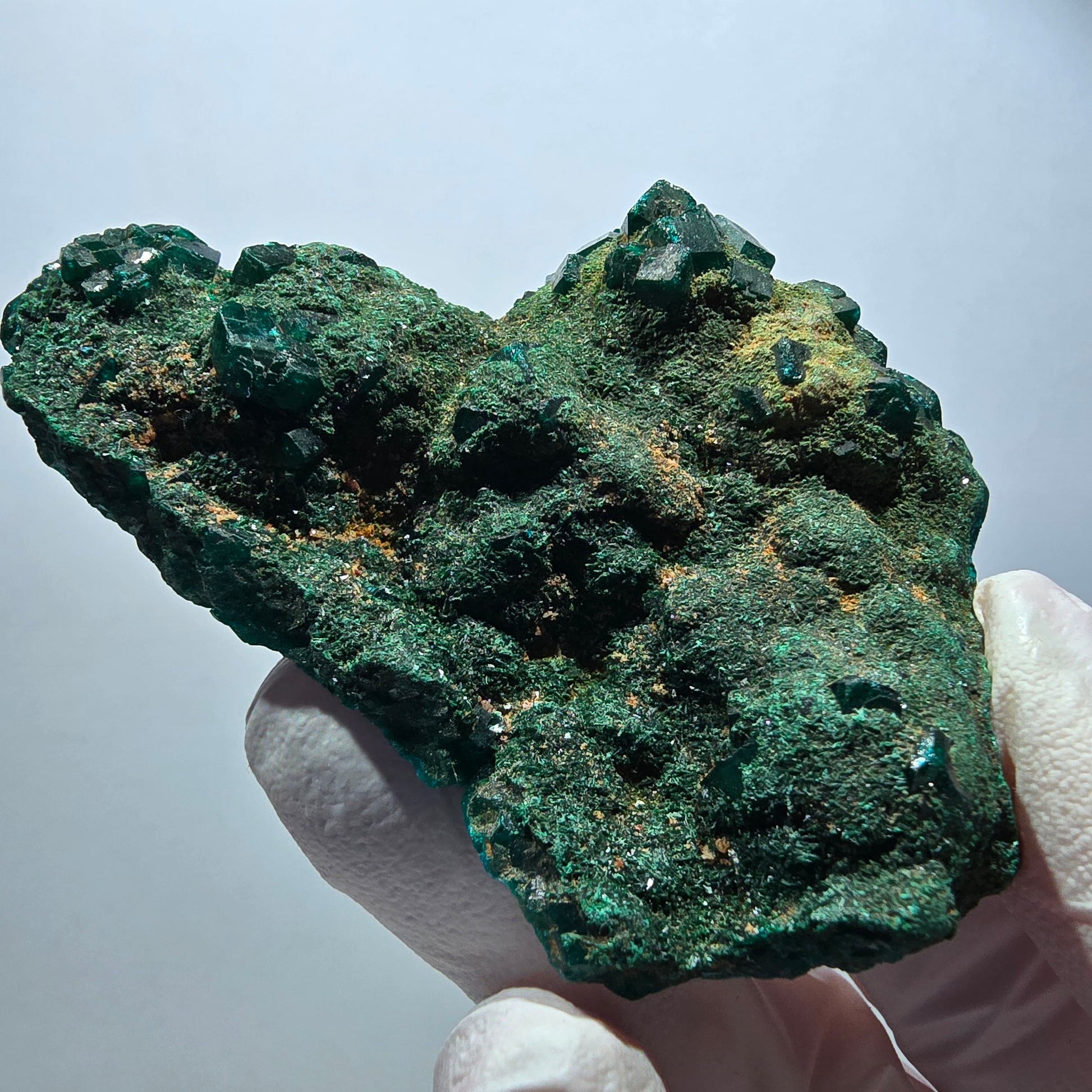 Diese große Dioptas XX Stufe aus der Republik Kongo begeistert mit ihren ausgeprägten, dunkelgrünen bis türkisen, kantig gewachsenen Kristallen.