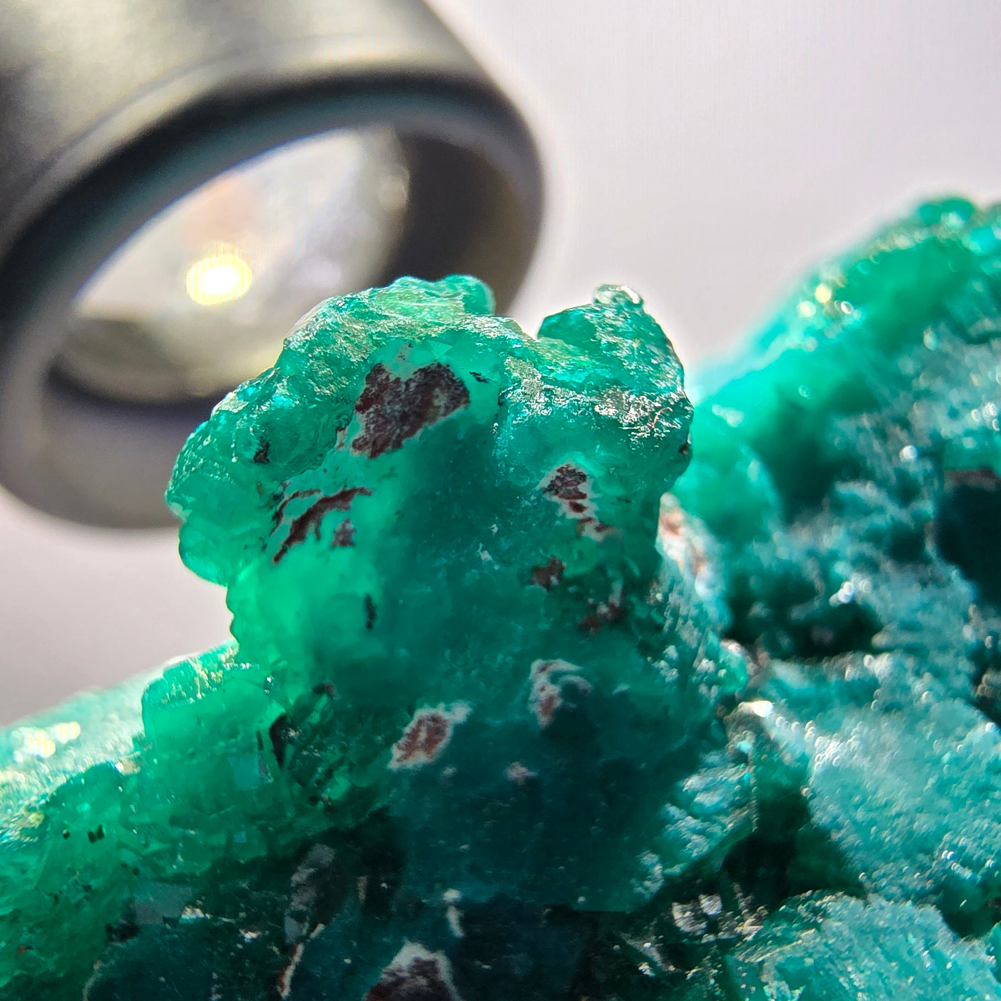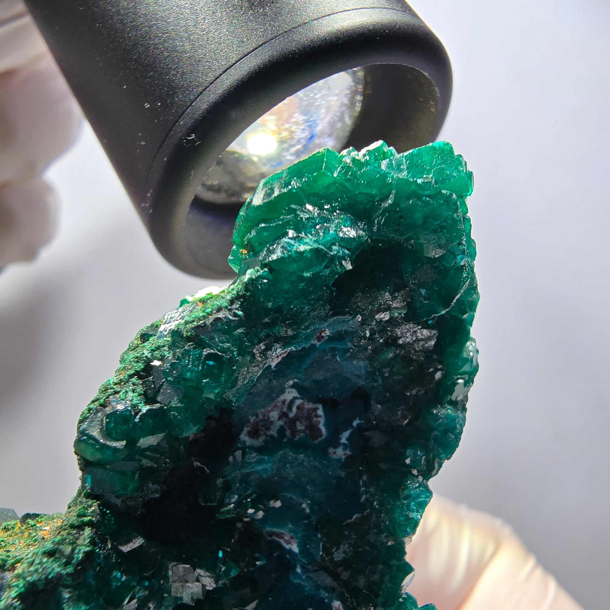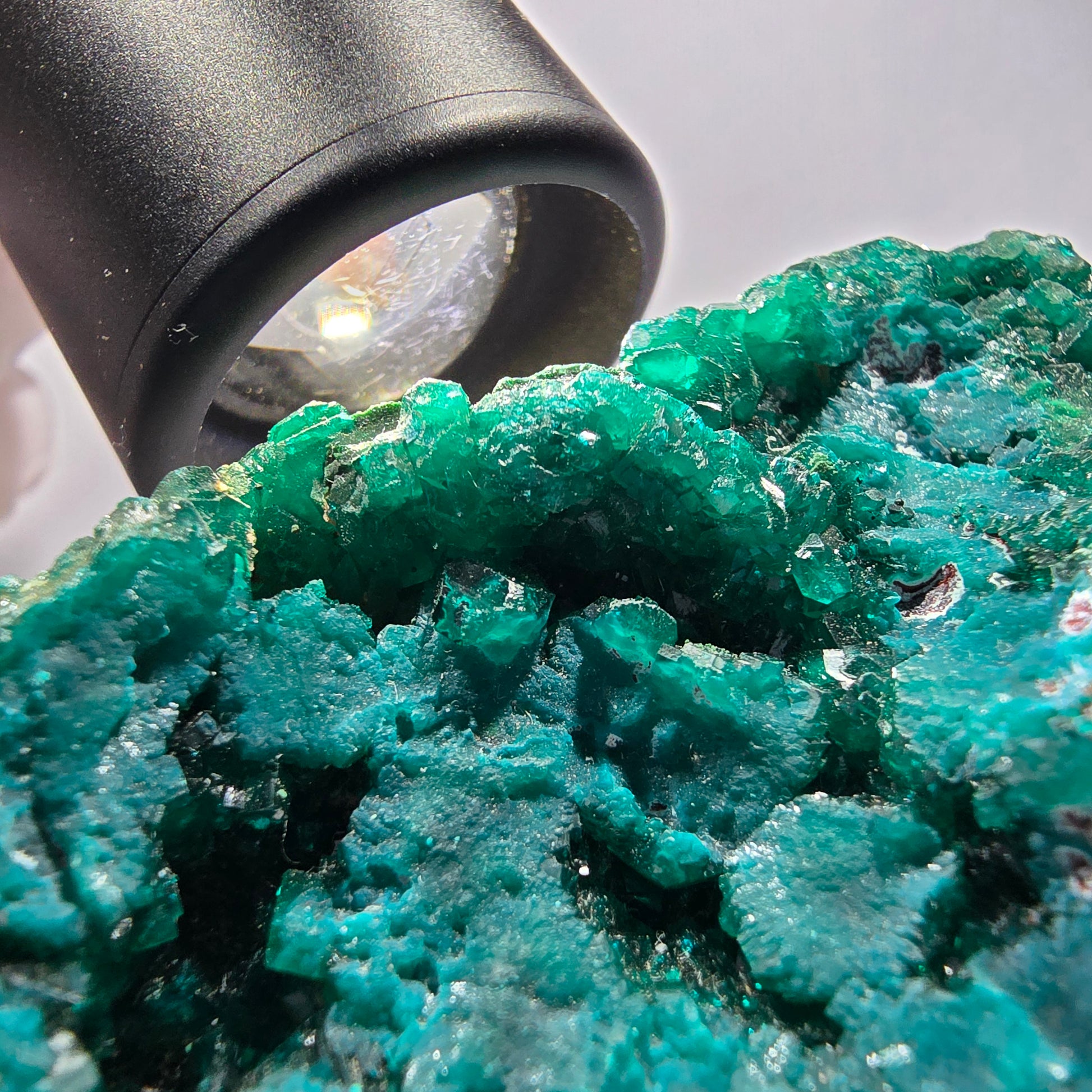 Diese große Dioptas XX Stufe aus der Republik Kongo begeistert mit ihren ausgeprägten, dunkelgrünen bis türkisen, kantig gewachsenen Kristallen.