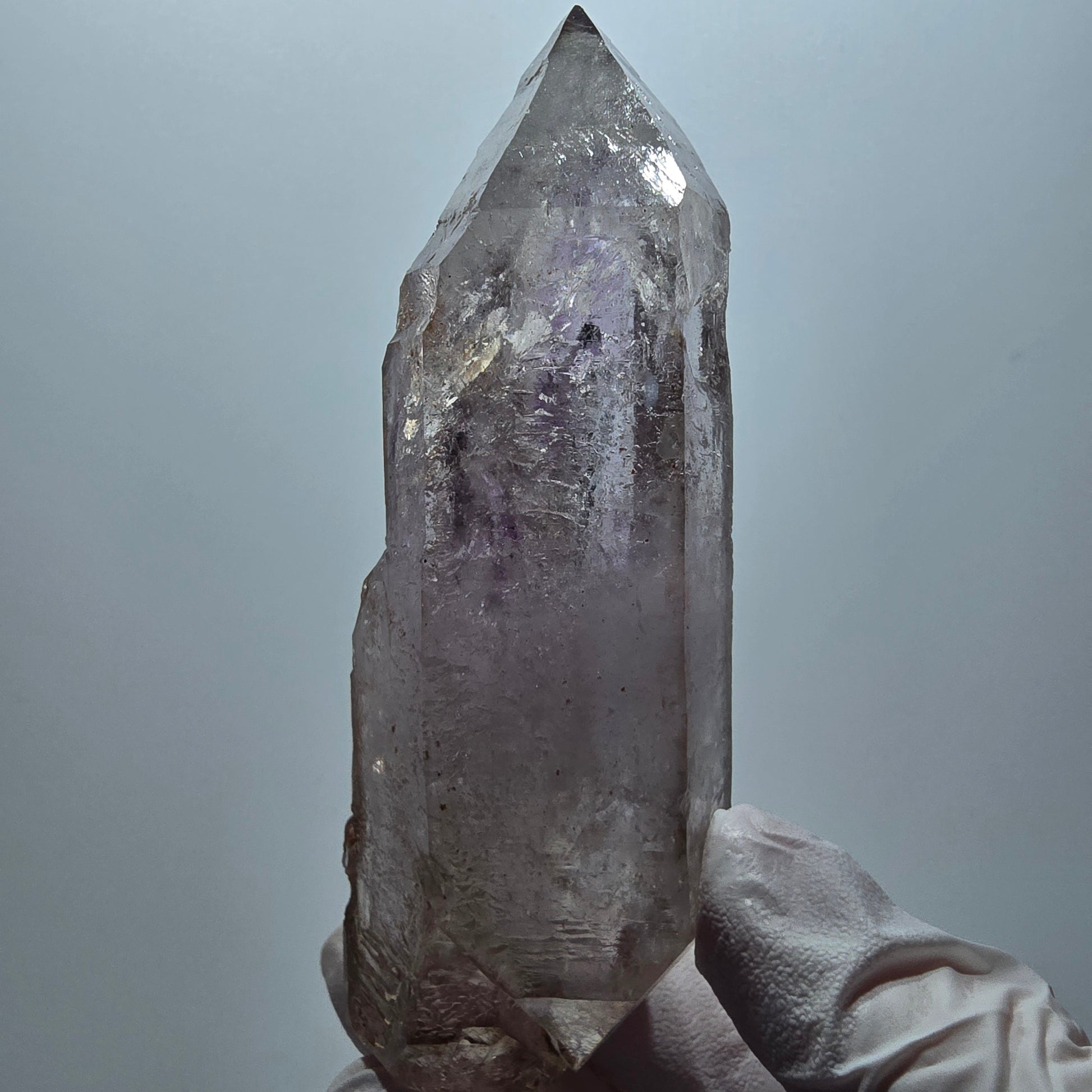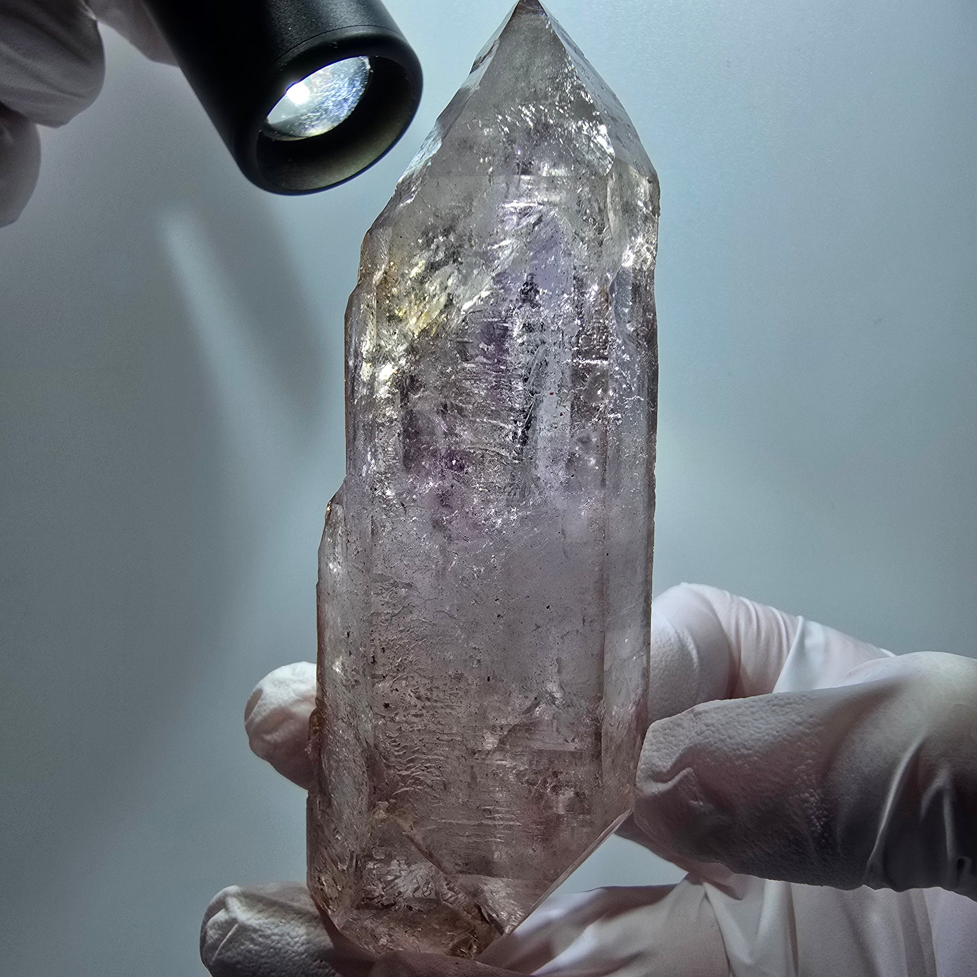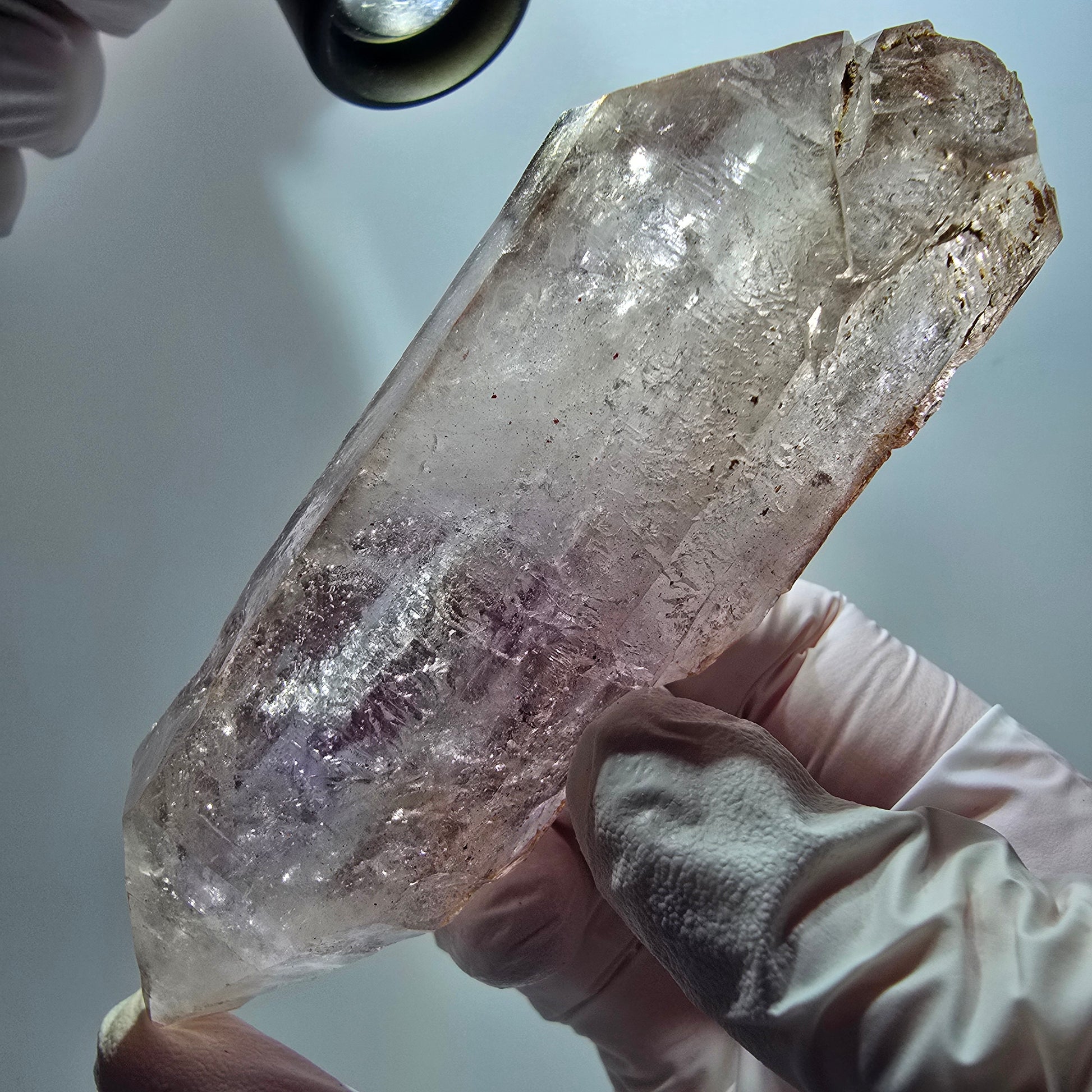 - Besonderheiten: 2x Enhydro-Blase, klare Phantomspitze, zepterförmige Doppelender, skelettartige Oberfläche, lila/braune Phantome