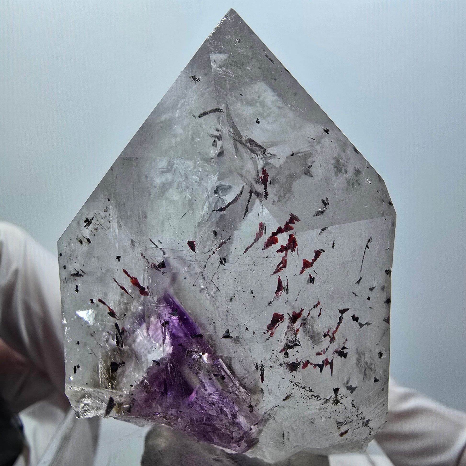 Entdecken Sie diese große Harlekin Phantom Amethyst Spitze, einen seltenen Phantom Amethyst Kristall aus der Streep Mine in Goboboseb, Namibia. Mit Maßen von 59x44x40 mm und einem Gewicht von 115 g präsentiert sie lila-braune, transparente Phantom-Kristallbildungen mit nadelförmigen roten Hämatit-Einschlüssen im Inneren.