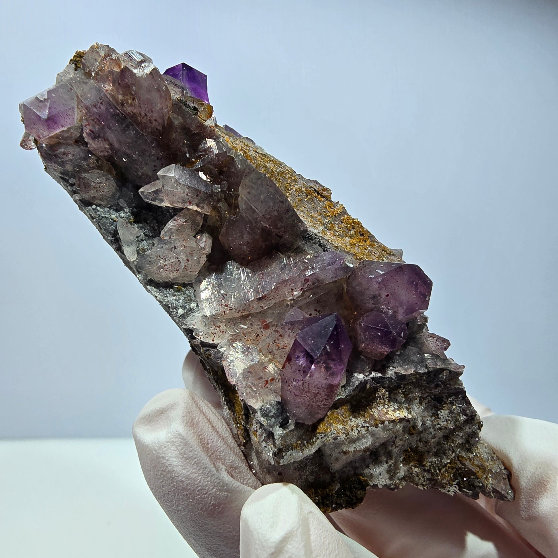- Besonderheit: Lila-transparente Amethystspitzen mit roten Hämatit-Einschlüssen