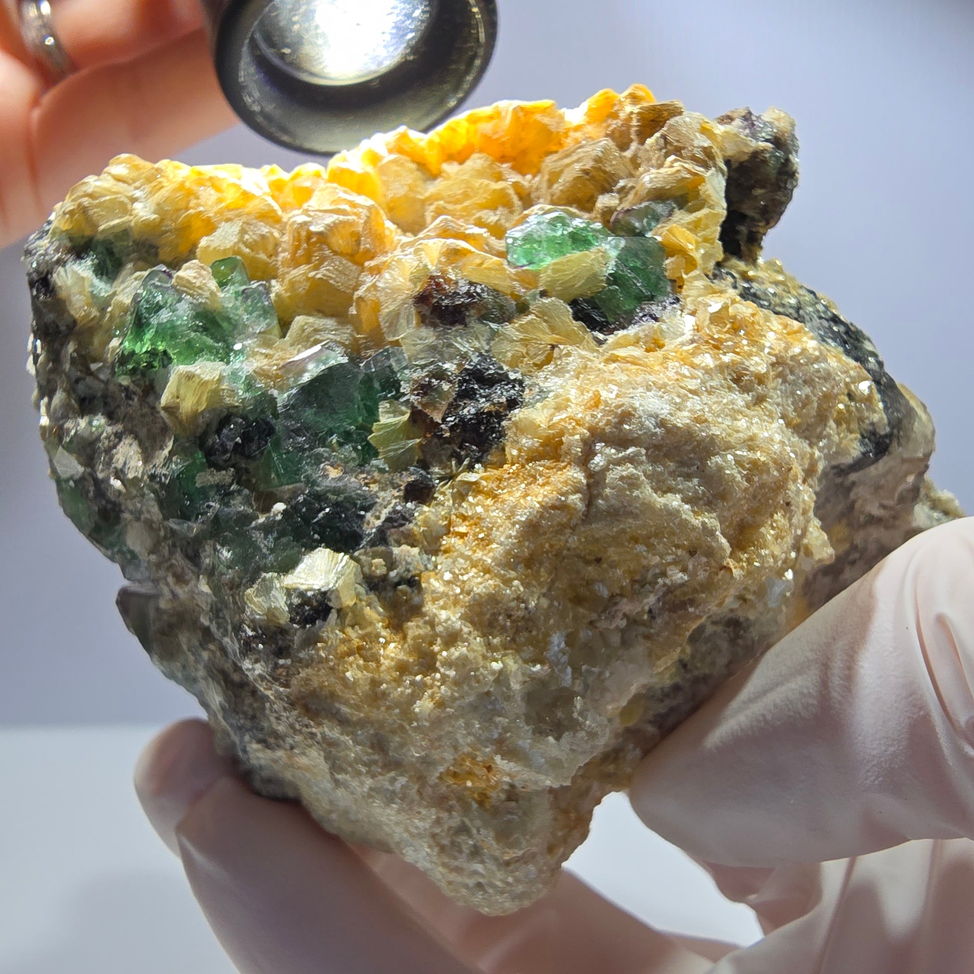 Große seltene Mineralienstufe mit spannendem Phantom Fluorit in grün, braun und lila, kombiniert mit schwarzen Schörl Turmalin-, neongelb unter UV-Licht leuchtenden Hyalit-, metallisch glänzenden Muskovit- und grau transparenten Rauchquarz-Kristallen. Die Stufe aus Namibia misst 89 x 71 x 59 mm und wiegt 424 g.