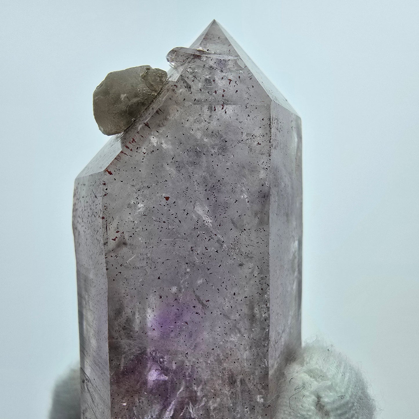 Die besondere Schönheit des Kristalls wird durch die seltenen roten Hämatit-Einschlüsse und die eindrucksvollen lila-braunen Phantome im Inneren verstärkt. Auf der Stufe befinden sich zudem weiße Calcit-Kristalle, die unter UV-Licht in einem strahlenden Orangeton leuchten und dem Gesamtkunstwerk eine spannende Farbvariation hinzufügen.