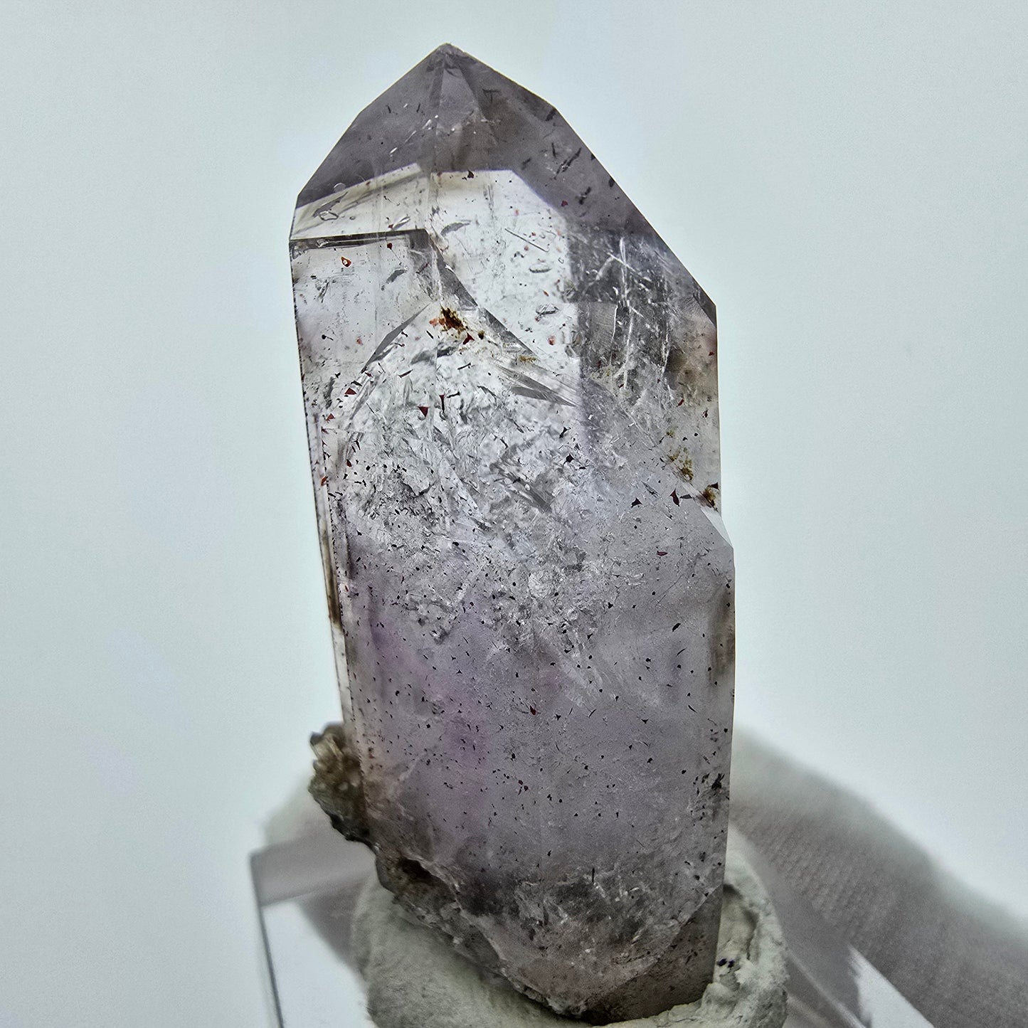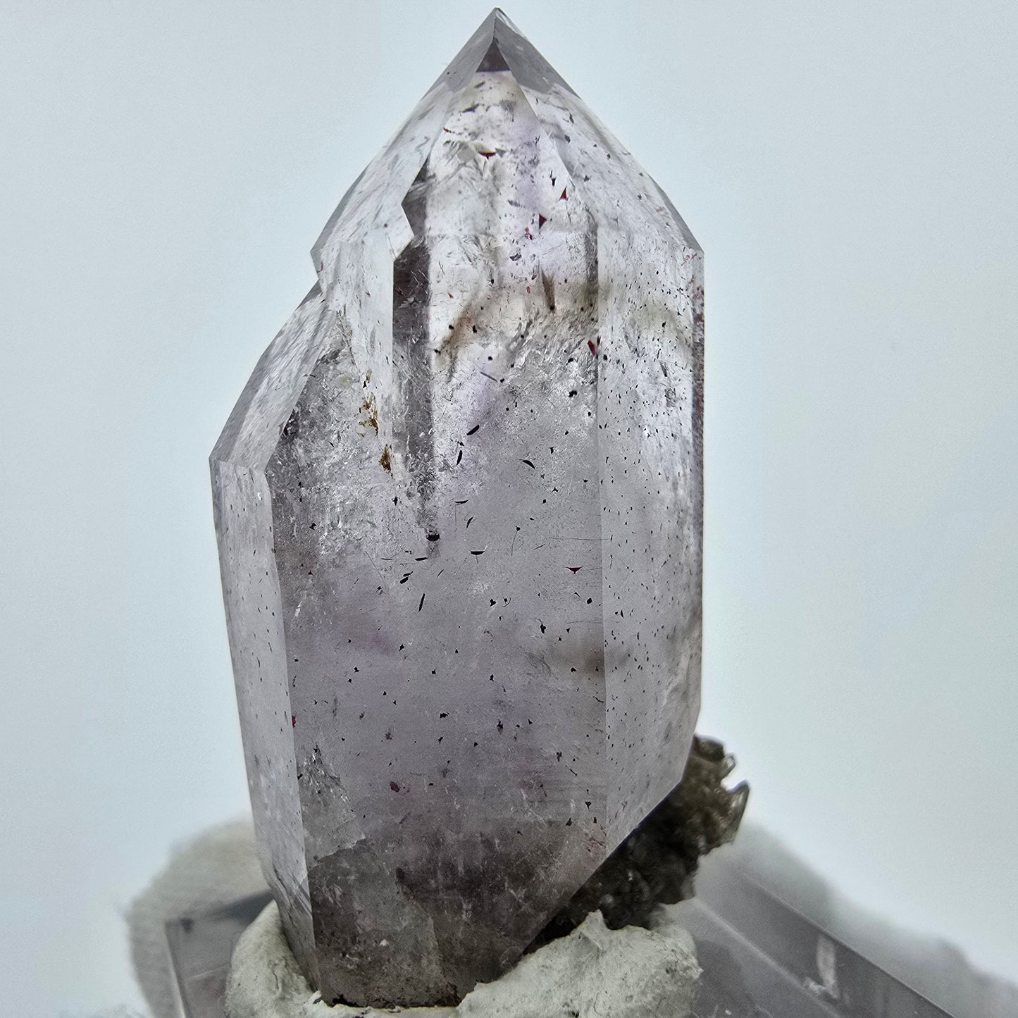 Der Kristall ist auf einer kleinen Rauchquarz-Matrix gewachsen und präsentiert sich in einer zepterförmigen Kristallform (DT Zepter Quarz). Im Inneren des Kristalls sind sehr seltene rot-braun und silber glänzende Hämatit-Einschlüsse sichtbar (Harlekin Quarz). Besonders bemerkenswert ist ein Enhydro-Einschluss, der eine bewegliche Luftblase enthält, was diesem Stück eine zusätzliche Dimension verleiht.