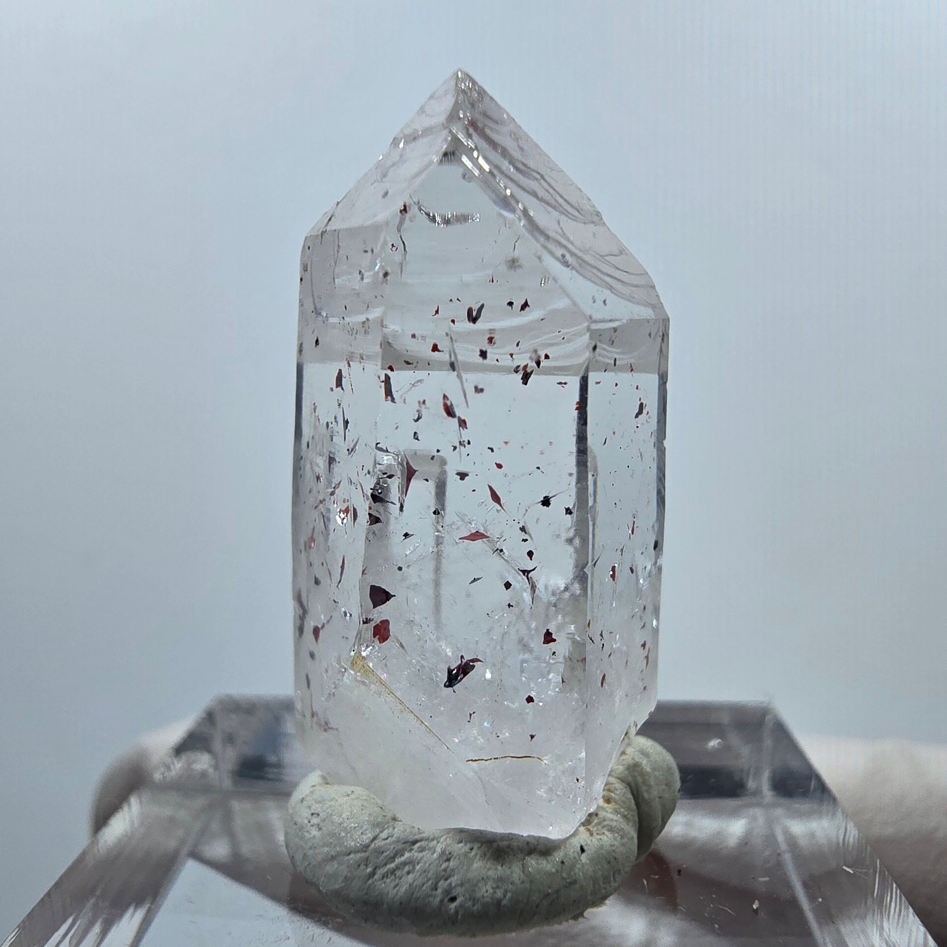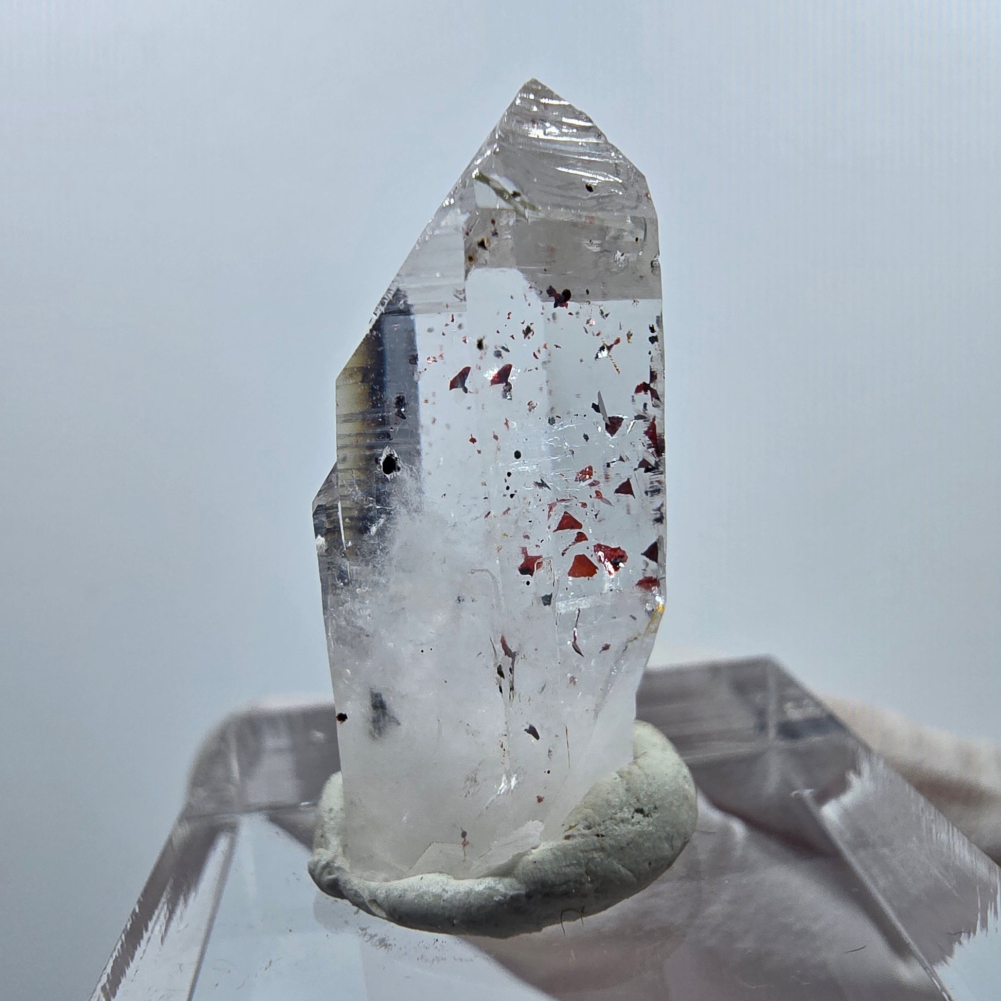 Seltene Harlekin Lemurian Hämatit Quarz Spitze mit klar weiß-transparentem Quarz und faszinierenden Phantomen im Inneren. Die rote Hämatit-Einschlüsse und die typischen horizontalen Querrillen (Lemurian Struktur) machen dieses 27 x 13 x 11 mm große Exemplar von der Streep Mine in Goboboseb, Namibia, besonders.