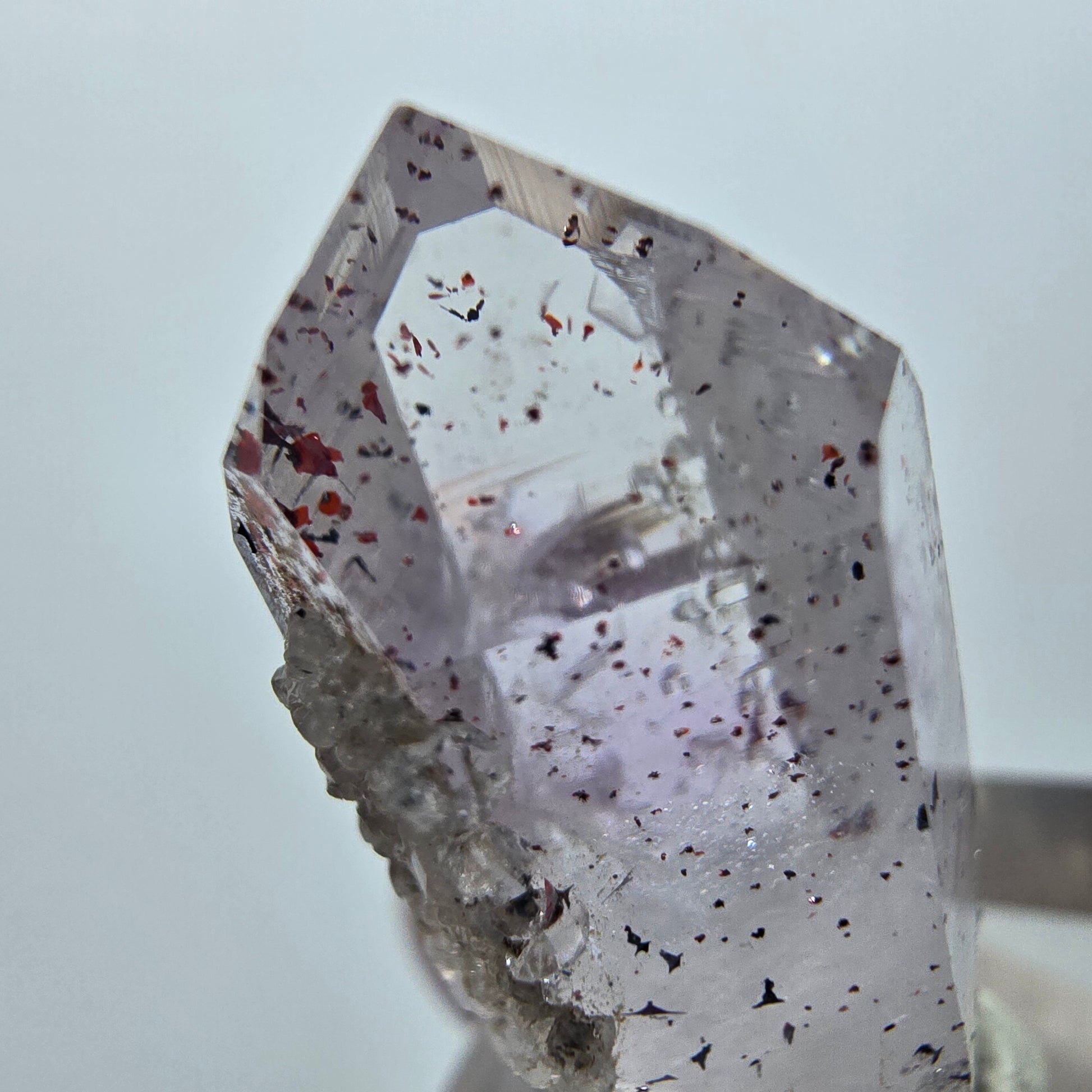 Dieser seltene Harlekin Lemurian Phantom Amethyst stammt aus der Streep Mine in Goboboseb, Namibia, und besticht durch seine klare, lila-weiße Transparenz sowie die markanten Phantome im Inneren. Die Kristallspitze zeigt rote und schwarze Hämatit-Einschlüsse und ist an mehreren Seiten mit horizontalen Querrillen versehen, typisch für Lemurian Quarz.