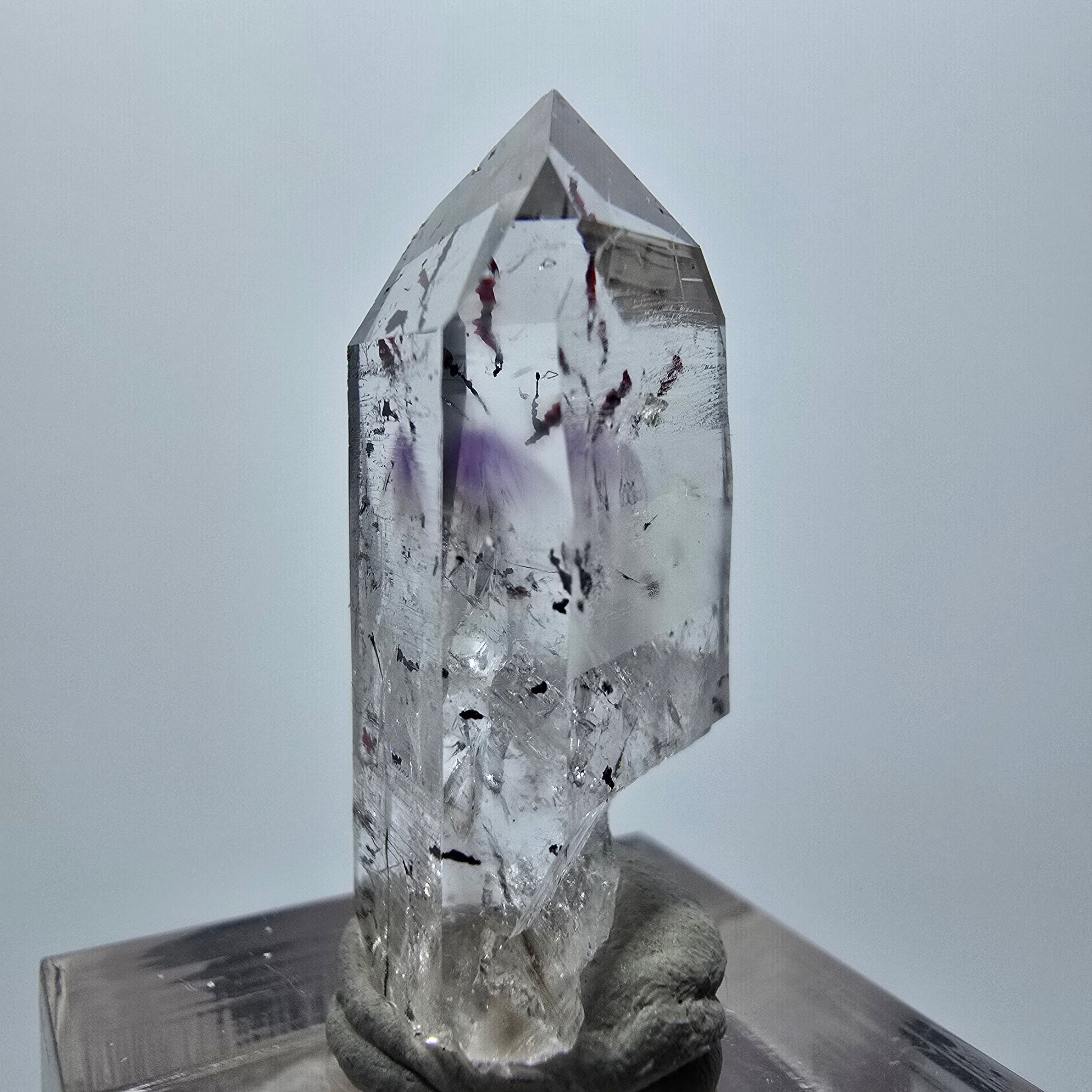 - Besonderheiten: Klare lila-weiße Phantom-Kristallspitze mit Phantomen, roten Hämatit-Nadeln und grünen Epidot-Einschlüssen