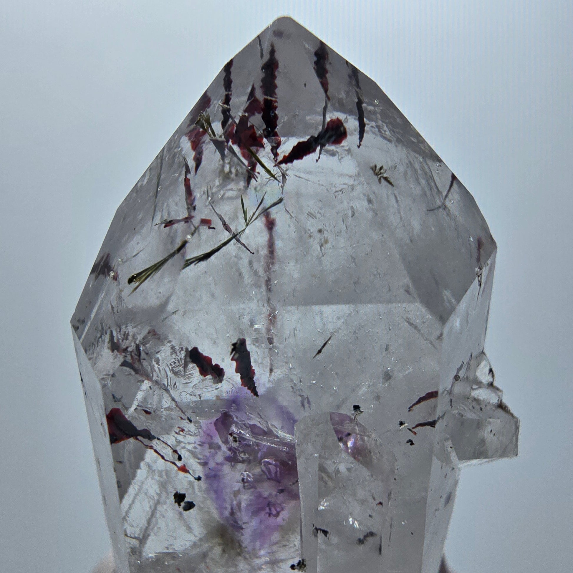 - Besonderheiten: Klare lila-weiße Phantom-Kristallspitze mit Phantomen, roten Hämatit-Nadeln und grünen Epidot-Einschlüssen