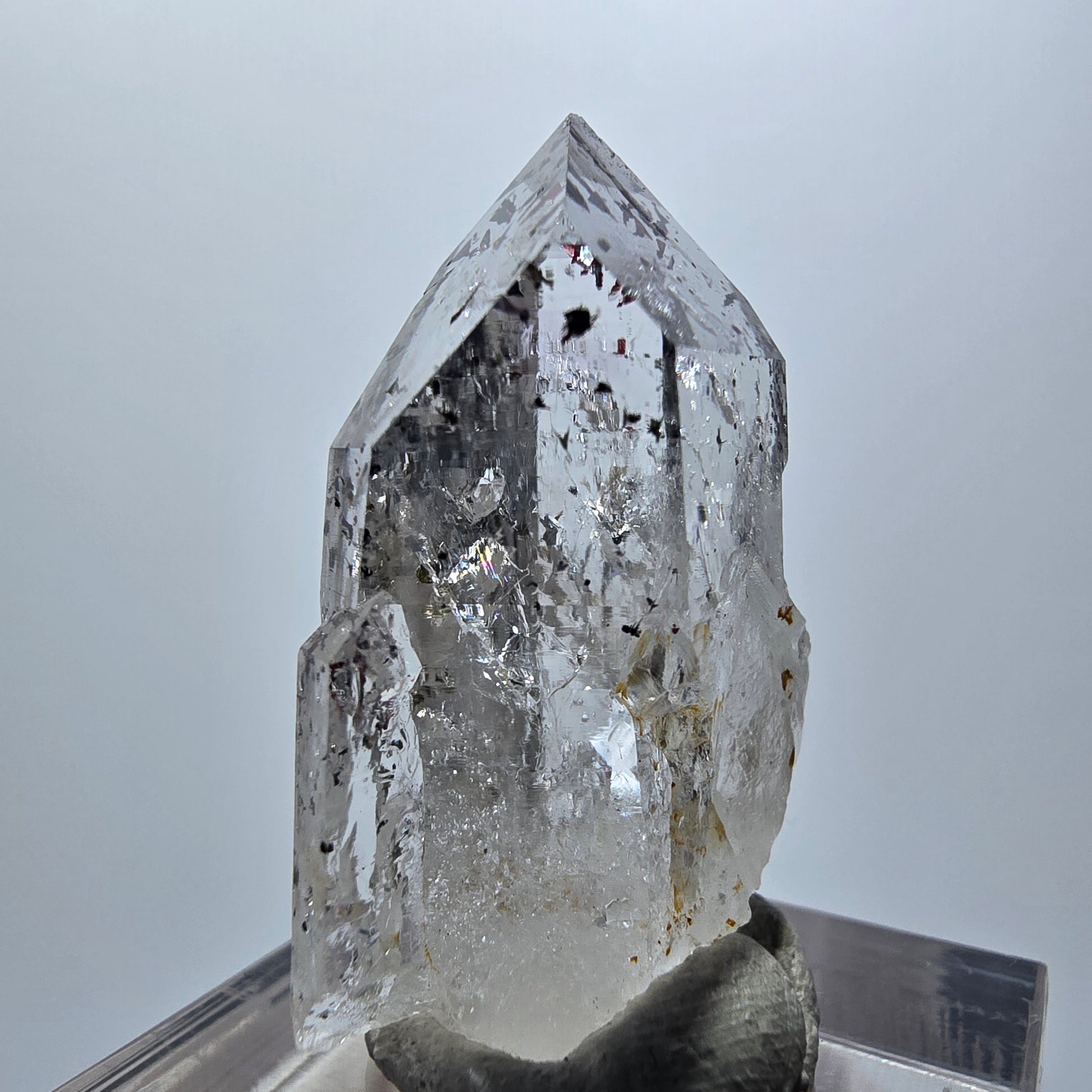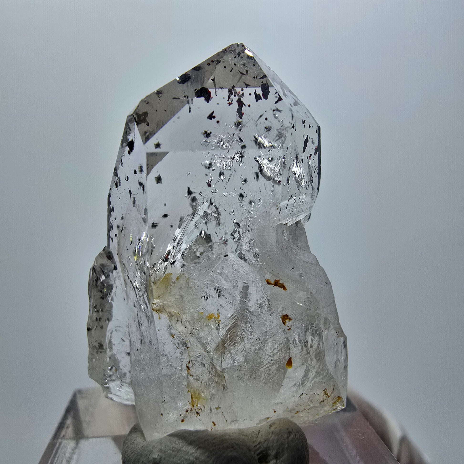 - Besonderheiten: Klare weiß-transparente Phantom-Kristallspitze, rote Hämatit-Nadeln, grüne Epidot-Einschlüsse