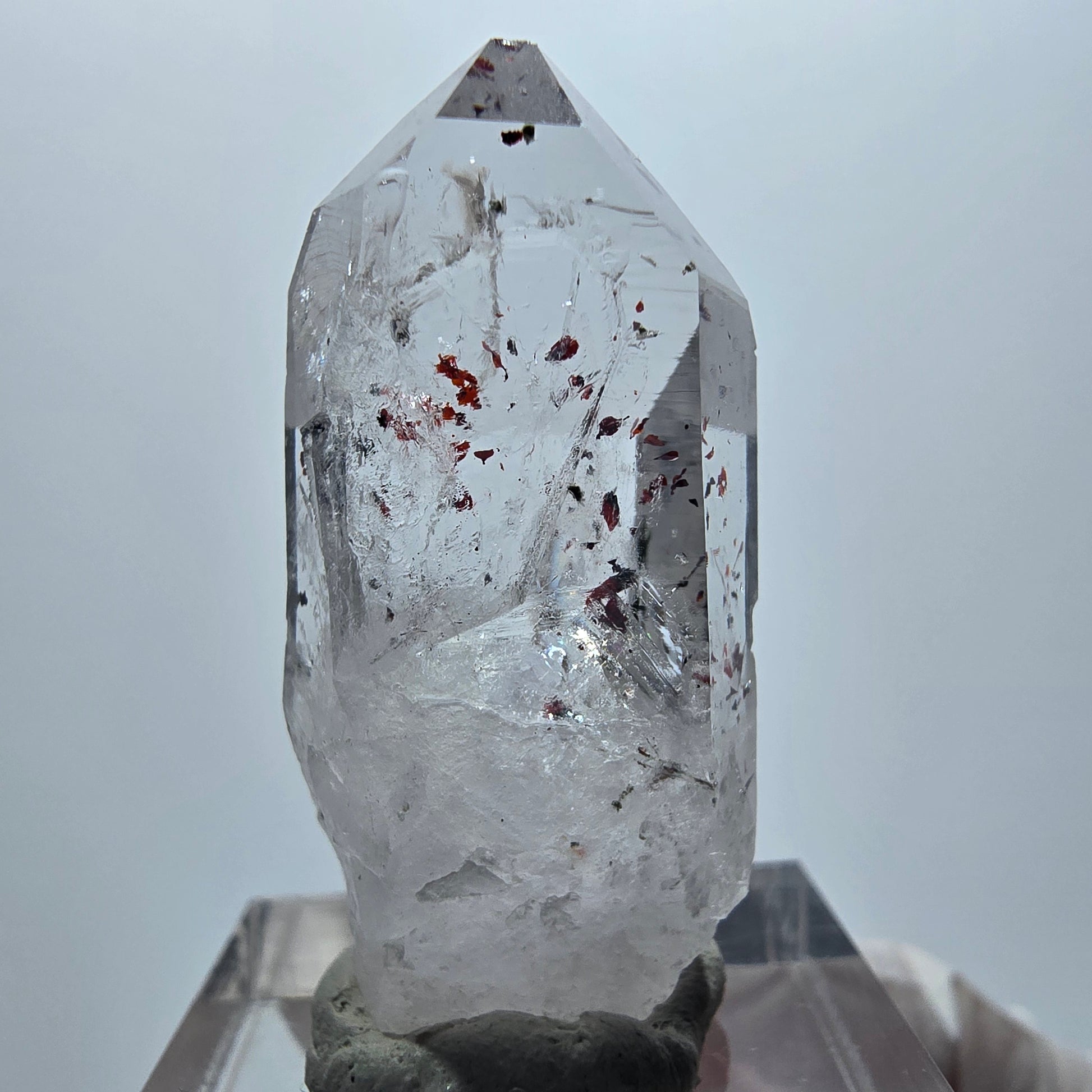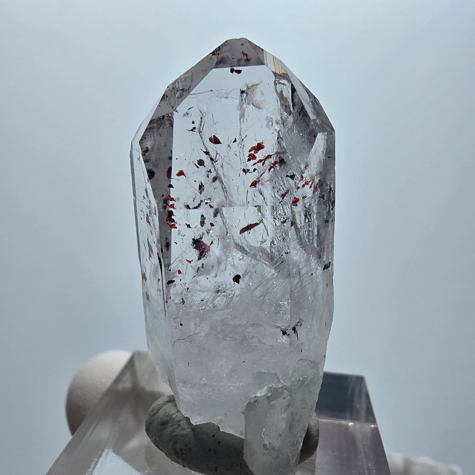Dieser außergewöhnliche Harlekin Phantom Quarz besticht durch seine seltene Transparenz in Lila und Braun-Weiß mit faszinierenden Phantomen im Inneren. Die Kristallspitze stammt aus der renommierten Streep Mine in Goboboseb, Namibia, und zeigt wunderbar rote nadelförmige Hämatit- sowie grüne Epidot-Einschlüsse, die dem Mineral eine einzigartige Schönheit verleihen.