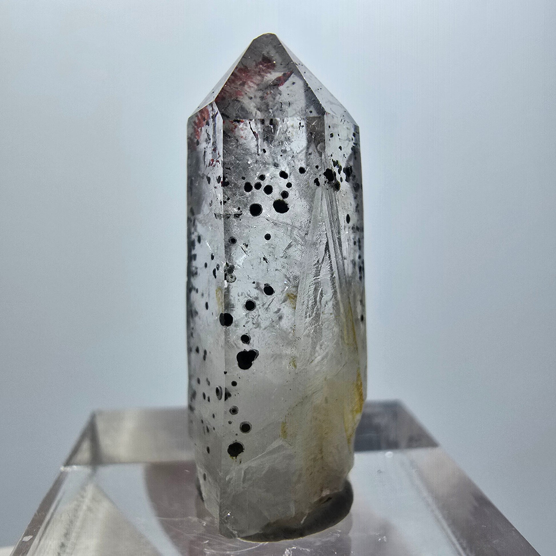 Erstaunliche Phantome im Inneren, rote nadelförmige Hämatit-Einschlüsse sowie schwarze punktförmige Hämatit-Kristalle an der Oberfläche machen ihn zu einem einzigartigen Sammlerstück.