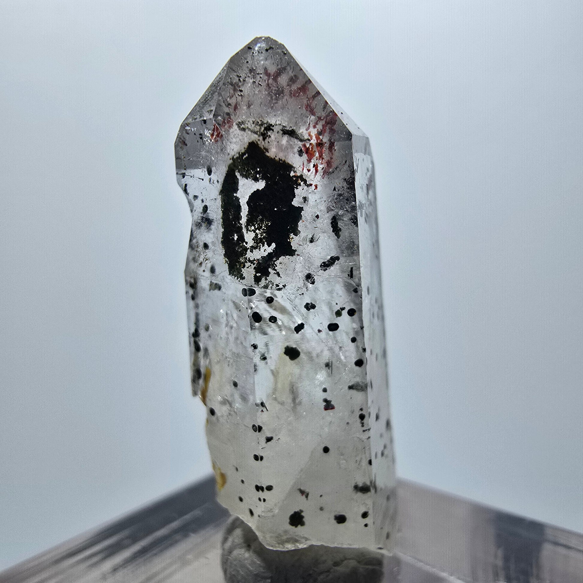 - Besonderheiten: Klare weiß-transparente Phantom Quarzspitze mit Phantomen, roten nadelförmigen Hämatit-Einschlüssen und schwarzen punktförmigen Hämatit-Kristallen
