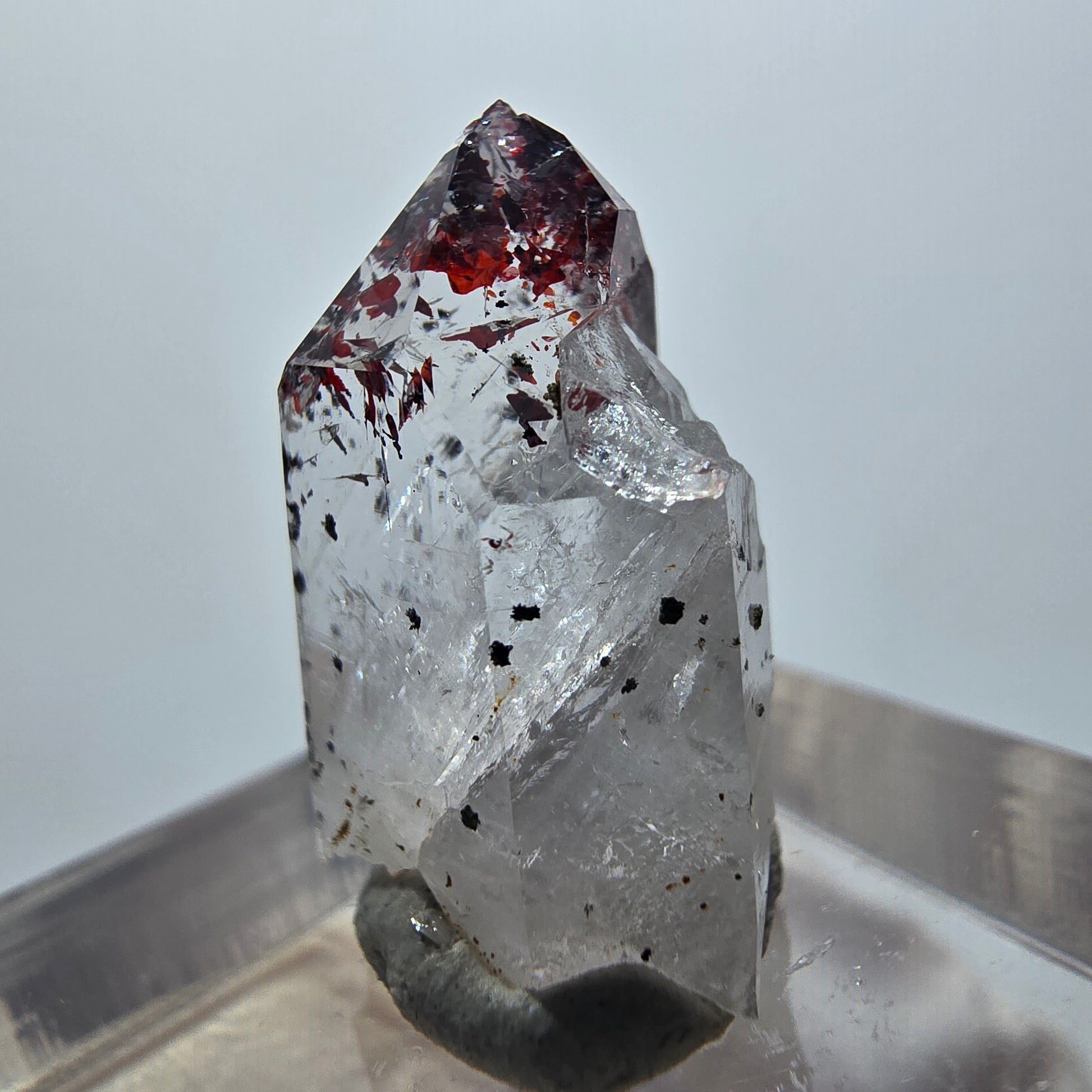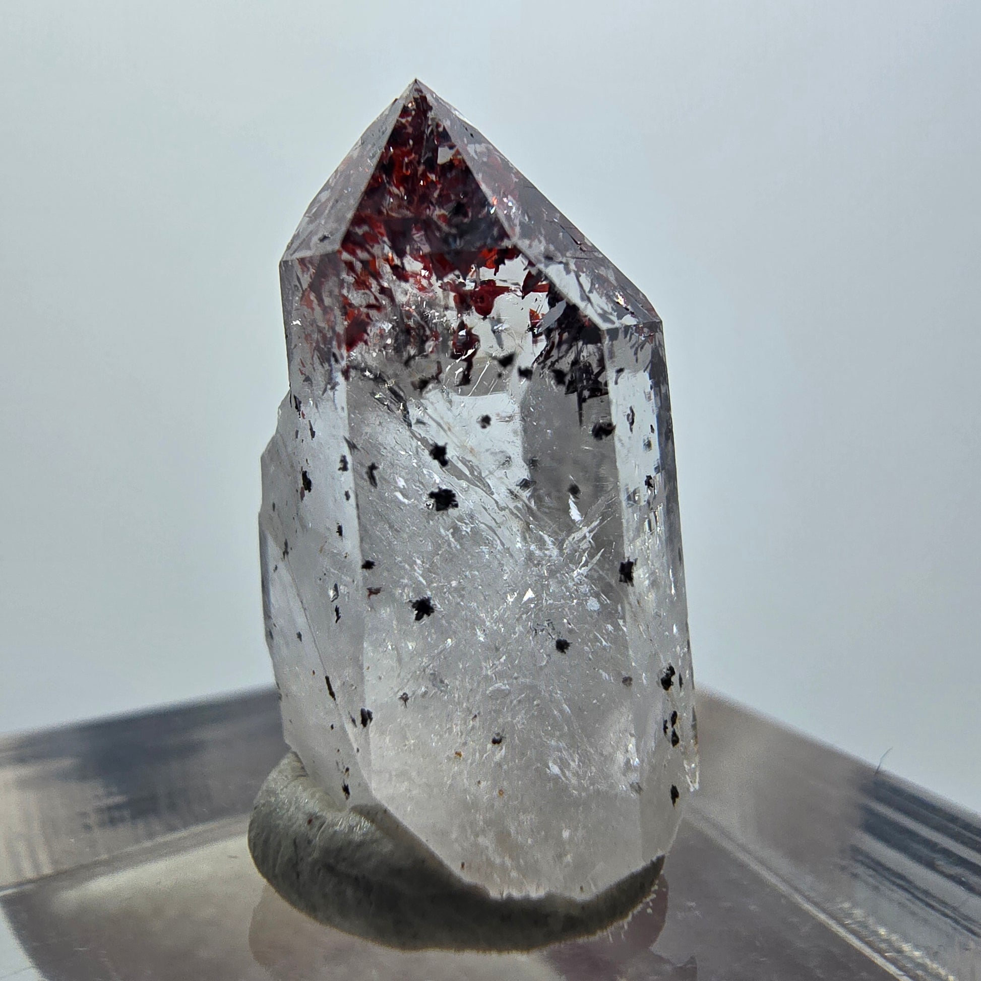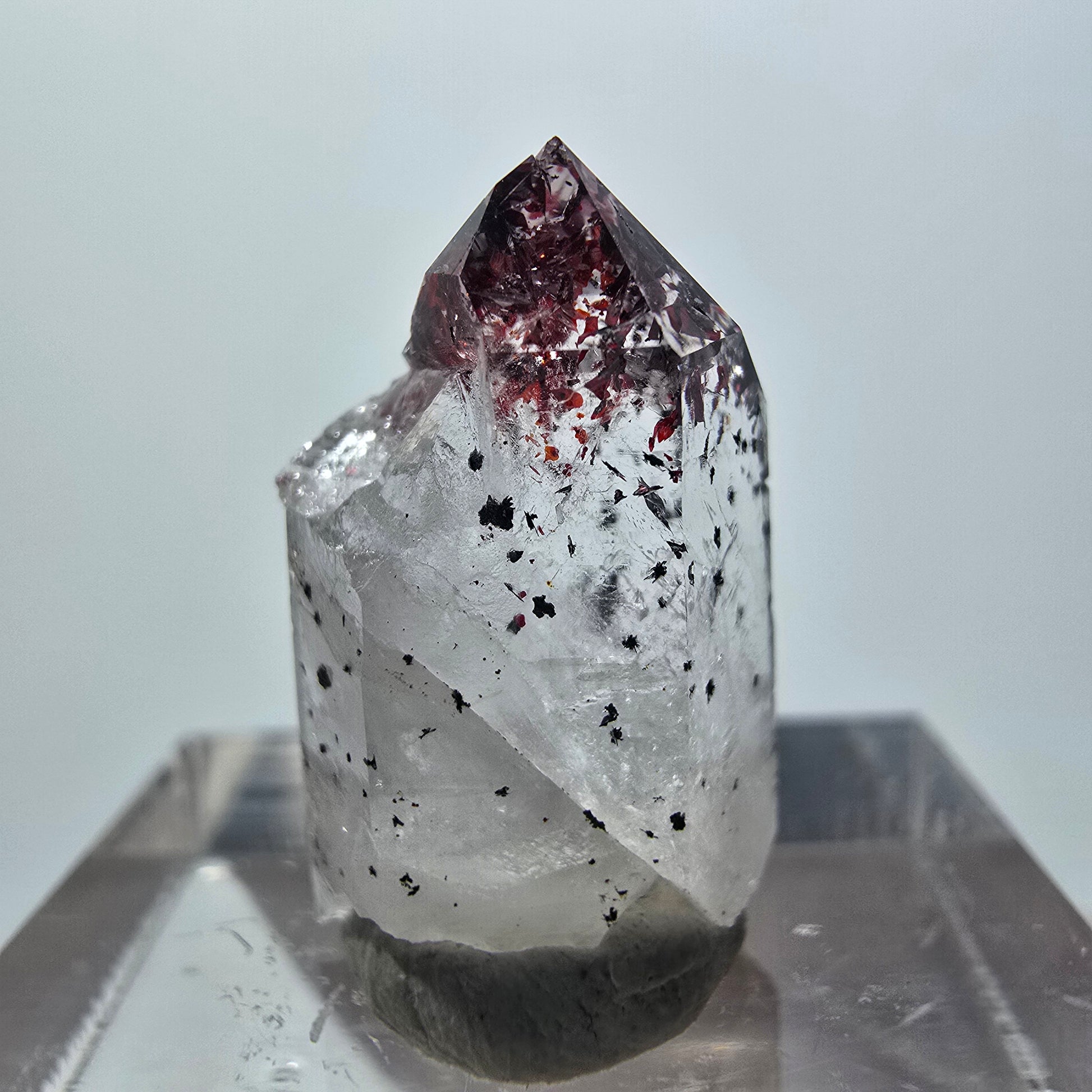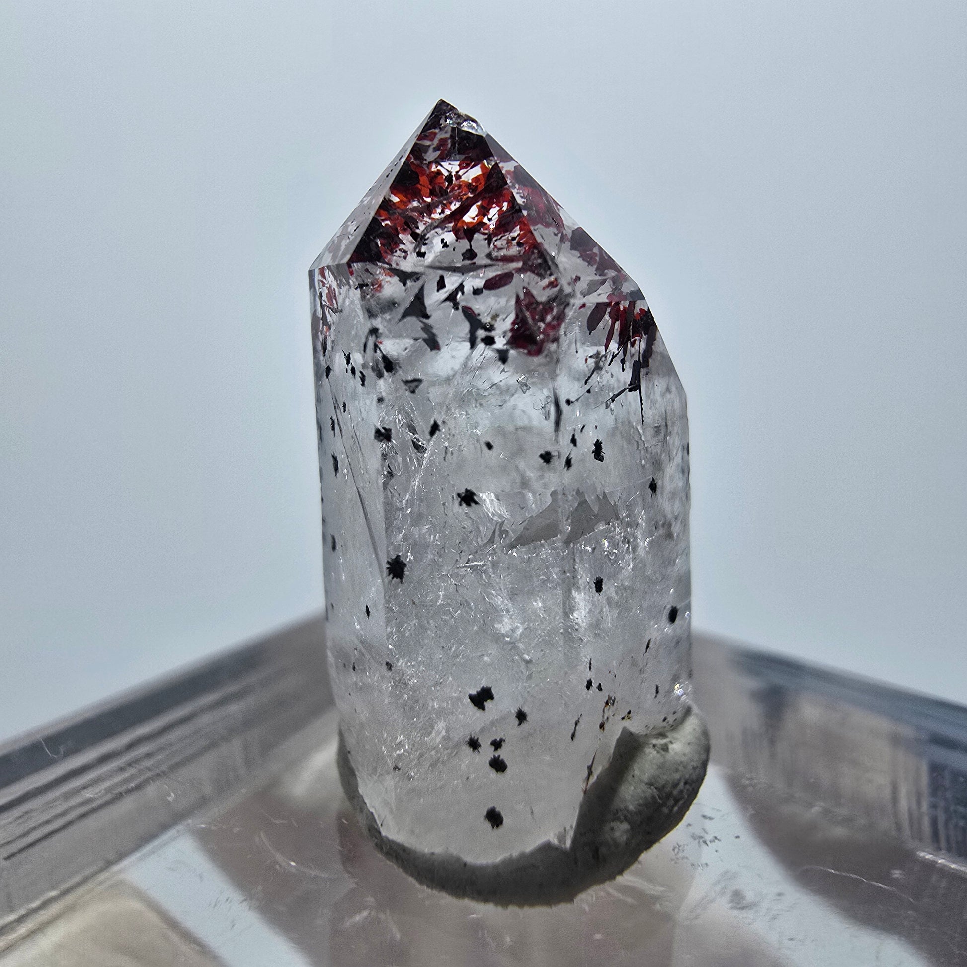 Harlekin Phantom Quarz Spitze aus der berühmten Streep Mine in Goboboseb, Namibia – ein faszinierendes Sammlerstück mit seltenen inneren Phantomen. Dieser transparente Kristall besticht durch wunderschöne Phantomstrukturen und charakteristische rote nadelförmige Hämatit-Einschlüsse, die ihm eine einzigartige Optik verleihen.
