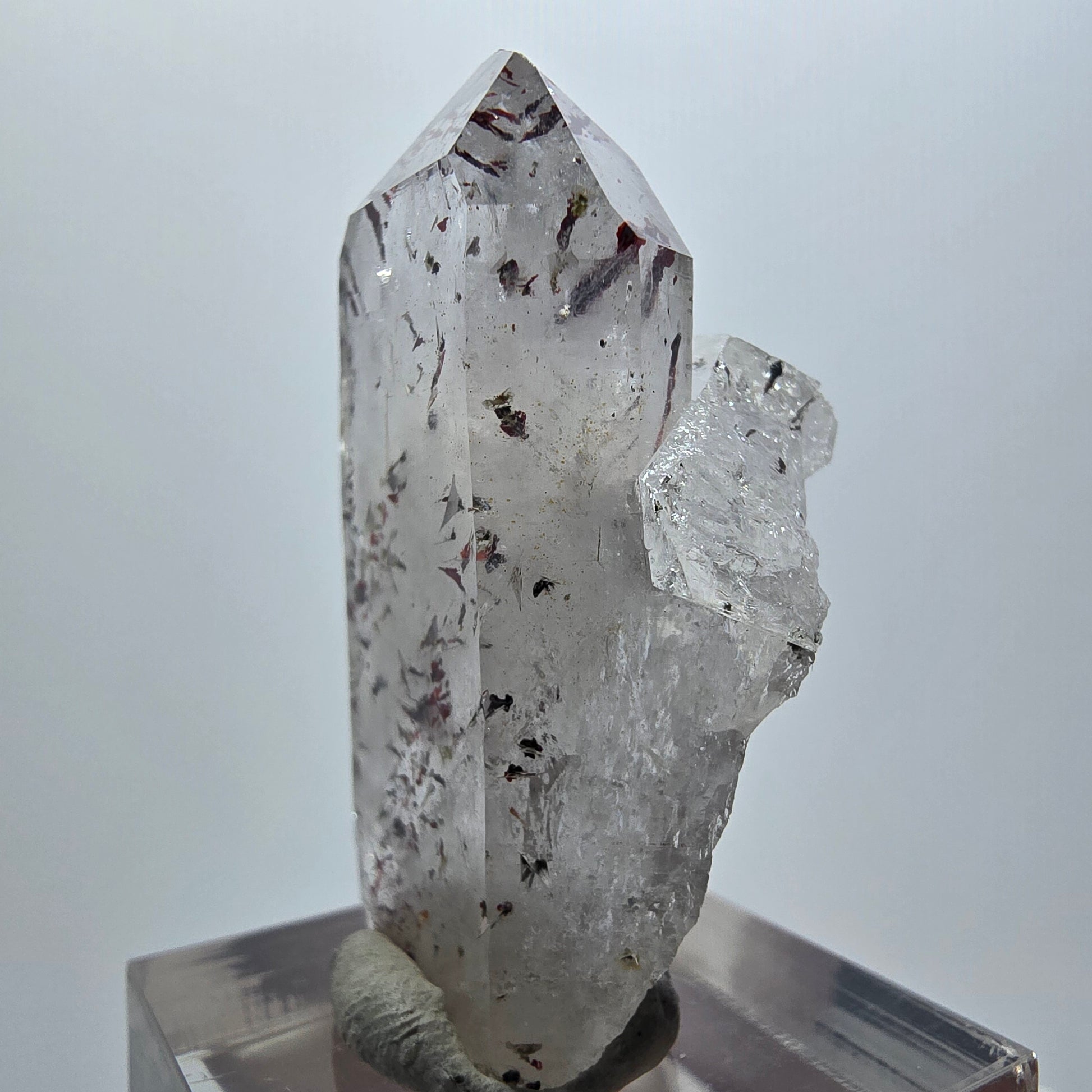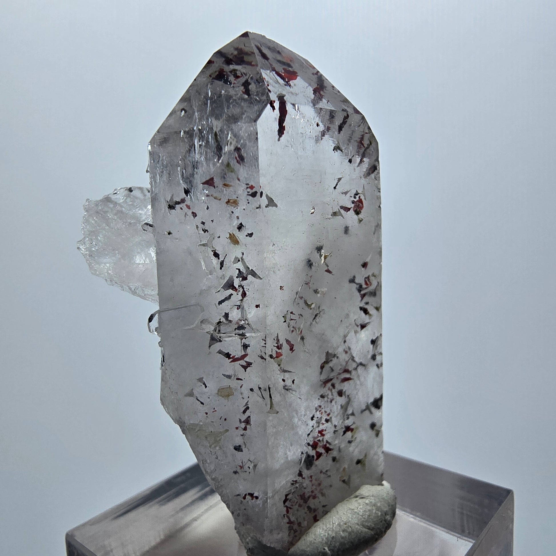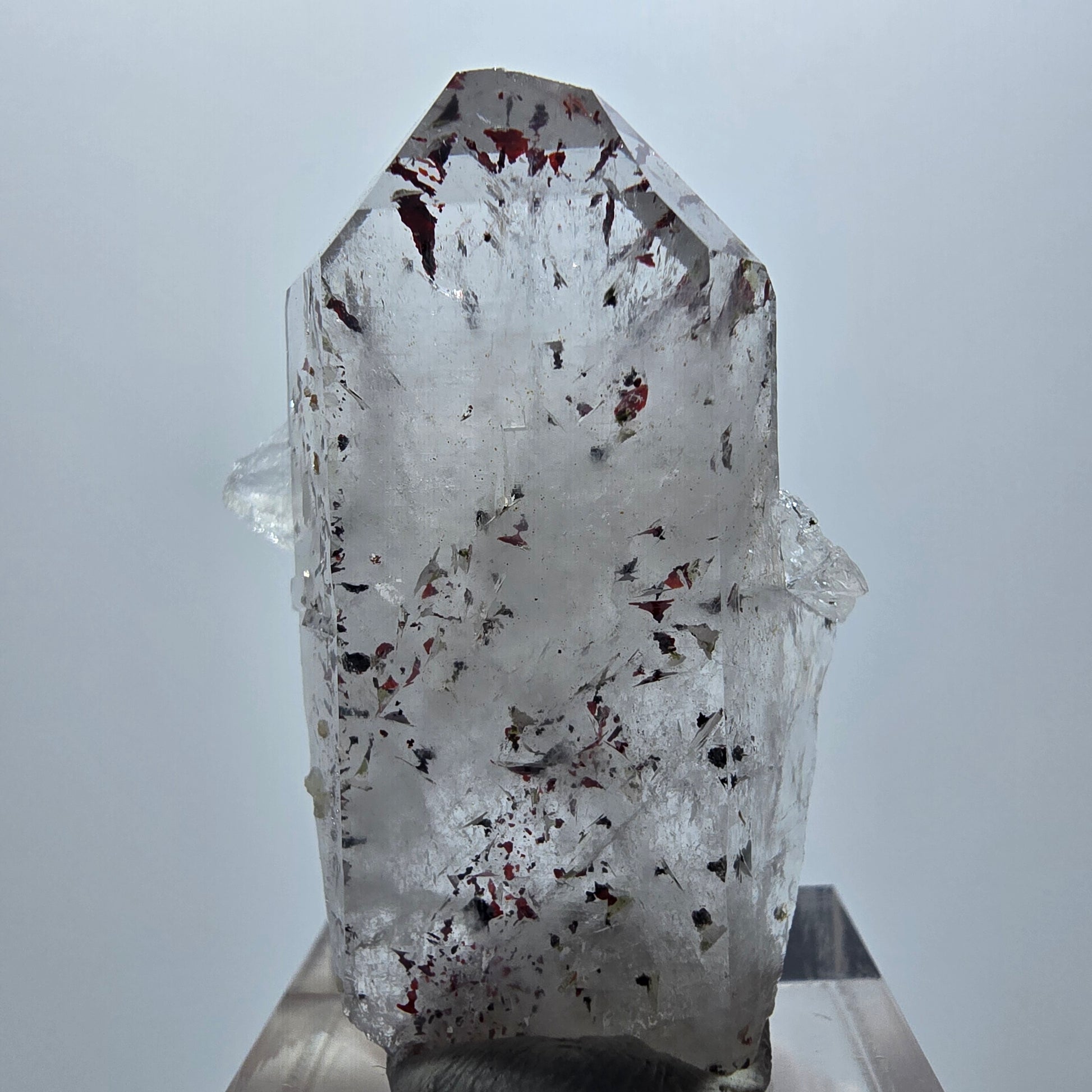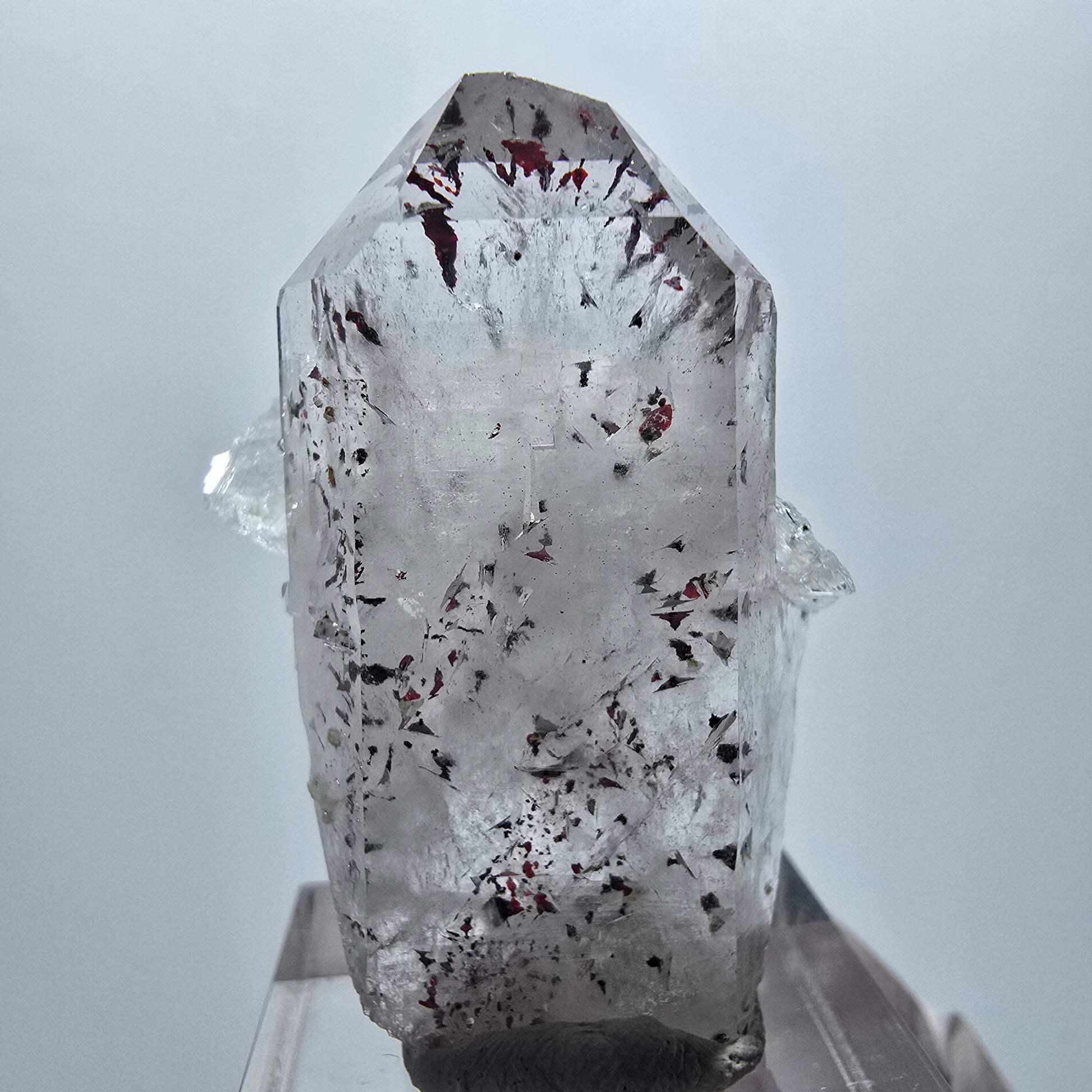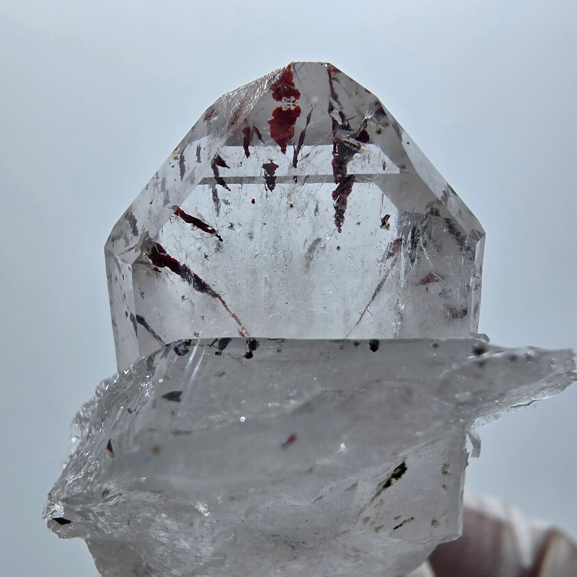 Entdecken Sie diese seltene Harlekin Phantom Quarz Spitze – eine klare, weiß-transparente Kristallspitze mit wunderschönen Phantomen im Inneren und roten nadelförmigen Hämatit-Einschlüssen. Aus der Streep Mine Goboboseb, Namibia stammend, misst sie 40*29*19 mm und wiegt 17 g.