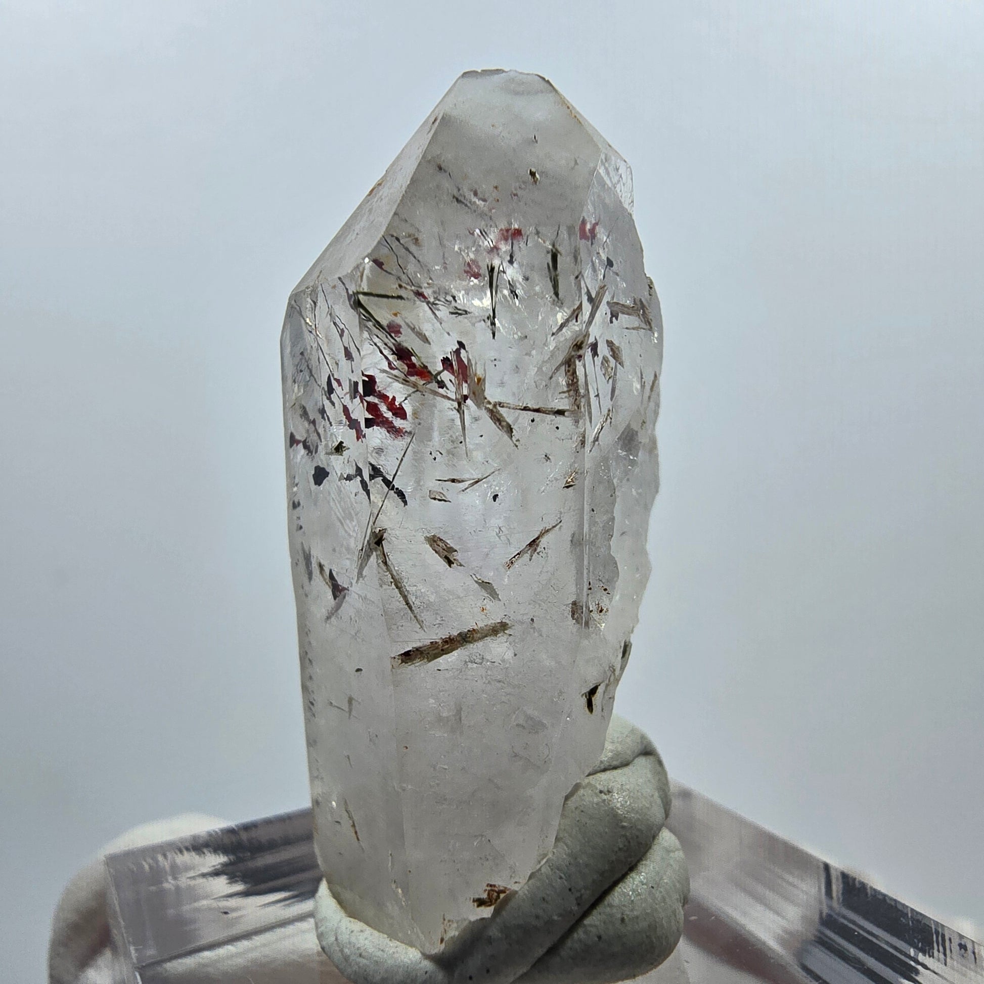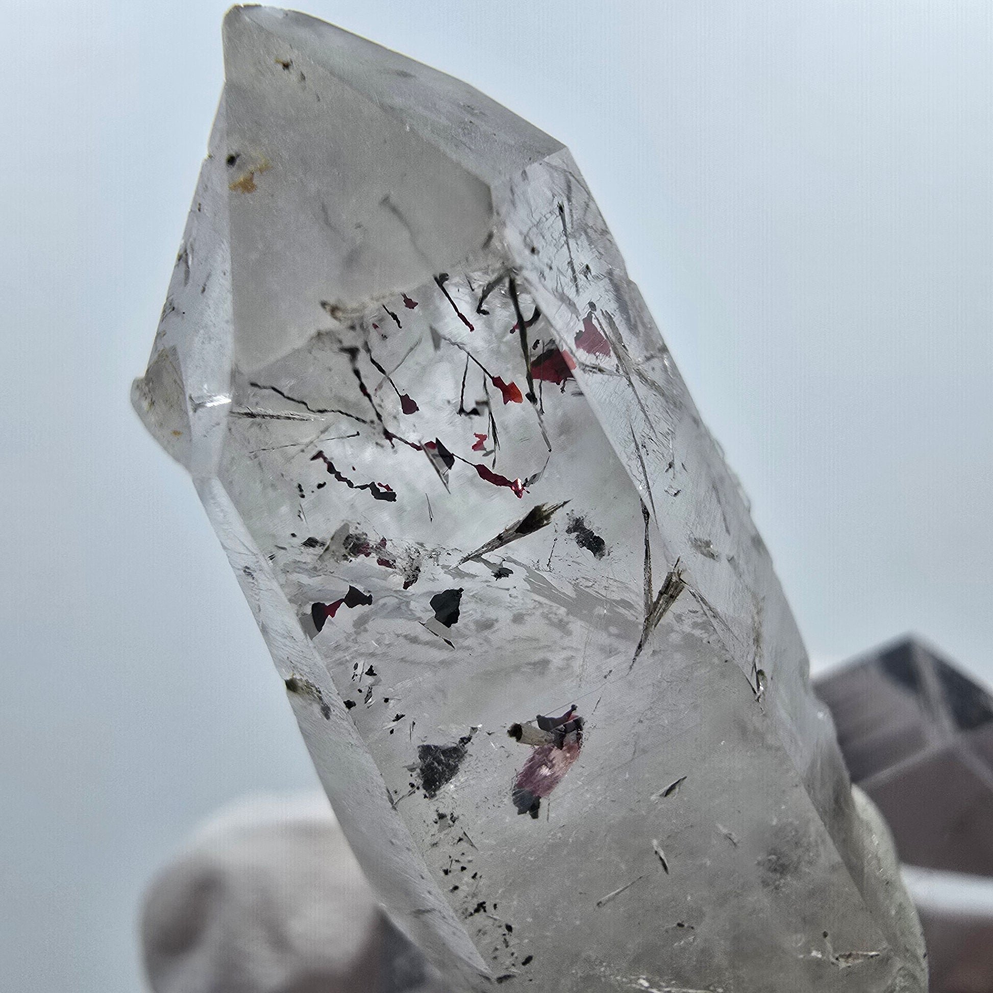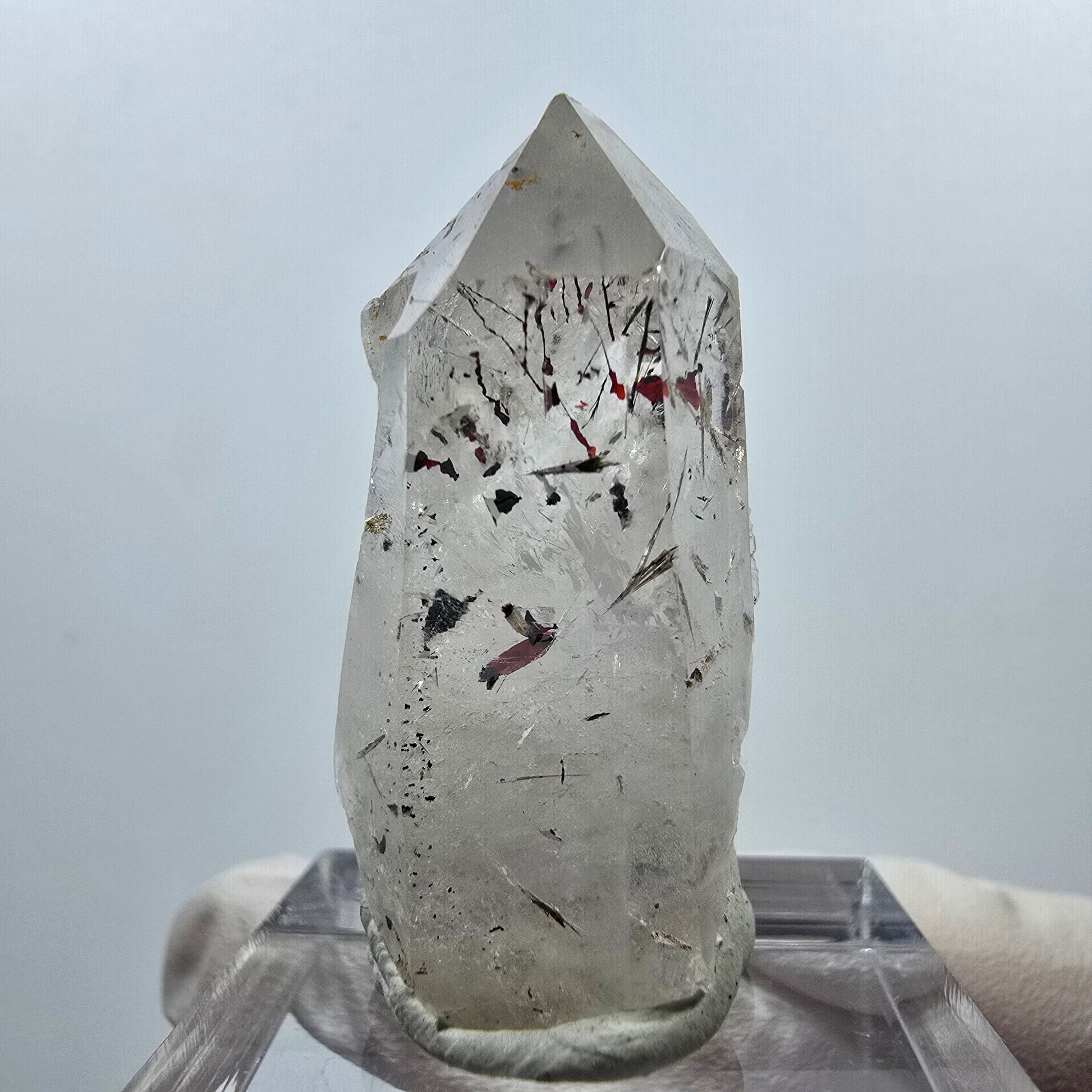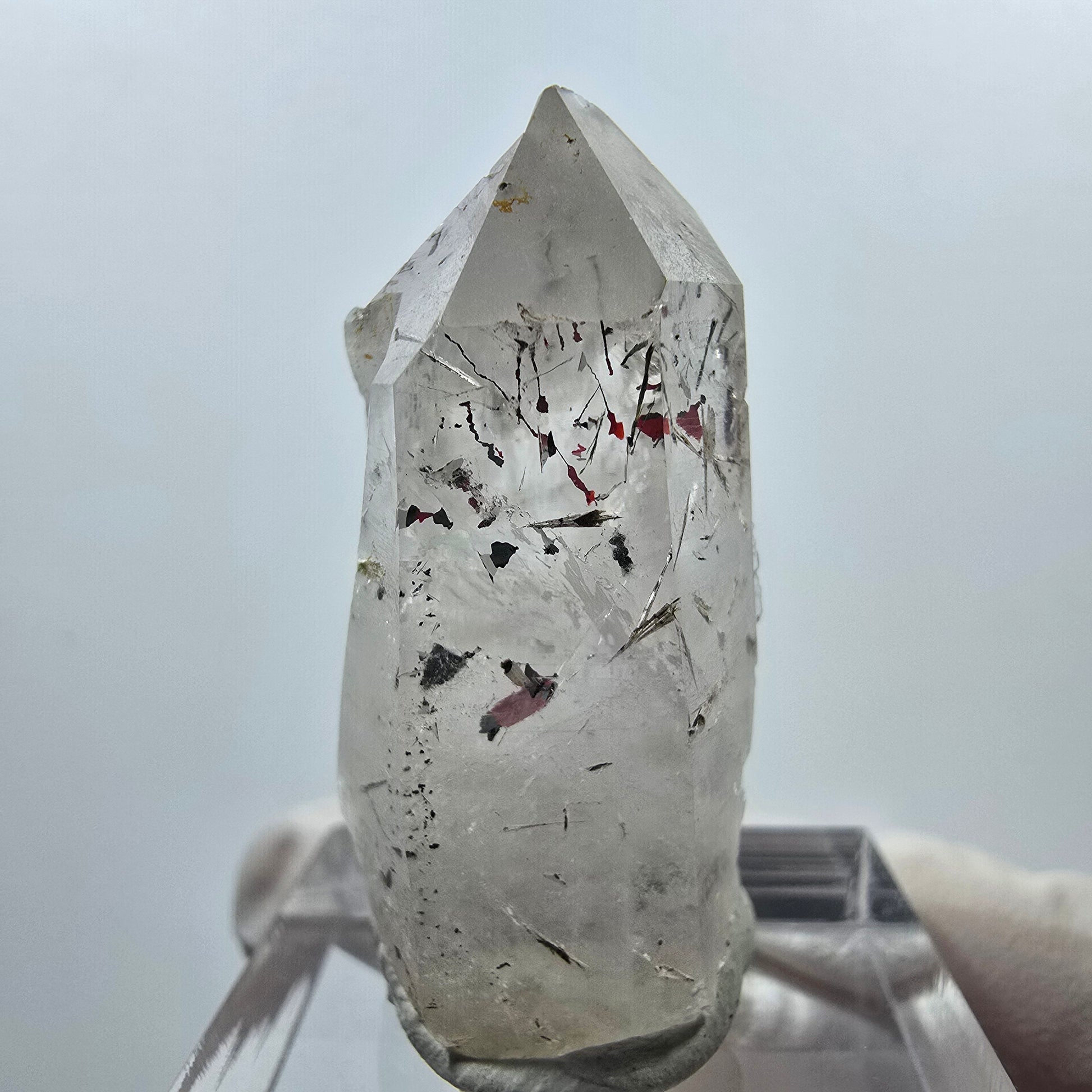 Diese seltene klare Quarzspitze mit dem Namen Harlekin stammt aus der Streep Mine in Goboboseb, Namibia. Der transparente Quarz zeigt eindrucksvolle rote und schwarze Hämatit- sowie grüne Epidot-Einschlüsse und ist an einigen Seiten mit typischen horizontalen Querrillen eines Lemurian Quarz versehen.