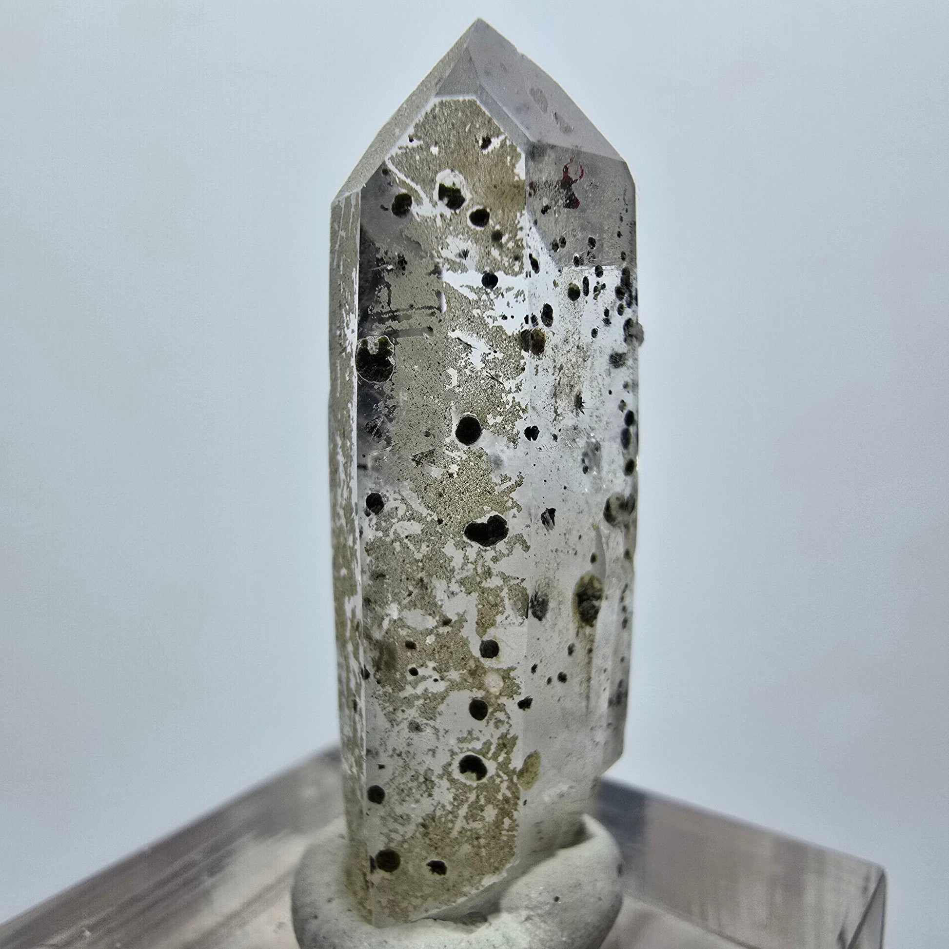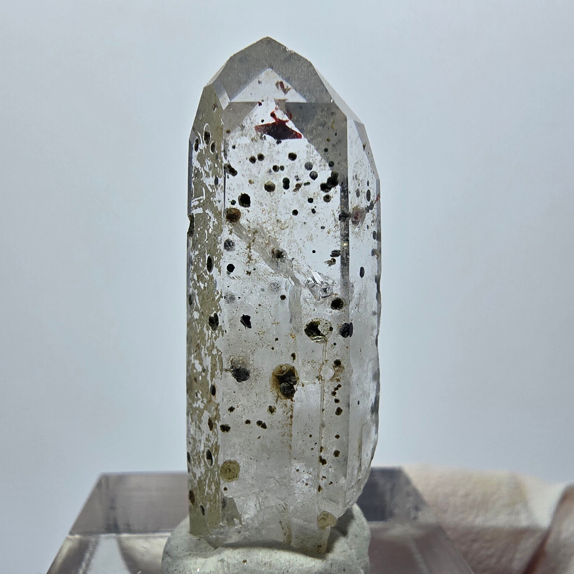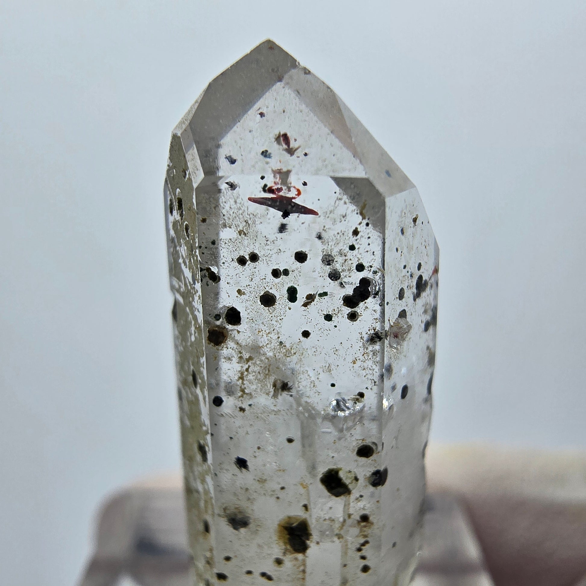 - Besonderheit: klare, weiß transparente Spitze mit roten und schwarzen Hämatit-Einschlüssen
