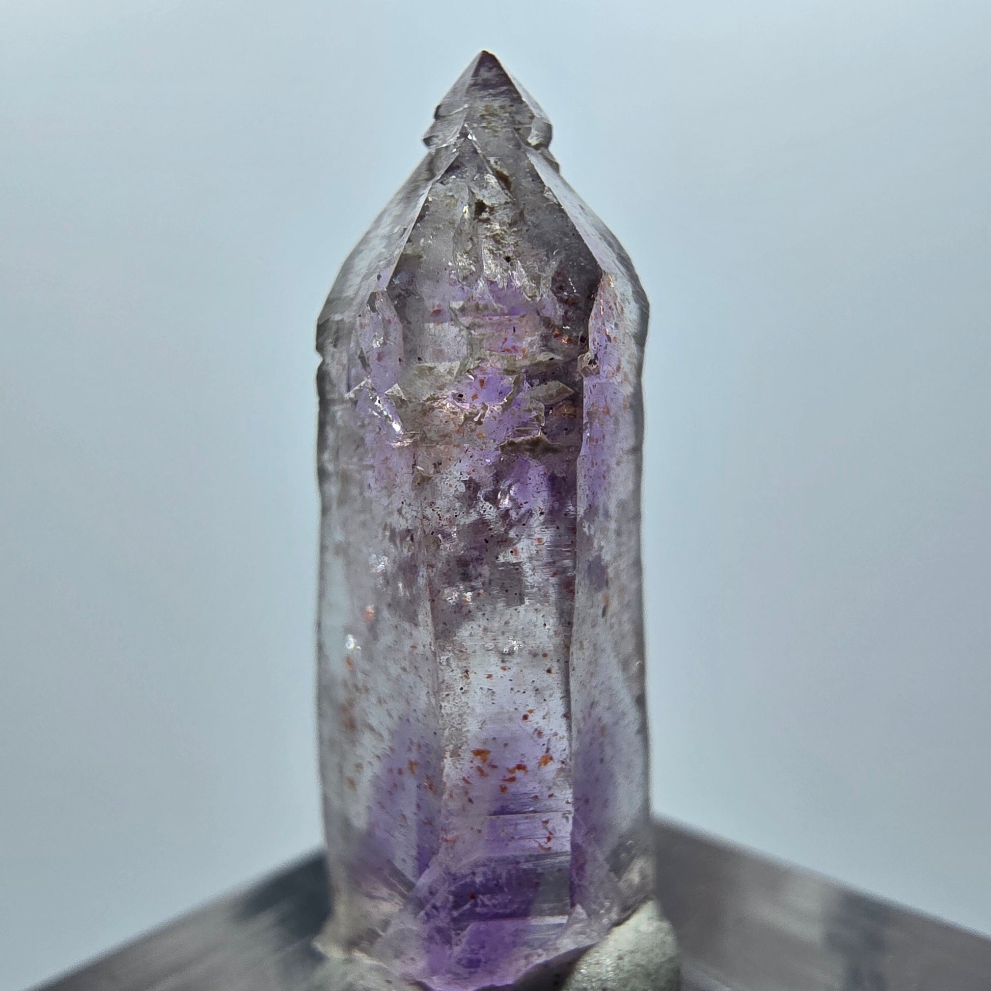 Diese klare Lemurian Phantom Amethyst Zepter Spitze ist ein seltener, zart lila-braun-weißer, transparenter Amethyst mit faszinierenden Phantomen im Inneren. Der Kristall zeigt die charakteristischen horizontalen Querrillen eines Lemurian Quarzes und besitzt eine elegante zepterförmige Kristallgestalt.