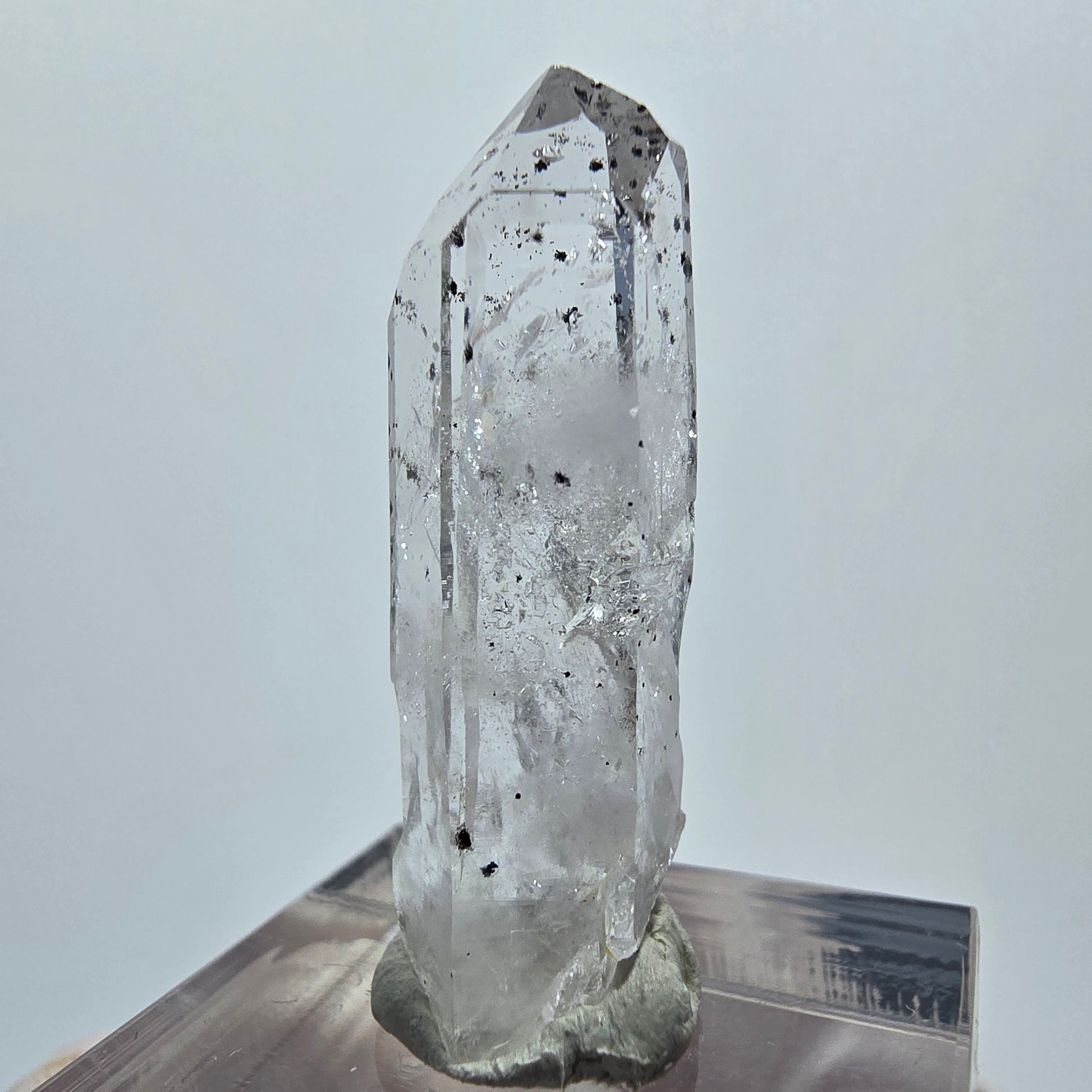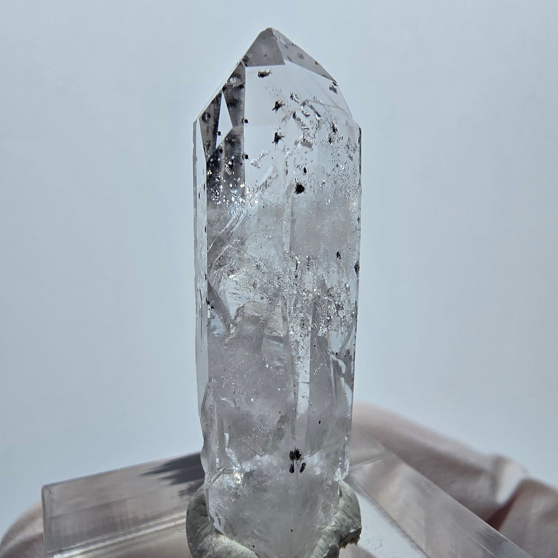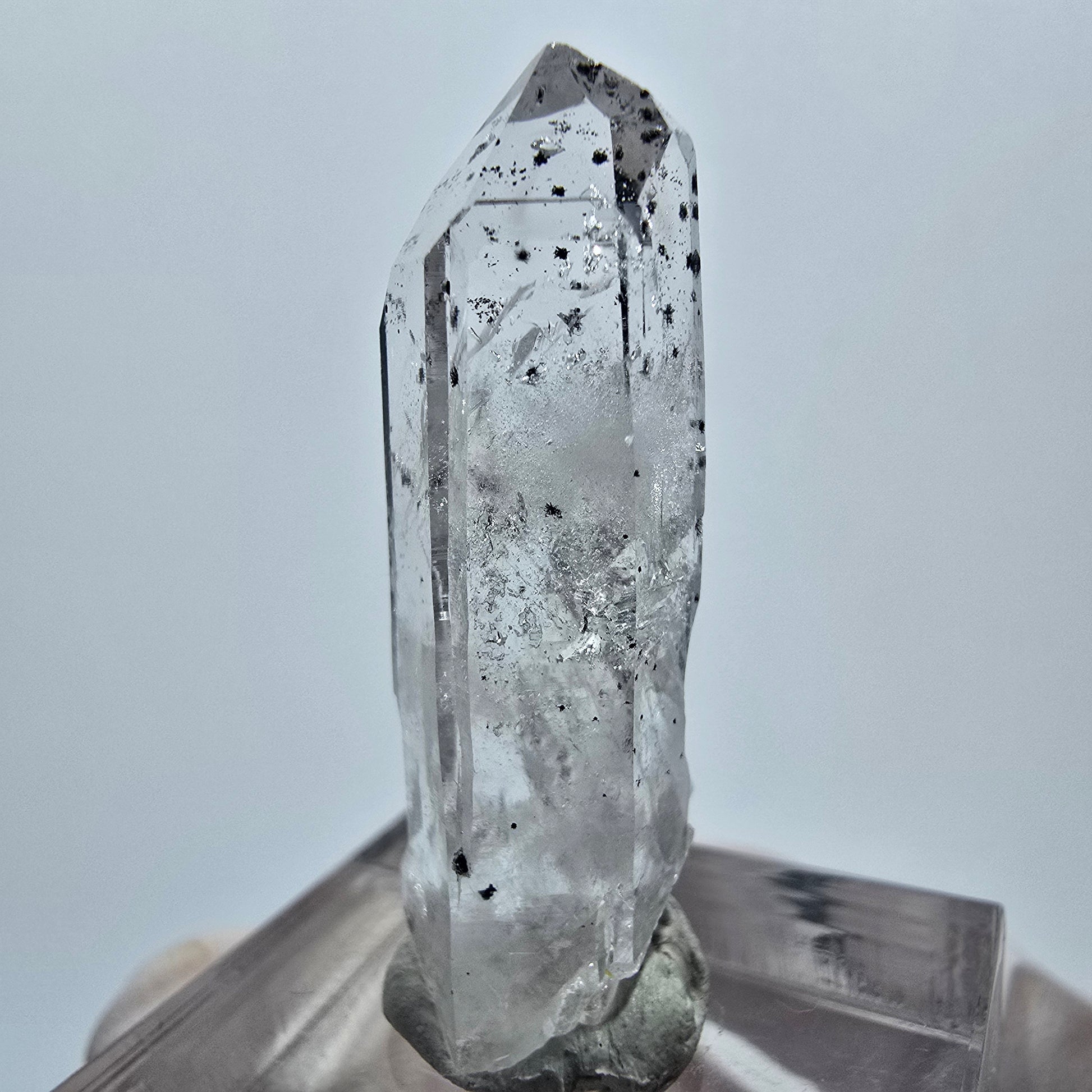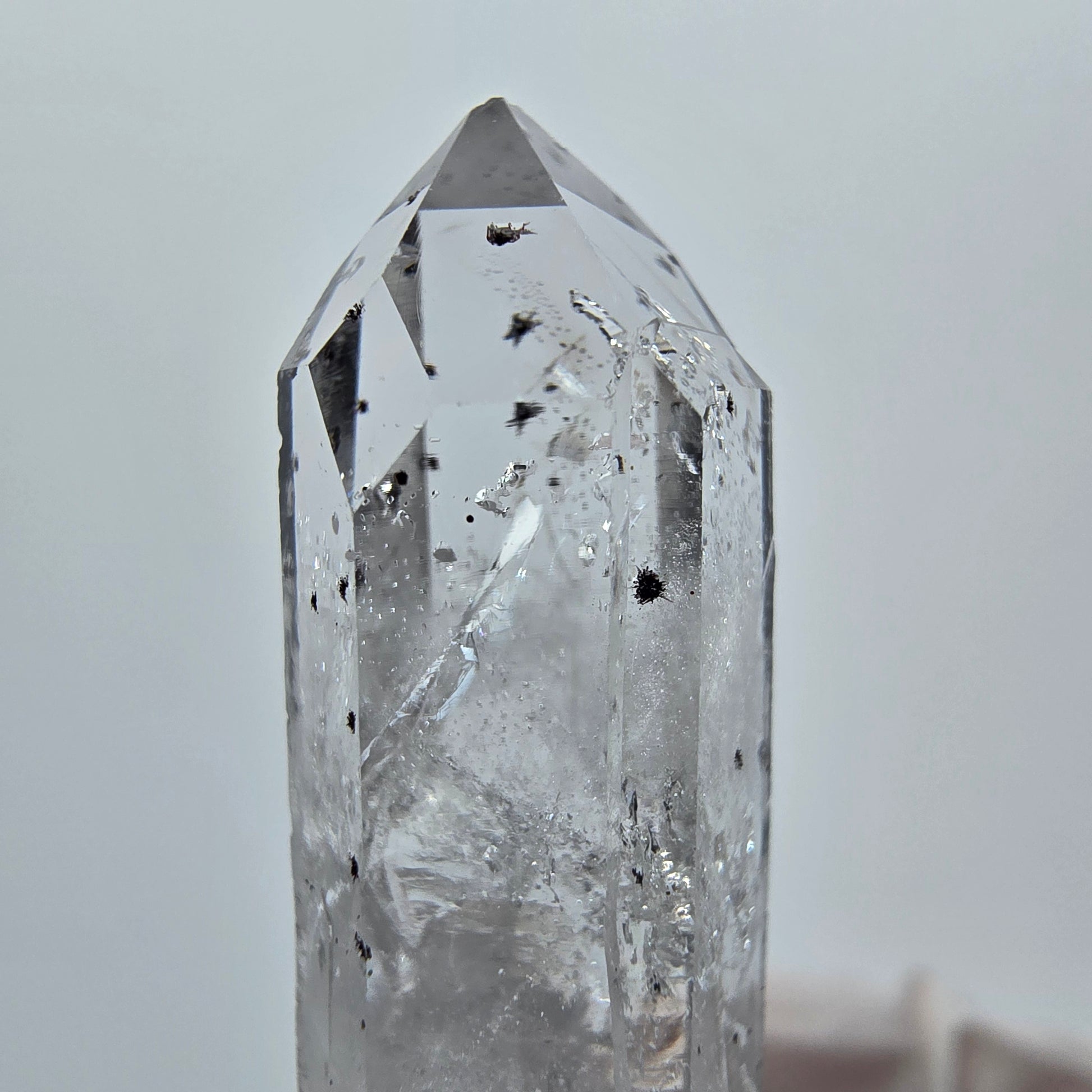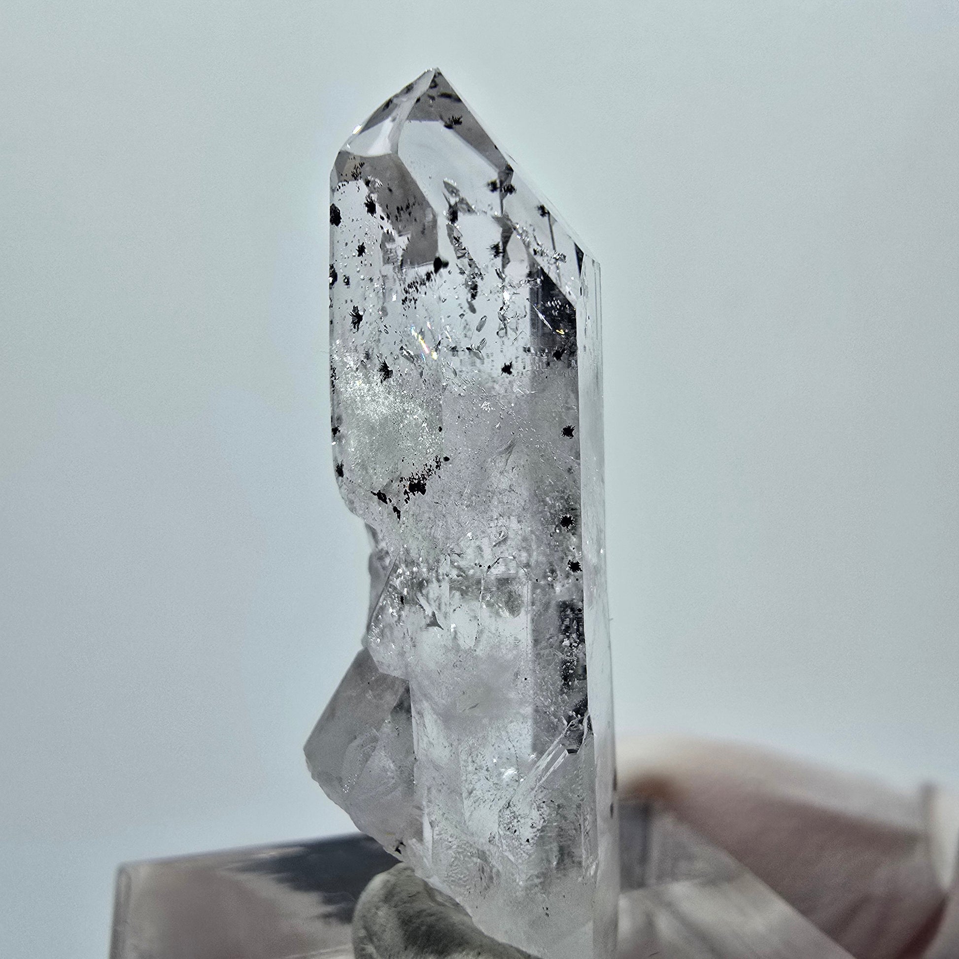 - Besonderheiten: Weiße, transparente Kristallspitze, sichtbare Phantome, schwarze Hämatit-Einschlüsse