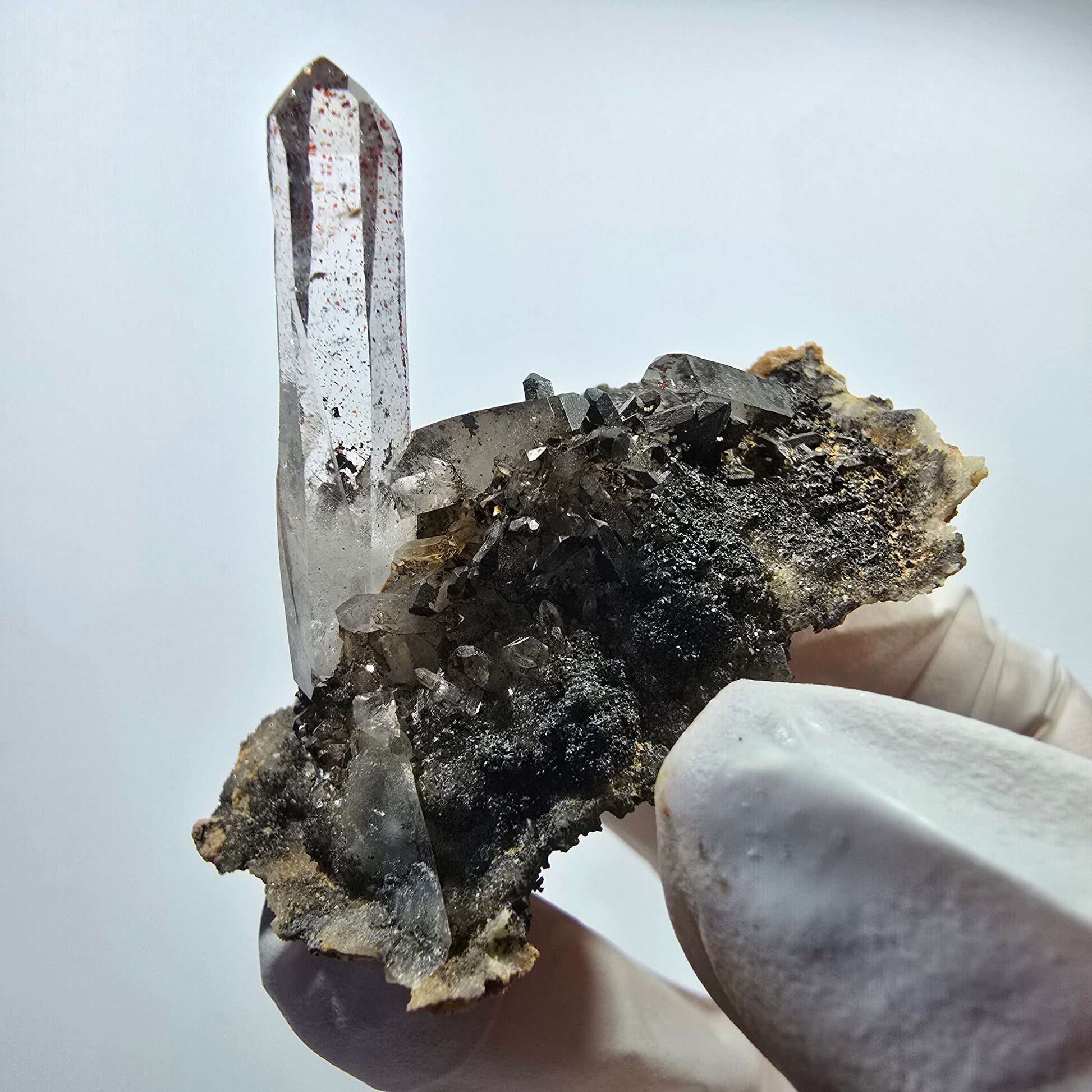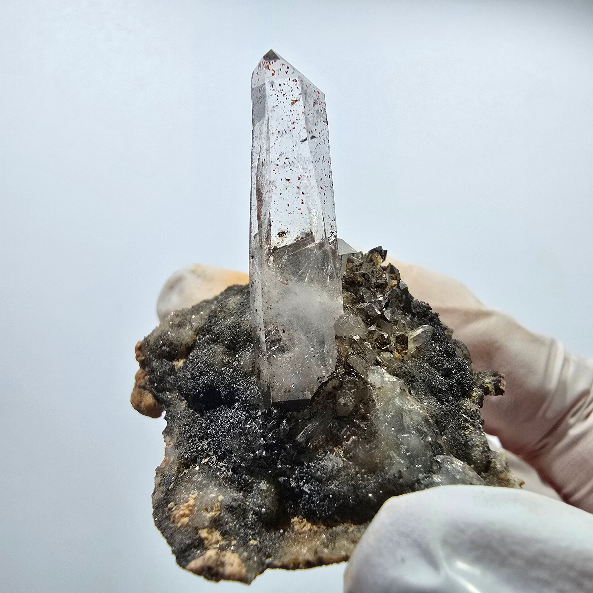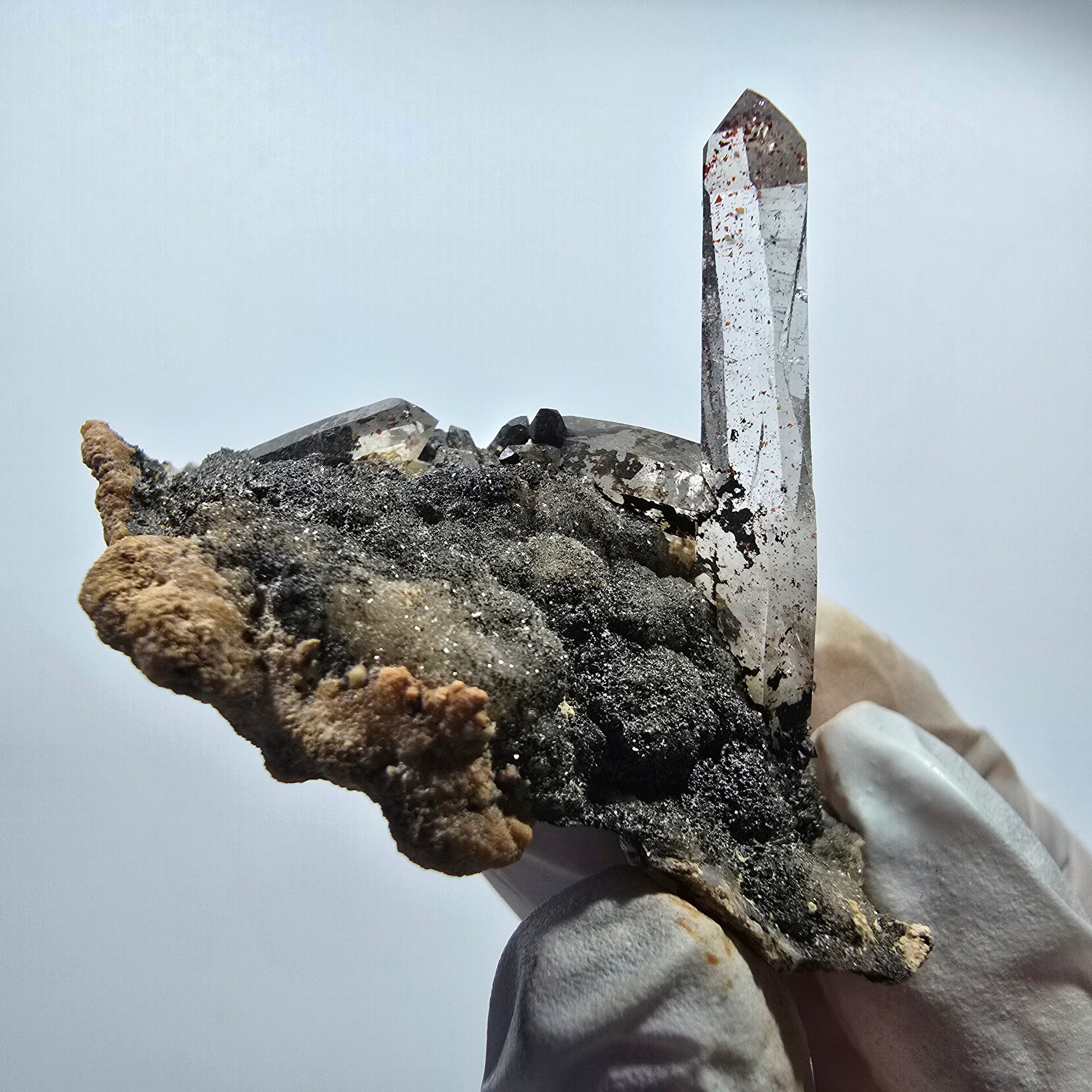 - Mineral: Rauchquarz mit Hämatit-Einschlüssen auf Matrix