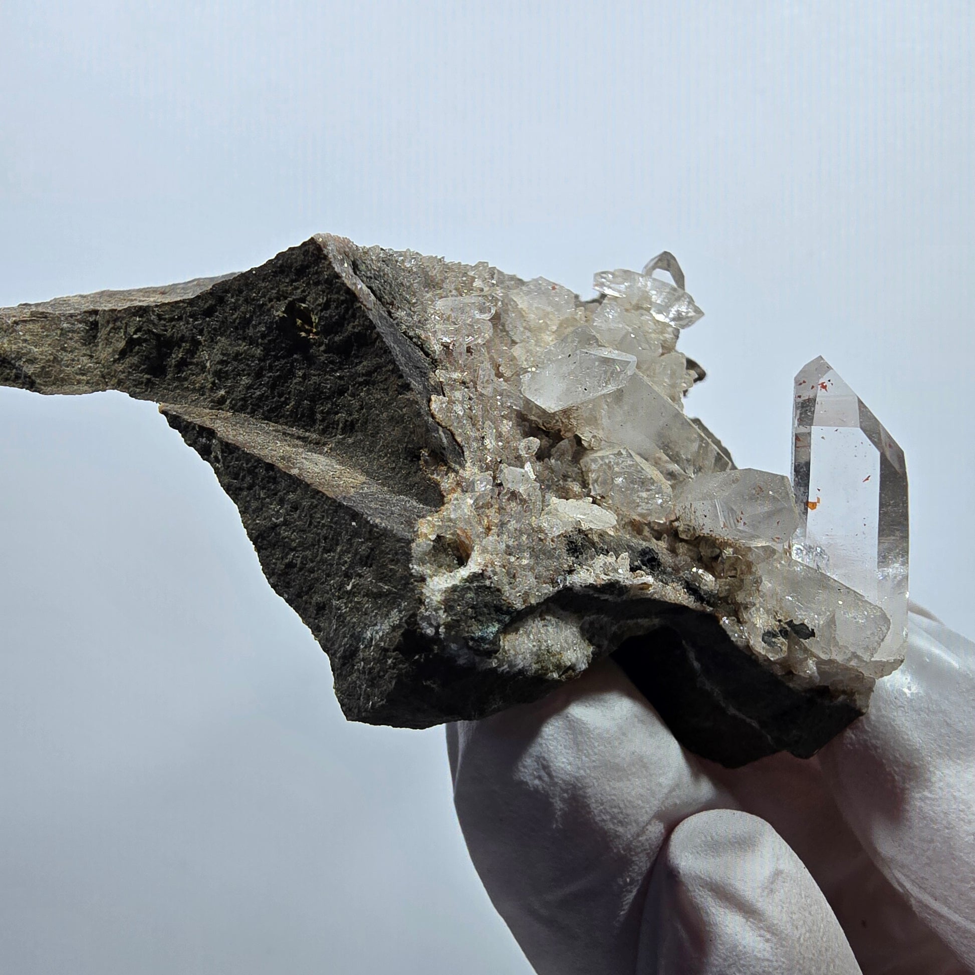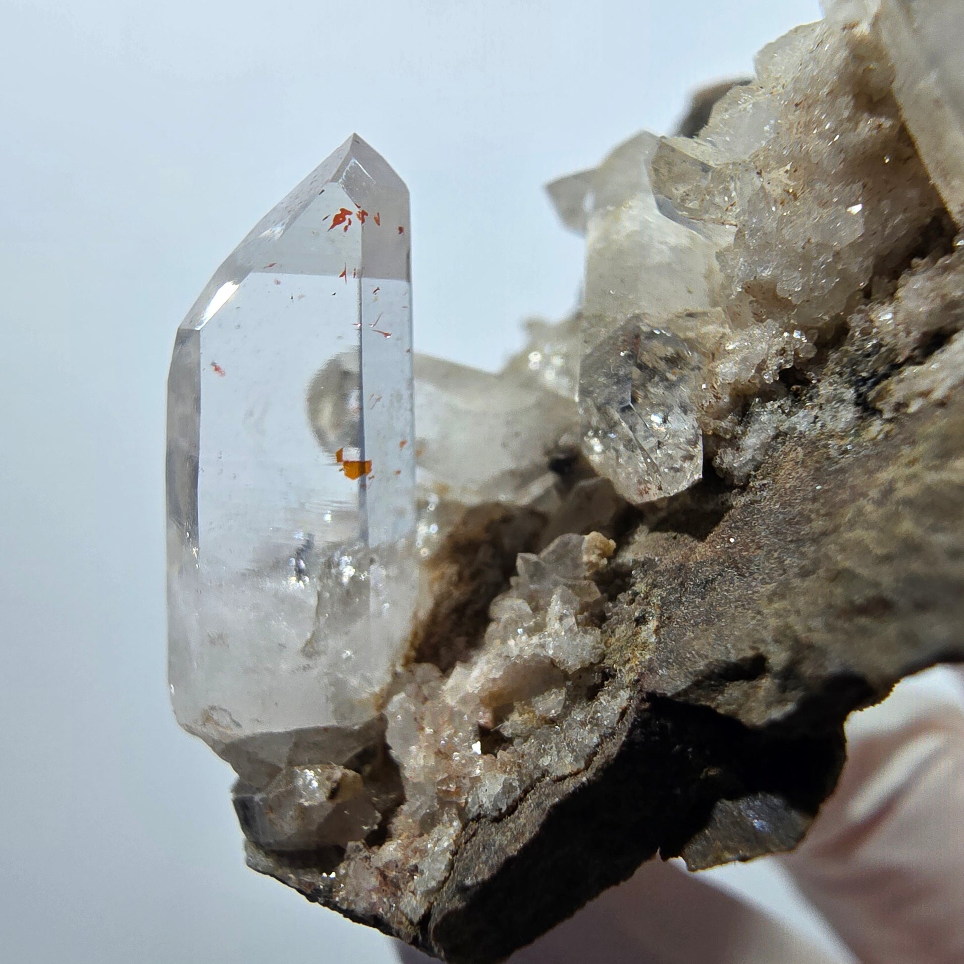 - Besonderheiten: Kristallklare Spitzen mit Phantomen und roten Hämatit-Kristallen
