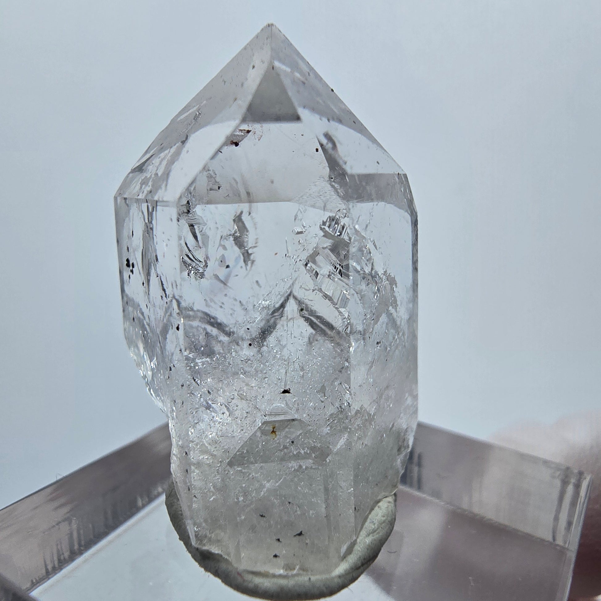 Sie erhalten eine seltene, klare Quarzspitze mit markanten schwarzen Hämatit-Einschlüssen aus der berühmten Streep Mine in Goboboseb, Namibia. Diese hochwertige Kristallspitze besticht durch ihre Transparenz und einzigartige Mineralverbindung.