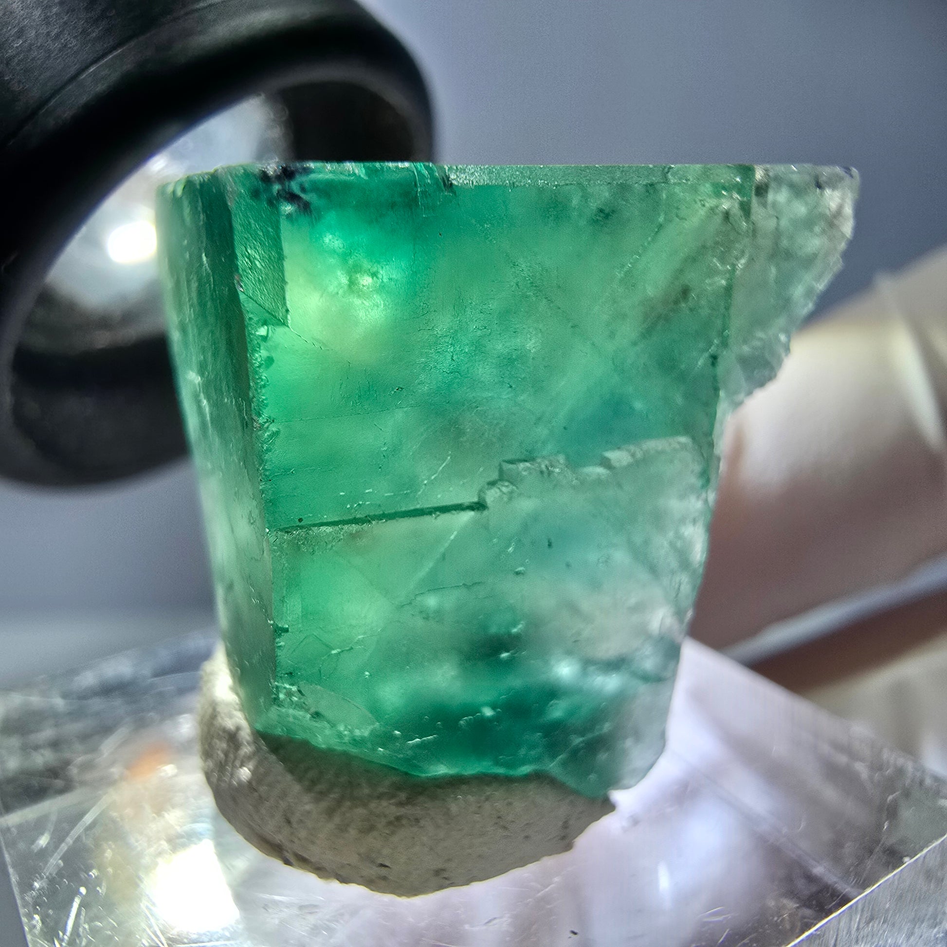 Entdecken Sie die faszinierenden Eigenschaften des Klaren Phantom Fluorit Würfels. Dieser beeindruckende Kristall besticht durch seine grüne, transparente Farbe und die einzigartige kubische Form. Die parkettierte Oberfläche ermöglicht eine außergewöhnliche Haptik und Optik, und die schönen Phantome im Inneren geben ihm einen geheimnisvollen, magischen Charakter.