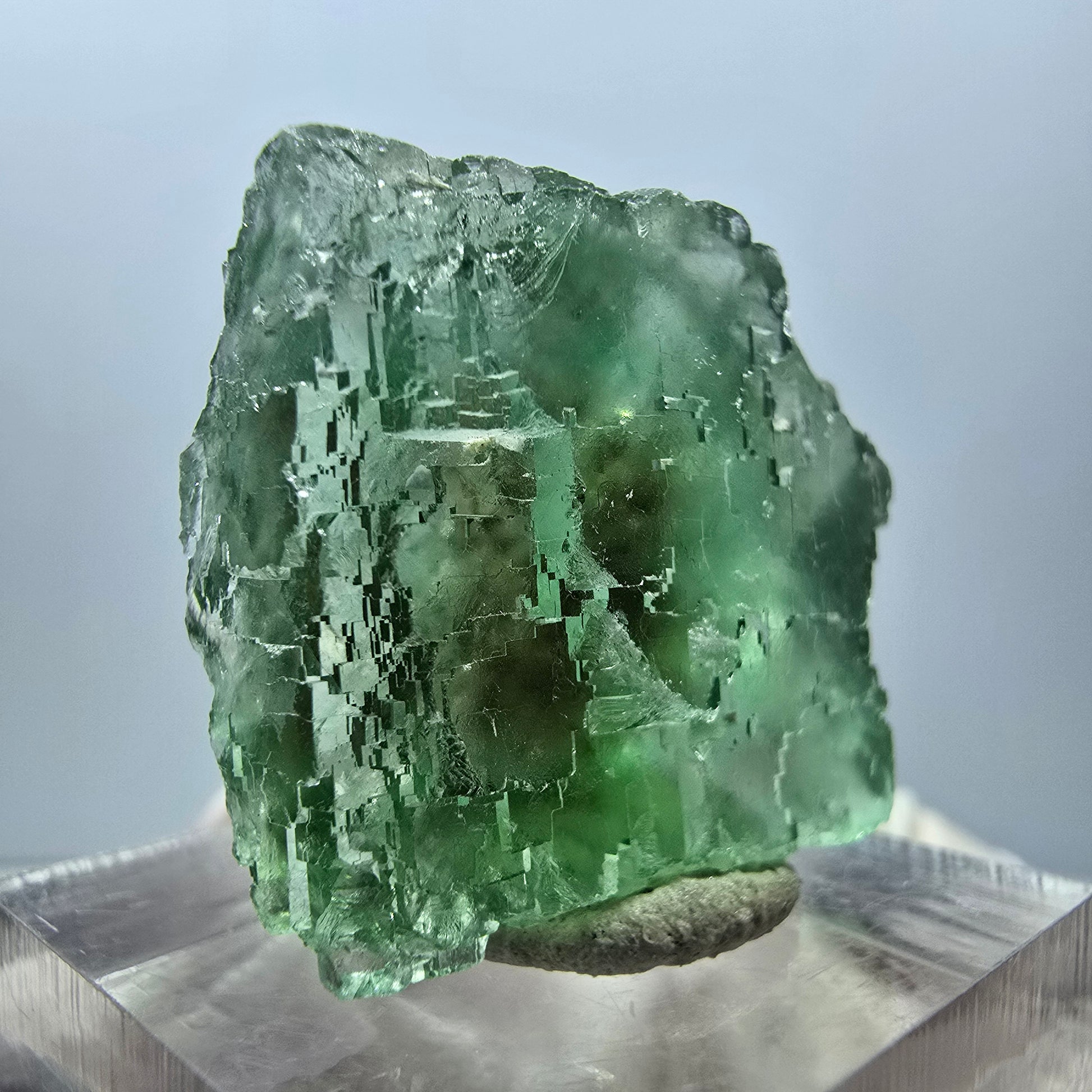 Entdecken Sie die faszinierende Schönheit unseres klaren Phantom Fluorit Würfels, der in einem prächtigen Grün leuchtet. Dieser einzigartige Kristall besticht durch seine kubische Form und die exquisit parkettierte Oberfläche, die die inneren Phantome hervorhebt. Die Transparenz des Fluorits lässt das Licht wunderbar reflektieren und zieht das Auge an.