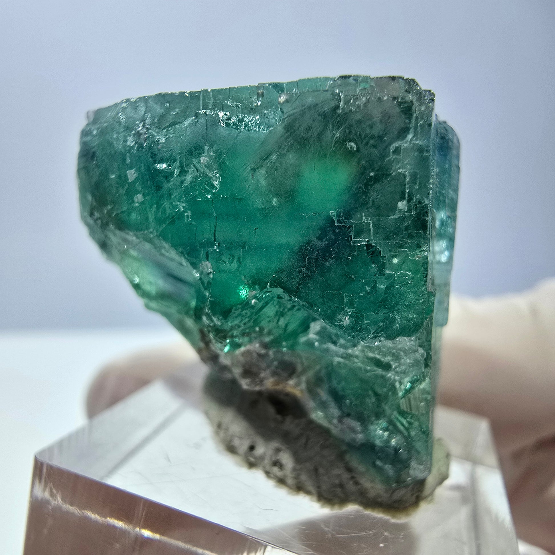 Entdecken Sie diesen faszinierenden klaren grünen Phantom Fluorit Würfel, der durch seine eindrucksvolle kubische Kristallform und die parkettierte Oberfläche besticht. Mit seinen schönen Phantomen im Inneren zieht dieser Kristall die Blicke auf sich und bringt ein Gefühl von Klarheit und Harmonie in jeden Raum.
