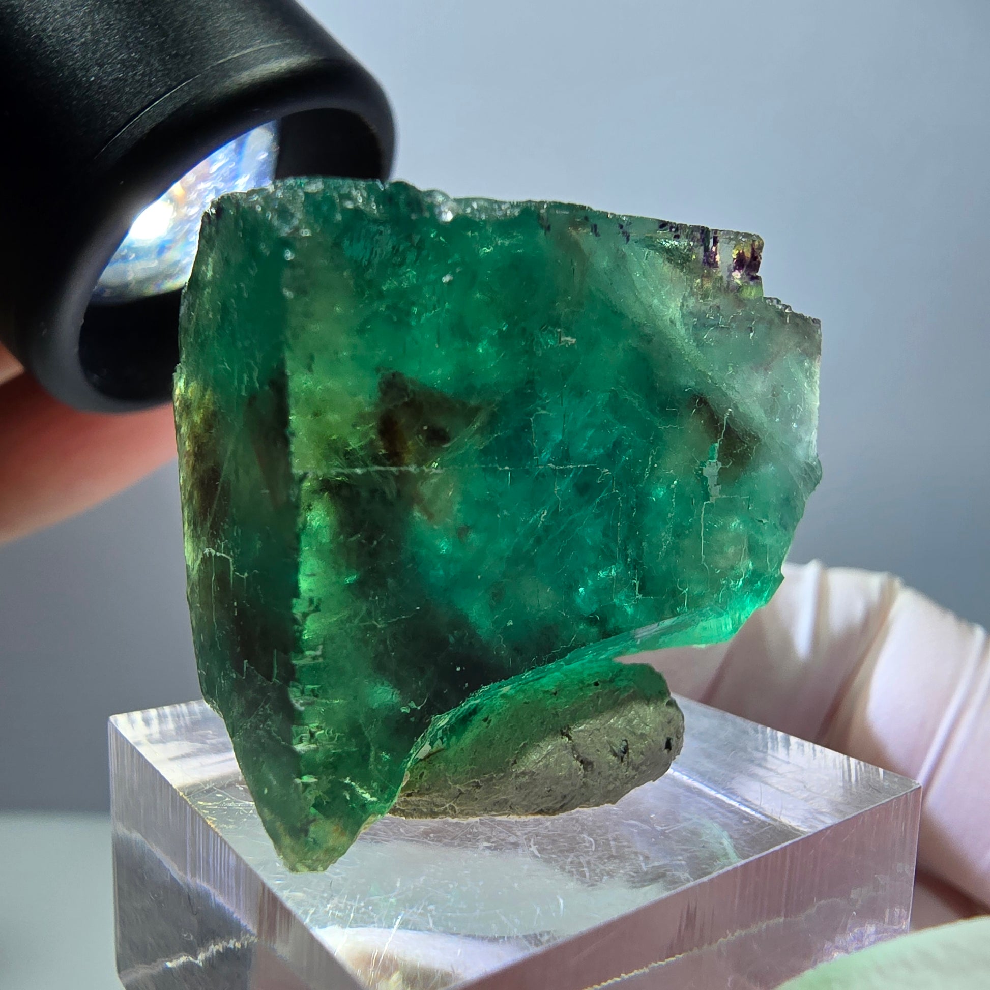 Entdecken Sie unseren klaren, grünen und transparenten Phantom Fluorit Würfel mit einzigartiger kubischer Kristallform. Dieser exquisite Kristall zeigt eine wunderschöne, parkettierte Oberfläche und enthält beeindruckende Phantome im Inneren, die ihn zu einem wahren Schatz für Sammler machen.