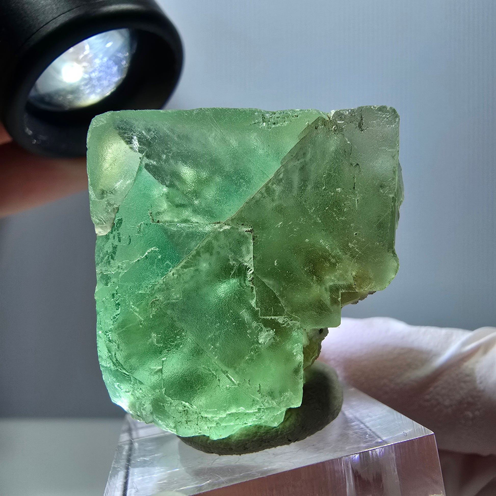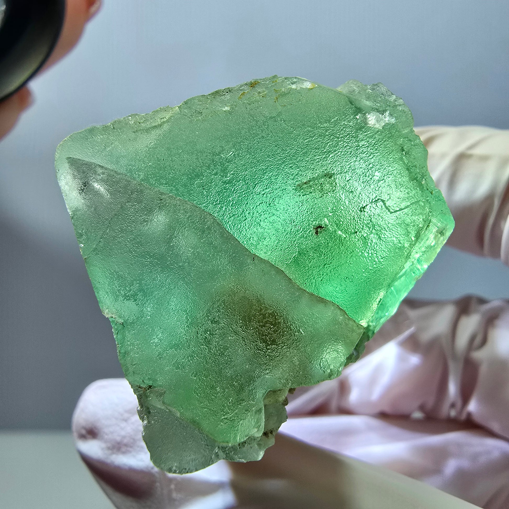 Entdecken Sie die außergewöhnliche Schönheit unseres klaren, grünen Phantom Fluorit Würfels. Dieser beeindruckende Kristall weist eine kubische Form auf und ist mit einer sorgfältig parkettierten Oberfläche versehen, die seine faszinierenden, transparenten Eigenschaften zur Geltung bringt. Im Inneren des Würfels befinden sich wunderschöne Phantome, die jeden Liebhaber von Mineralien begeistern werden.