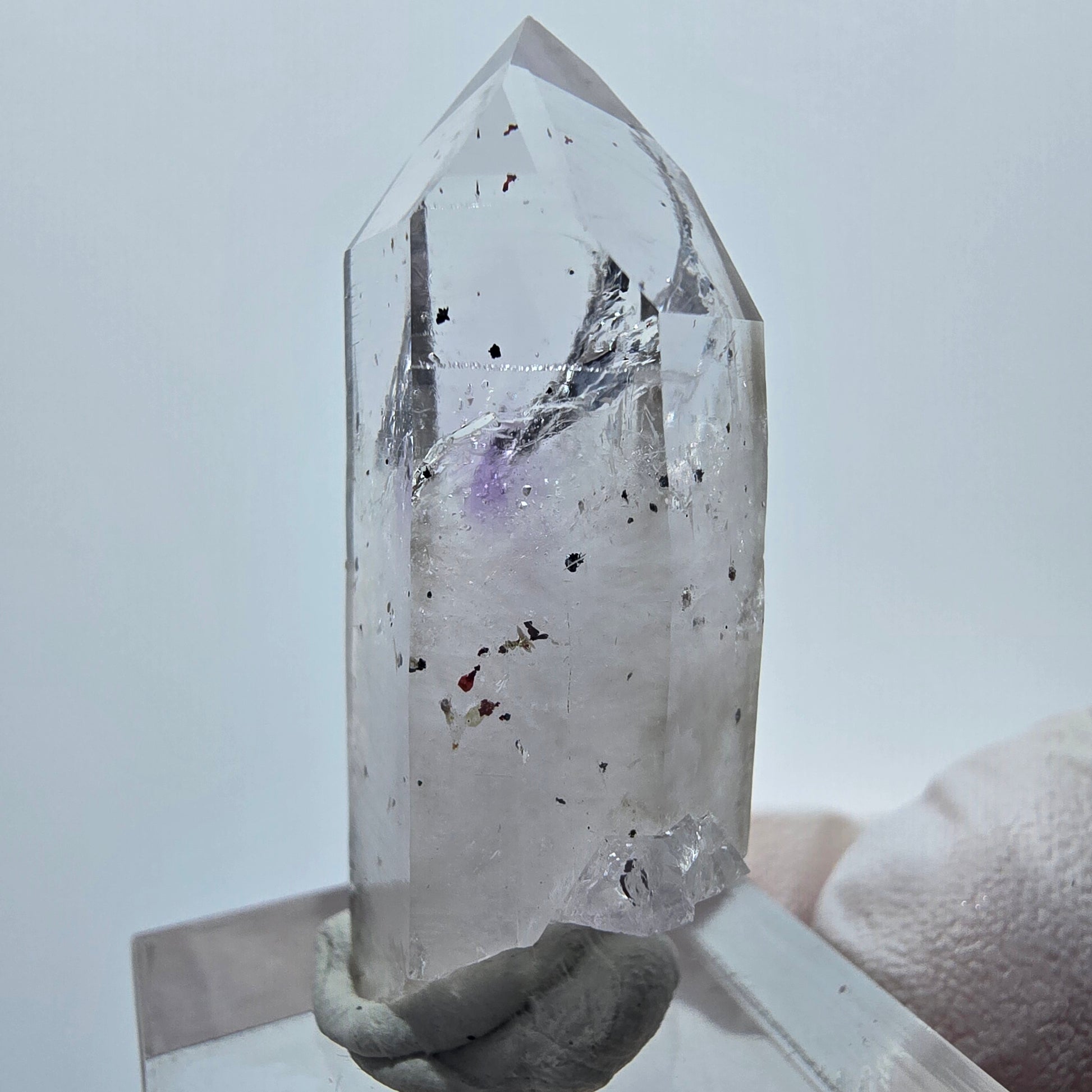 Diese seltene Lemurian Phantom Amethyst Hämatit Spitze aus der Streep Mine in Goboboseb, Namibia, besticht durch ihre klare lila-weiße Transparenz und exquisite Phantom-Strukturen im Inneren. Die schwarzen Hämatit-Einschlüsse und die charakteristischen horizontalen Querrillen an der Oberfläche machen diesen 39 x 20 x 14 mm großen, 14 g schweren Kristall zu einem einzigartigen Sammlerstück.